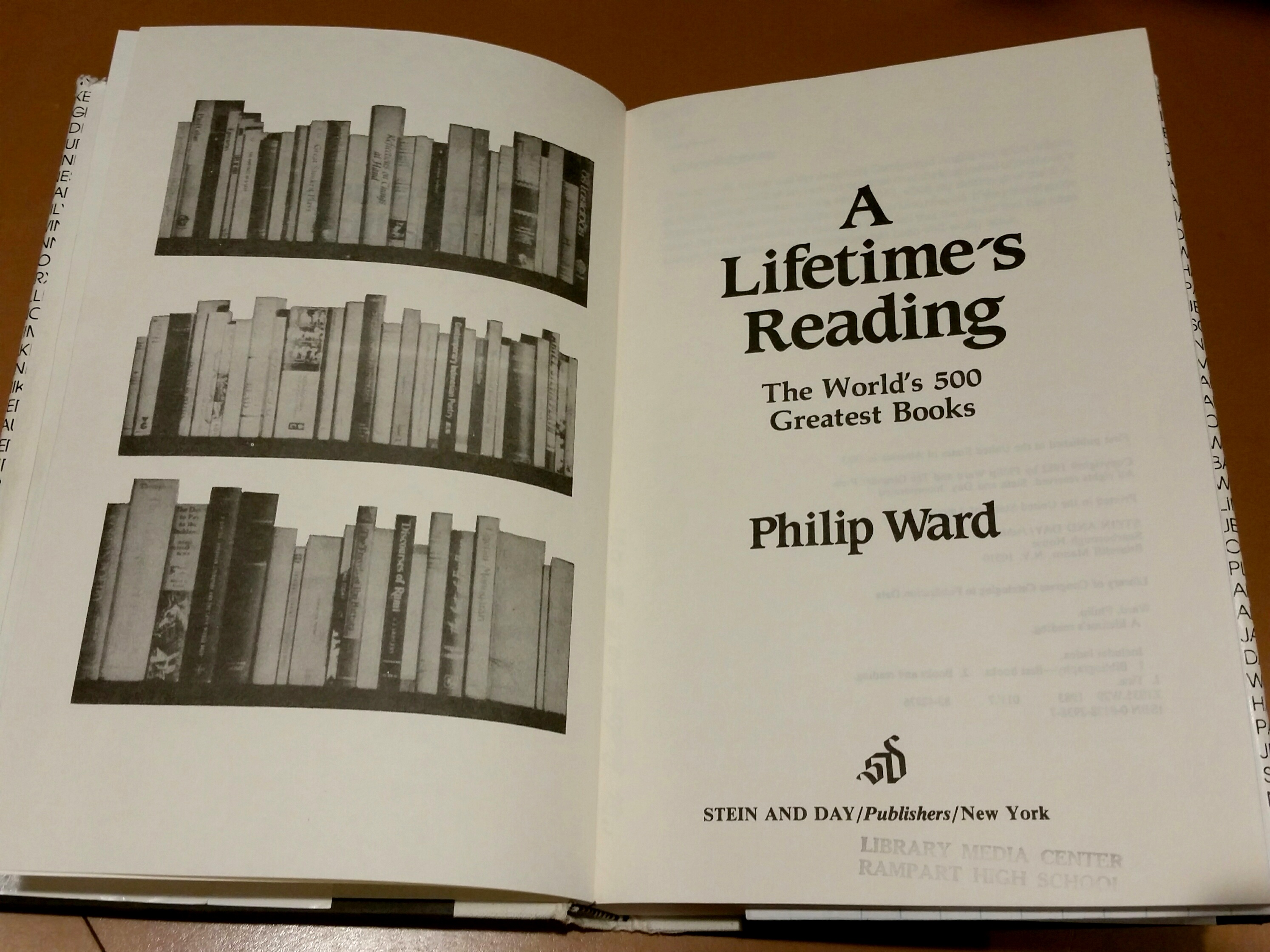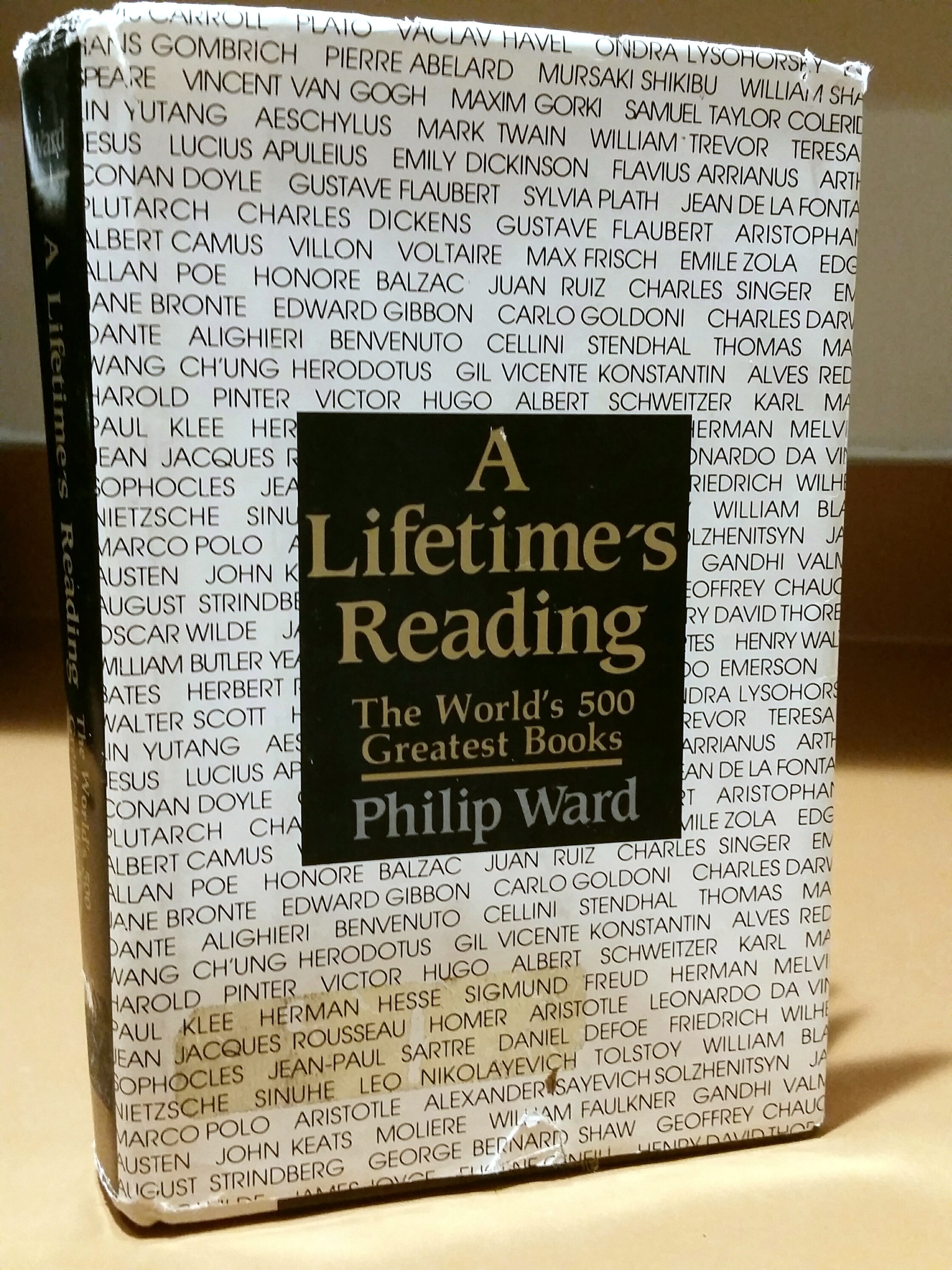 Philip Ward, A Lifetime’s Reading: The World’s 500 Greatest Books (New York: Stein and Day, 1983). Oddly, the title text has rejected Caxton’s usual apostrophe in favor of something resembling a diacritical mark. Subtitle in Palatino Bold, inside a square black panel centered against a carpet of author names in Avant Garde, with interior text set in Times New Roman.
