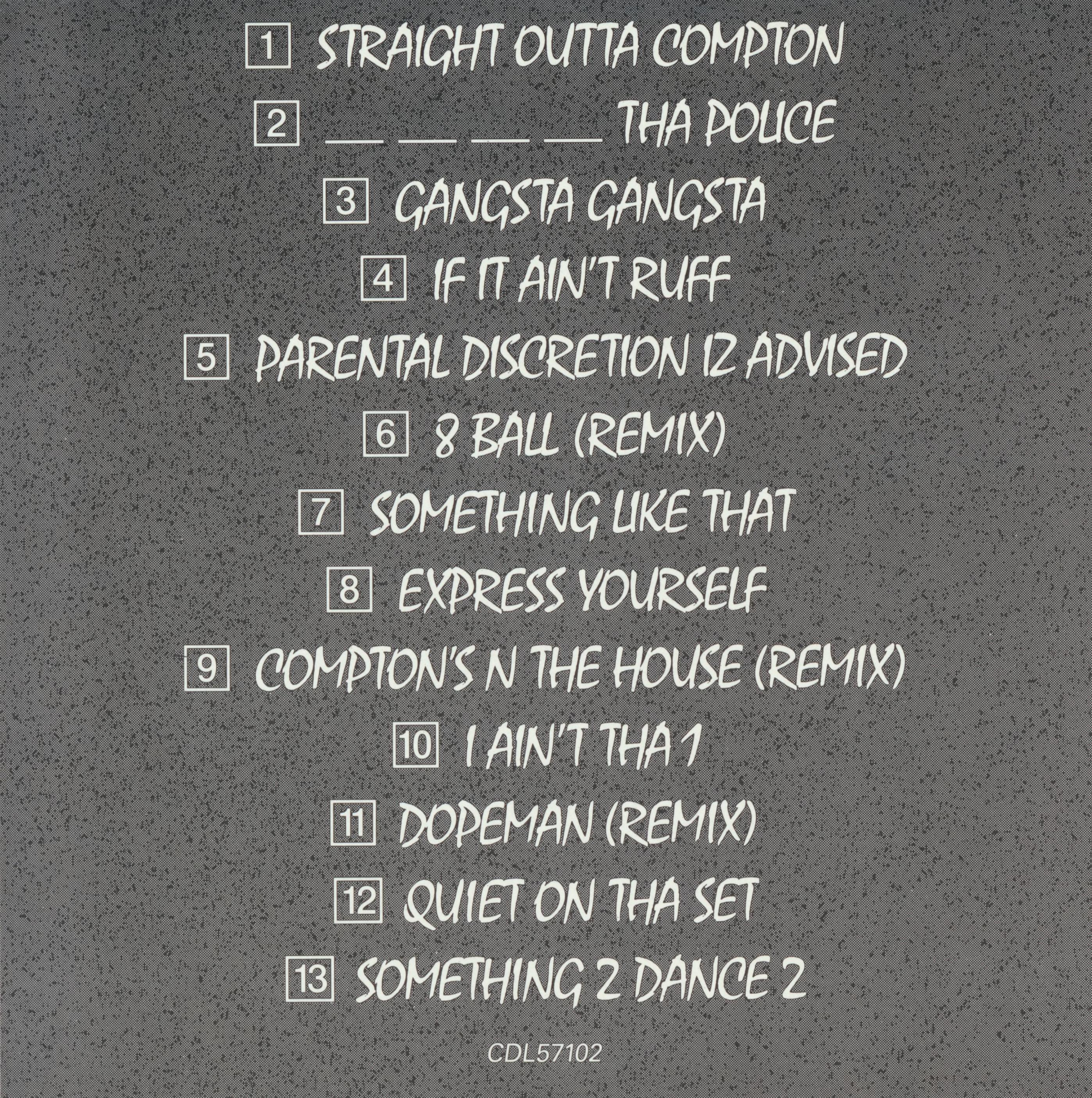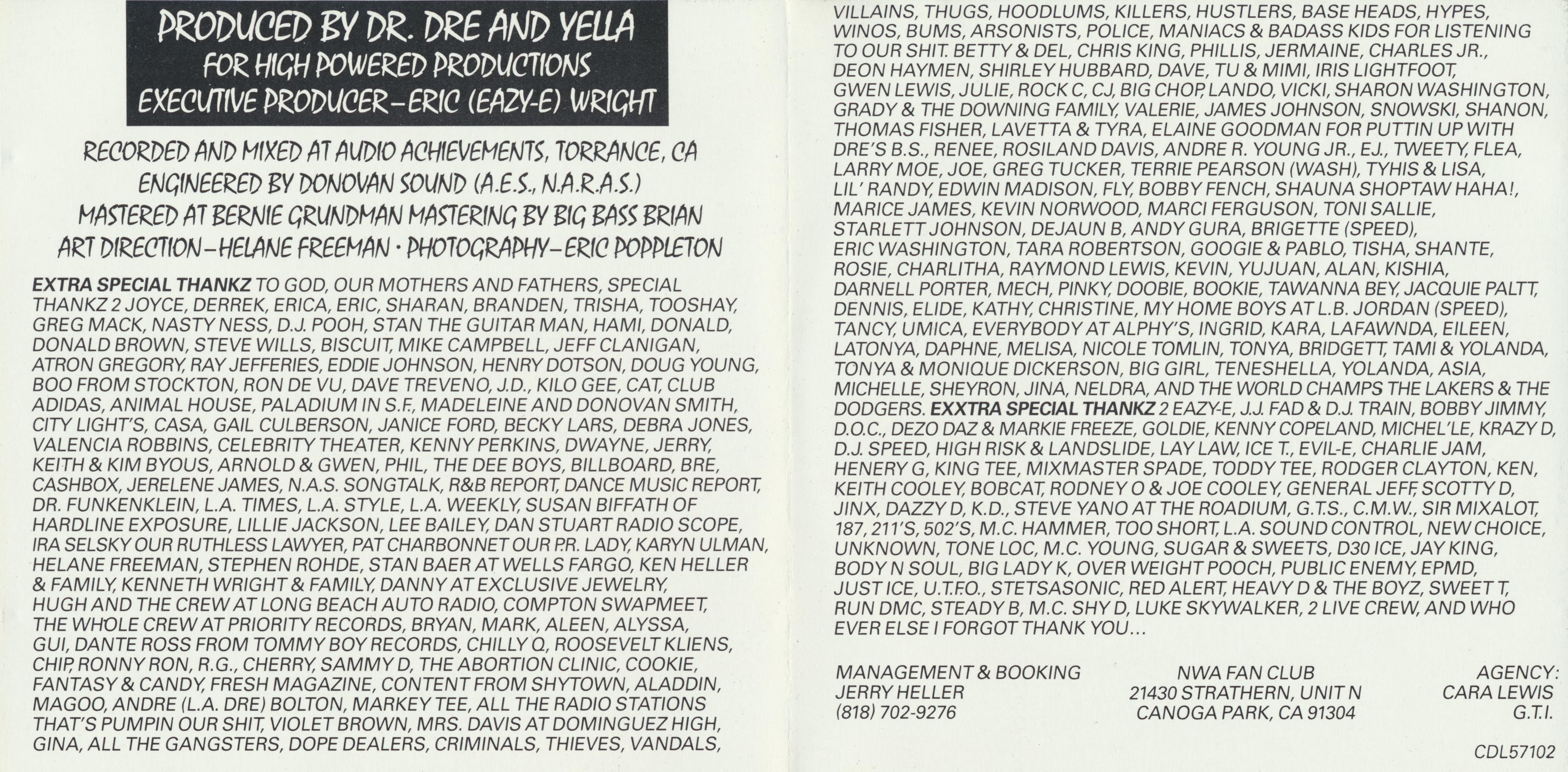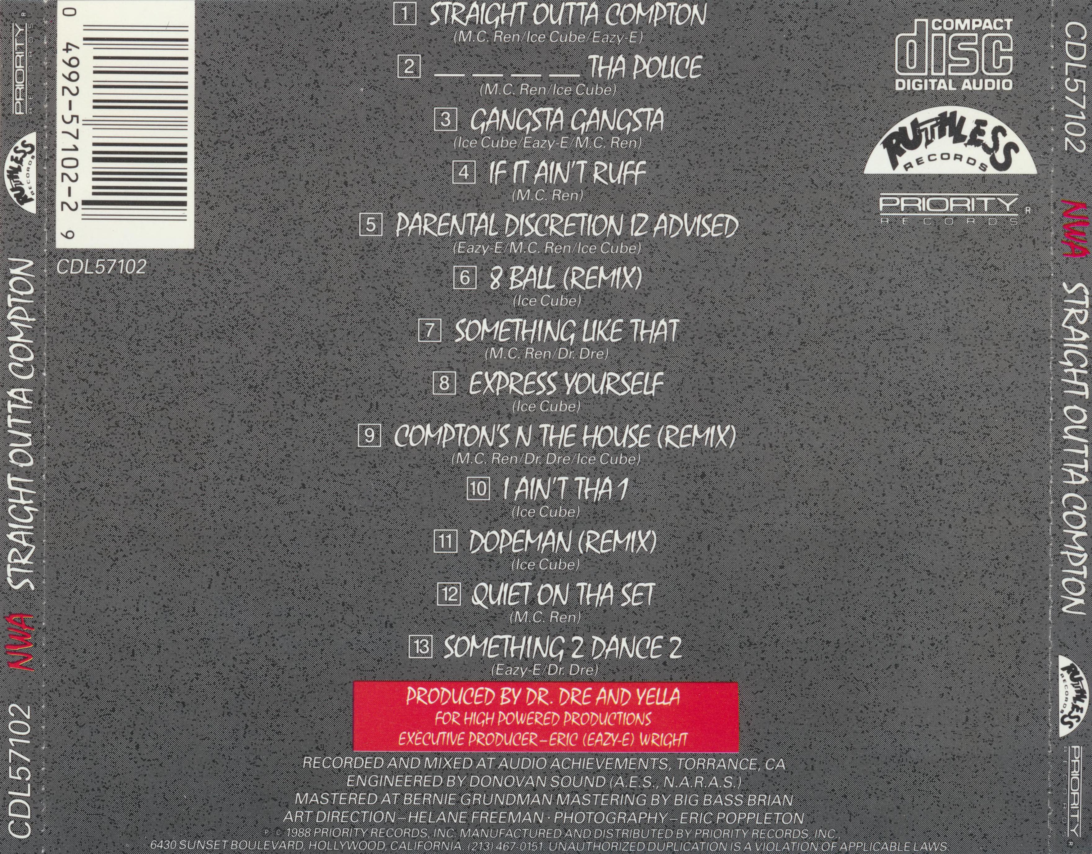 The cover for N.W.A’s debut studio album was designed by Helane Freeman for Priority Records. Mistral is used in all caps. The title is vertically stretched.