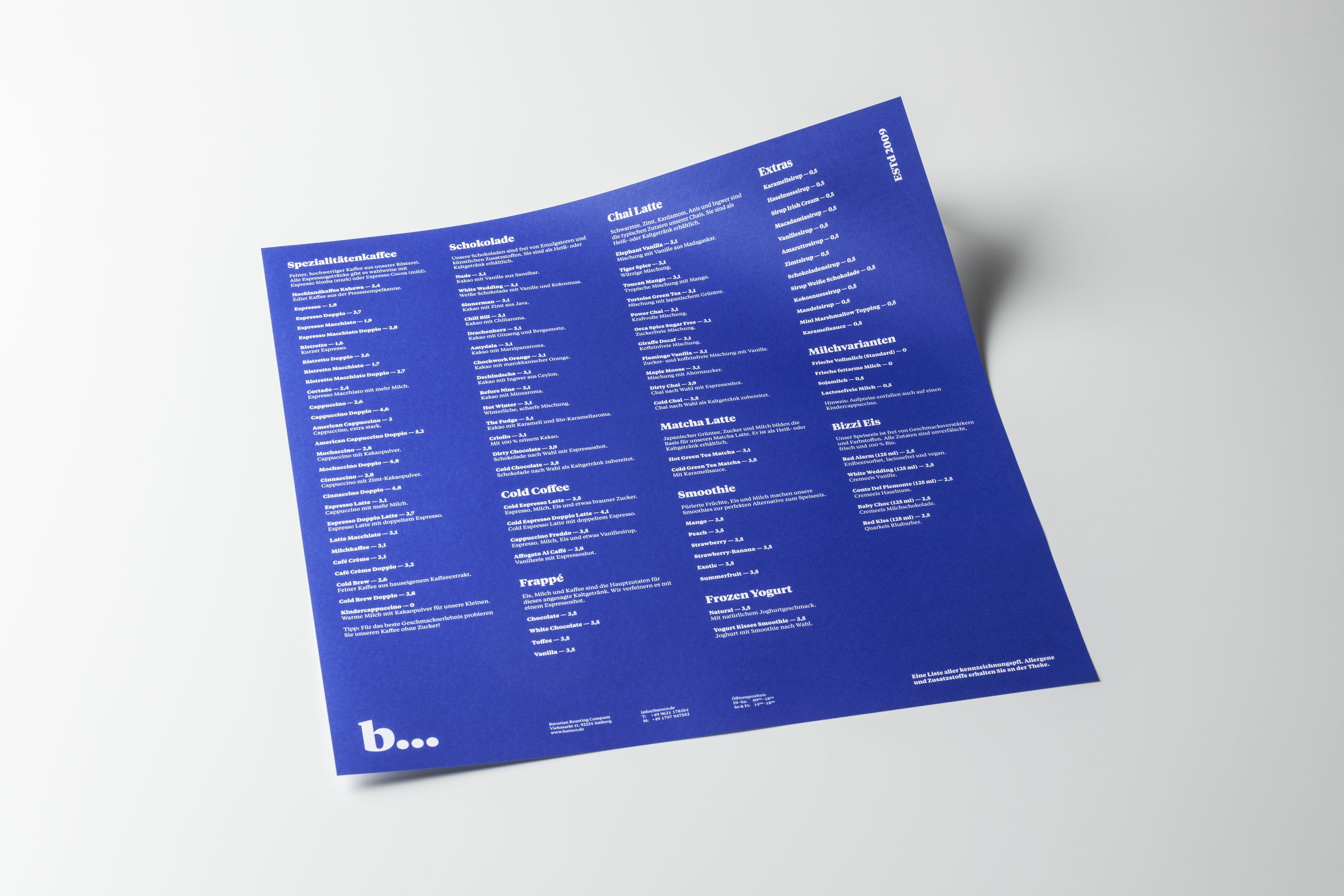 Another design element (and further connection) is made by the ‘ESTd’ lettering, which is set at a 90 degree angle and graphically acts as a counterweight in order to balance the main logos. Conceptually, the logos and the ‘ESTd’ lettering span a rectangle in which content can be laid out arbitrarily. We decided to go with a simple 2-column layout for the most part and extend the layout only if necessary. In rare instances, where it is not possible to display both parts of the logo, we show only one of the main logos (see coffee cups). This system is easy to understand and easy to apply, yet flexible enough for years to come.