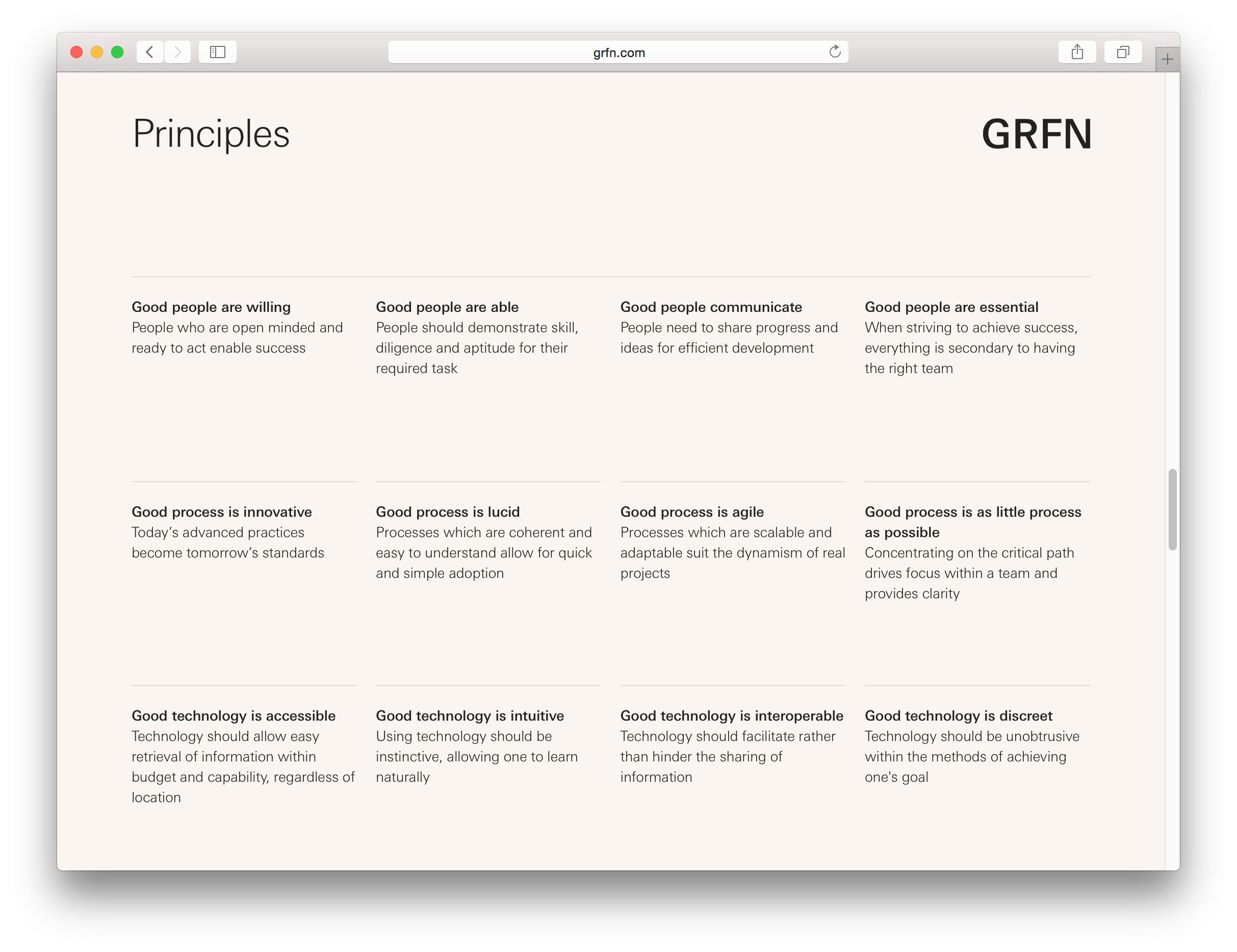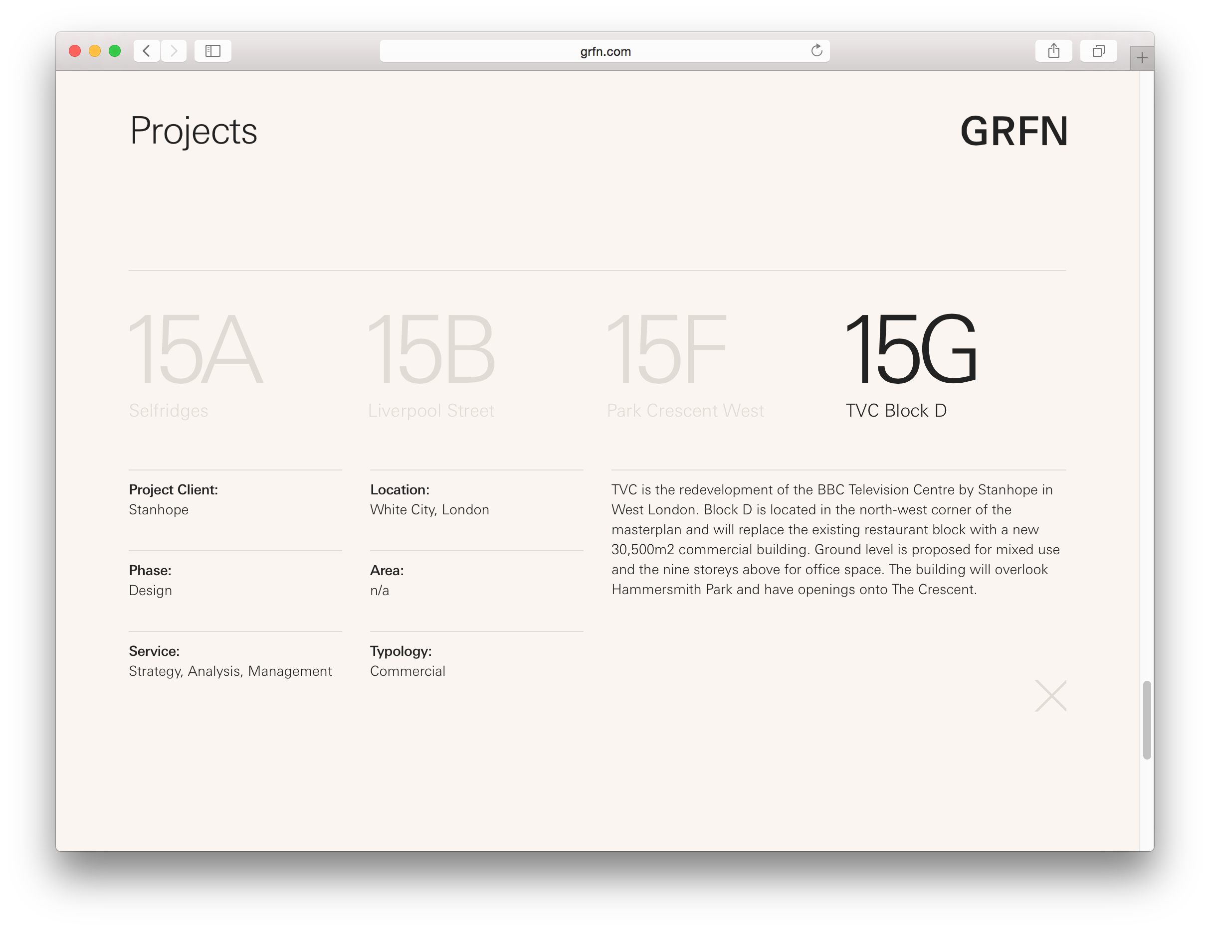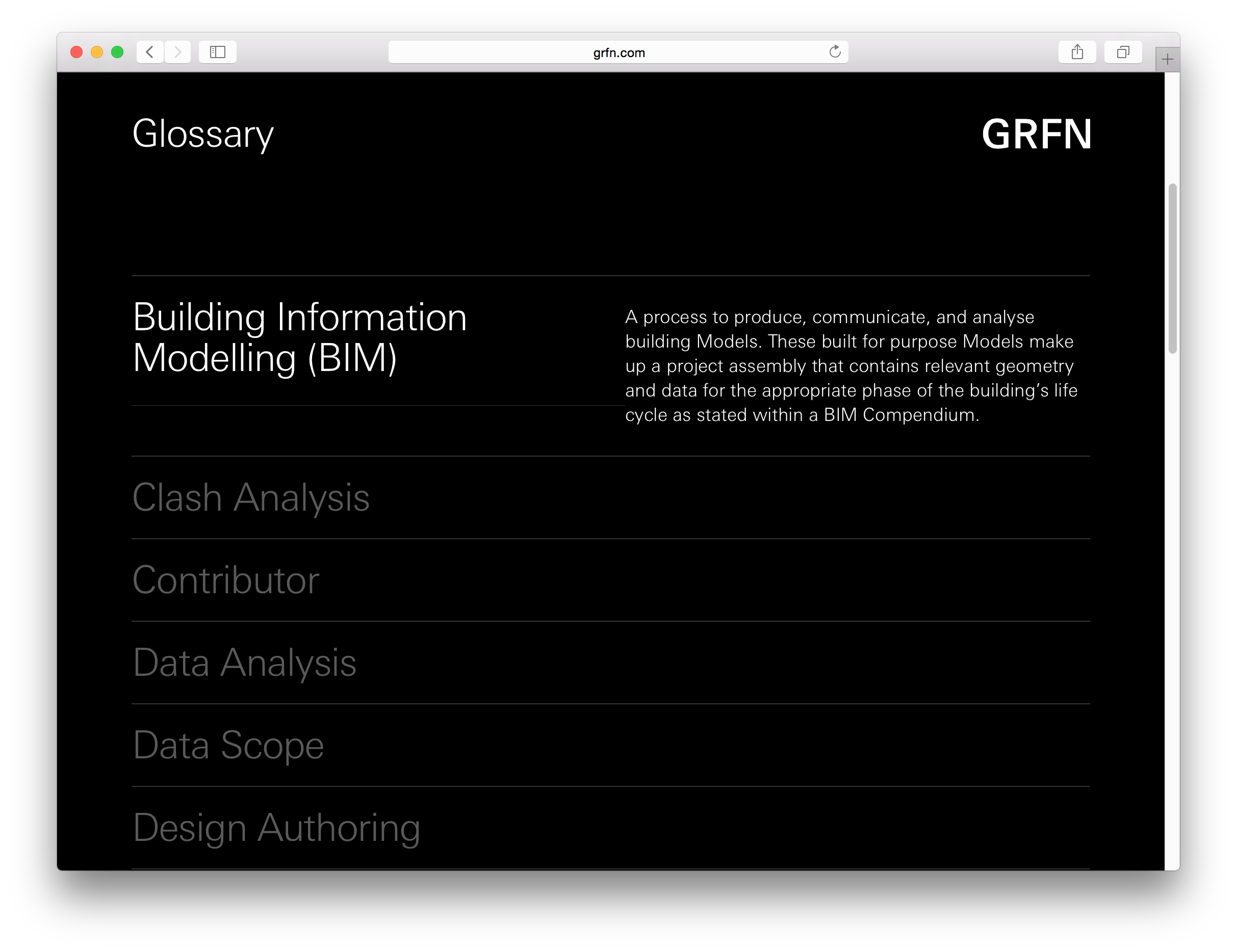 GRFN Contributed by Stephen Griffin on Oct 19th, 2015. Artwork published in September 2015. License: All Rights Reserved. GRFN is a Management Consulting firm based in Central London specialising in building information modelling. The focus of our work is to help clients mitigate risk and drive efficiencies through people, process and technology. License: All Rights Reserved. Source: GRFN.COM Photo: Stephen Griffin. License: All Rights Reserved. Artwork by Stephen Griffin. License: All Rights Reserved. Typefaces More about UniversGet Univers Formats Web (5623) Topics Architecture (1412) Designers/Agencies Socio Design (4) Bernd Grether (2) Tagged withBIM (Building Information Modelling) (2)management consulting (1)only type (1283)one typeface (1753) Artwork location United Kingdom (3292) London (1820) In Setslines (Arjun Dhillon) (28)lists (Arjun Dhillon) (48)set (matt javadi) (5)Print (Tony Bevan) (66) Post a comment Name Email – will not be published Website Your response Submit Comment More Univers in use Didier Barbelivien –“Elsa” single cover1982unknownContributed by Fernando Mello Bellamy Brothers – “Lovin’ On” / “My Shy Anne” Portuguese single cover1978Gráficos ReunidosContributed by Florian Hardwig Filiale Berlin posters2008Kaune & HardwigContributed by Florian Hardwig Staff Pick Sponsor More in Architecture Golden Lane Estate Map: Cuthbert Harrowing House1956Geoffry PowellChamberlinPowell and BonContributed by Stephen Coles “Rien n’est figé” mural2021Nicolas PasquereauIvan BléhautContributed by Benoît Bodhuin Staff Pick Kauffmann Center2011Moshe SafdieContributed by Chris Purcell Kengo Kuma research posterc. 2017Sang-Jin LeeContributed by Sang-Jin Lee More in Web Sqirl Away2020Stephen BogdanContributed by Massimiliano Audretsch Gaia Tree2023Renan VizzottoGemWebContributed by Darden Studio Beaut Serums2021Parsons BrandingDigital ButterContributed by Robyn Mays Staff Pick Fine Principles multi-faceted jewelry2024Alexandra SchwarzwaldContributed by Alexandra Schwarzwald More Fonts In Use Myriam Gendron – Europe tour poster2025Félicité LandrivonContributed by WrittenShape Type Foundry Staff Pick Svizzera 240: House Tour2018Adrian SchneggMartin StoecklinContributed by WELTKERN® Typefaces Staff Pick Forum Neues Wetter2023Wolfgang SchwärzlerContributed by Wolfgang Schwärzler Staff Pick Manifesta 12c. 2018Francesco ValtolinaMarcello Jacopo BiffiJacopo AtzoriContributed by Omnitype Staff Pick