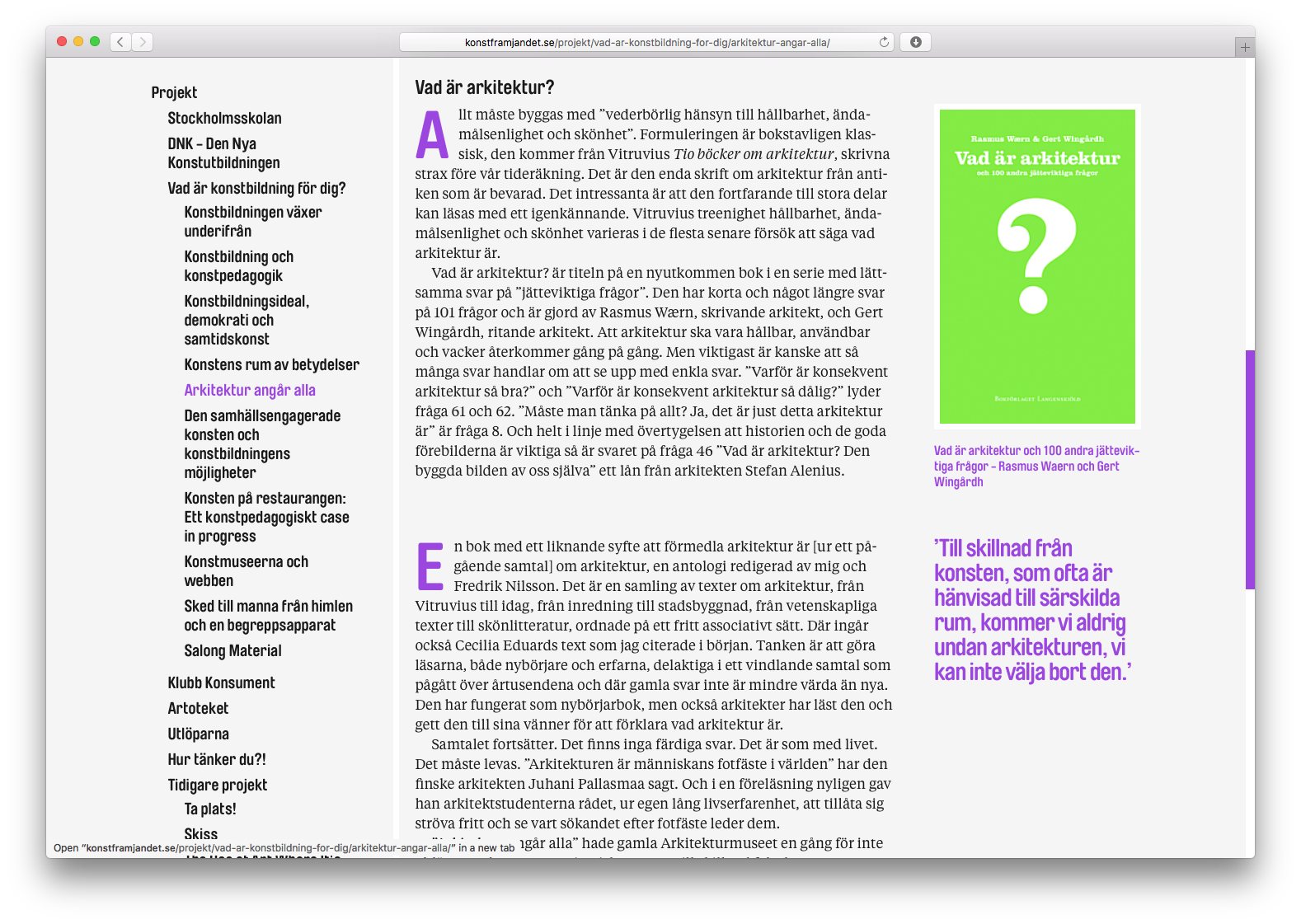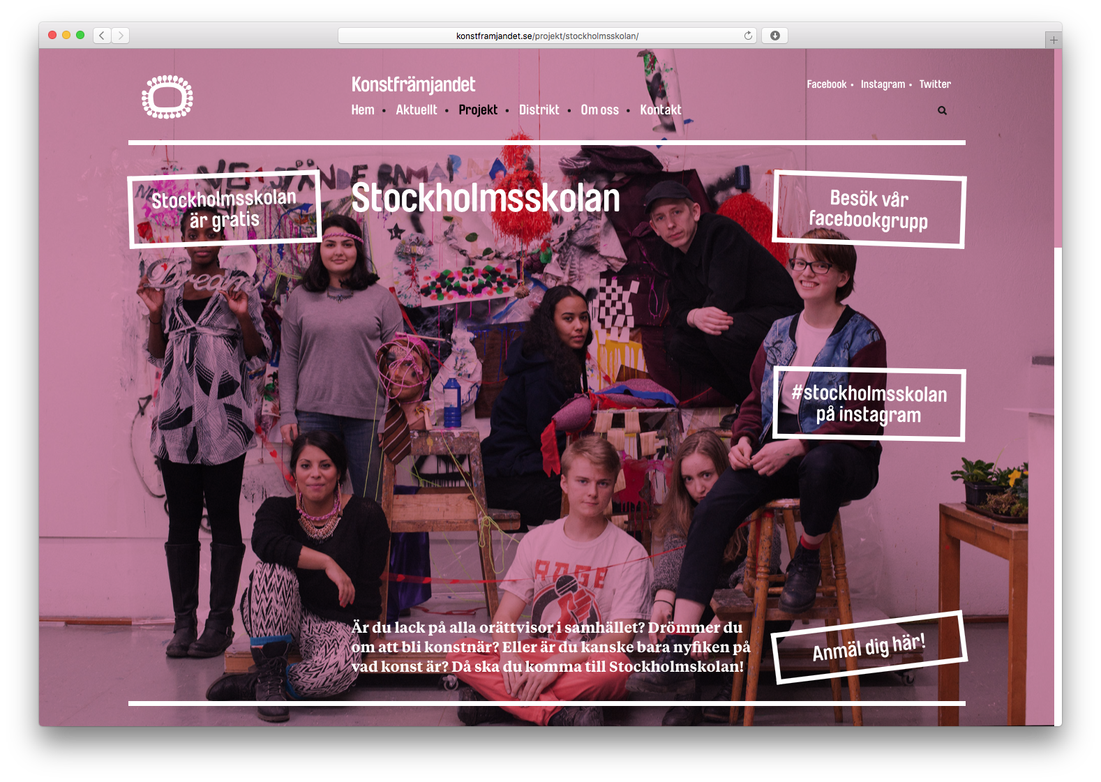 Website for Konstfrämjandet, a Swedish art organization that “produces and provides art throughout Sweden, eg through traveling exhibitions, the production of new works of art, the sale of graphic art and courses as well as other in-depth projects”.