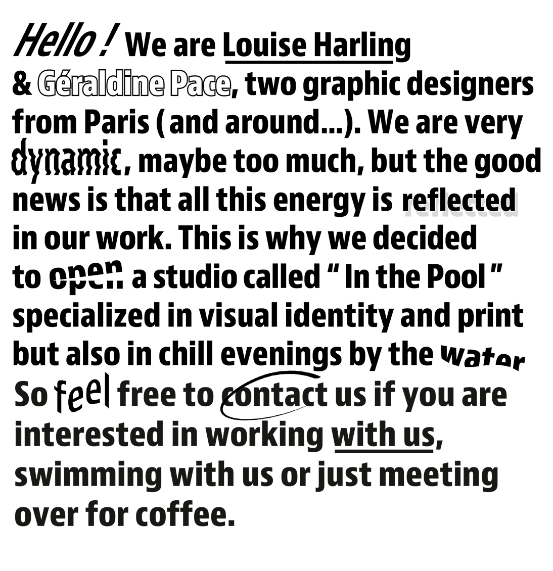 In the Pool mailing Contributed by Florian Hardwig on Oct 21st, 2015. Artwork published in October 2015. Source: inthepool.fr In the Pool. License: All Rights Reserved. For their self-promotional mailing, the graphic designers of In the Pool applied all kinds of effects (see the tags) to JAF Bernino Sans Condensed. Source: inthepool.fr In the Pool. Photography: Florian Chaudat. License: All Rights Reserved. The printed card uses the grunged typewriter freebie Remington Noiseless for the word “print”. Source: inthepool.fr In the Pool. License: All Rights Reserved. Source: inthepool.fr In the Pool. License: All Rights Reserved. Typefaces More about JAF Bernino SansGet JAF Bernino SansMore about Remington Noiseless Formats Branding/Identity (8457) Topics Graphic Design (3011) Designers/Agencies In the Pool (1) Louise Harling (1) Géraldine Pace (1) Tagged withdesign studios/agencies (492)promotion (62)business cards (1539)effects (34)faux italic/slanted (240)underlined (749)outlined type (1260)distortion (361)shadow effects (1212)sliced type (112)emphasis (11)one typeface, one size (413)image made with type (156) Artwork location France (2847) Paris (1321) In Setsrefes (ale) (41)cool (Karo Konieczna) (871) Post a comment Name Email – will not be published Website Your response Submit Comment More JAF Bernino Sans in use Siftwellc. 2024Joshua Jevons DesignJellyfishContributed by JAF Medium.com (2013)2013MediumContributed by JAF Staff Pick Arthur Hochstein portfolio site2015Arthur HochsteinContributed by Stephen Coles Sponsor More in Graphic Design Porodica i domaćinstvo: lepršava svakodnevica Dušana Bekara exhibition catalog2024Dušan BekarAlira Hrabar BekarBEKAR HAUSContributed by BEKAR HAUS Likely Story portfolio websitec. 2022Likely StoryContributed by Alex Slobzheninov The Divine Comedy by Dante Alighieric. 2018Viktor TittelContributed by Swiss Typefaces Watching Words Move1959Robert BrownjohnContributed by Stephen Coles More in Branding/Identity Torü tea shop2020Studio TumulteContributed by Studio Tumulte Instaxc. 1998Contributed by Florian Hardwig Payam Zadeh personal branding and website2025Payam ZadehContributed by Payam Zadeh ARFI visual identity and website2021Studio TumulteContributed by Studio Tumulte More Fonts In Use Bijoux de Tête by dach&zephir and Antonin Mongin2020RimasùuContributed by Axel Pelletanche Staff Pick Architecture Malaysia magazine2021Studio Ejin ShaContributed by WELTKERN® Typefaces Staff Pick L’étrangleur de Cater Street by Anne Perry (Editions 10/18)2022Antoine DesfilisContributed by Diana Ovezea Staff Pick Charli XCX – Brat album art and campaign2024Special Offer, Inc.Brent David FreaneyCharli XCXContributed by Kait Mac Staff Pick