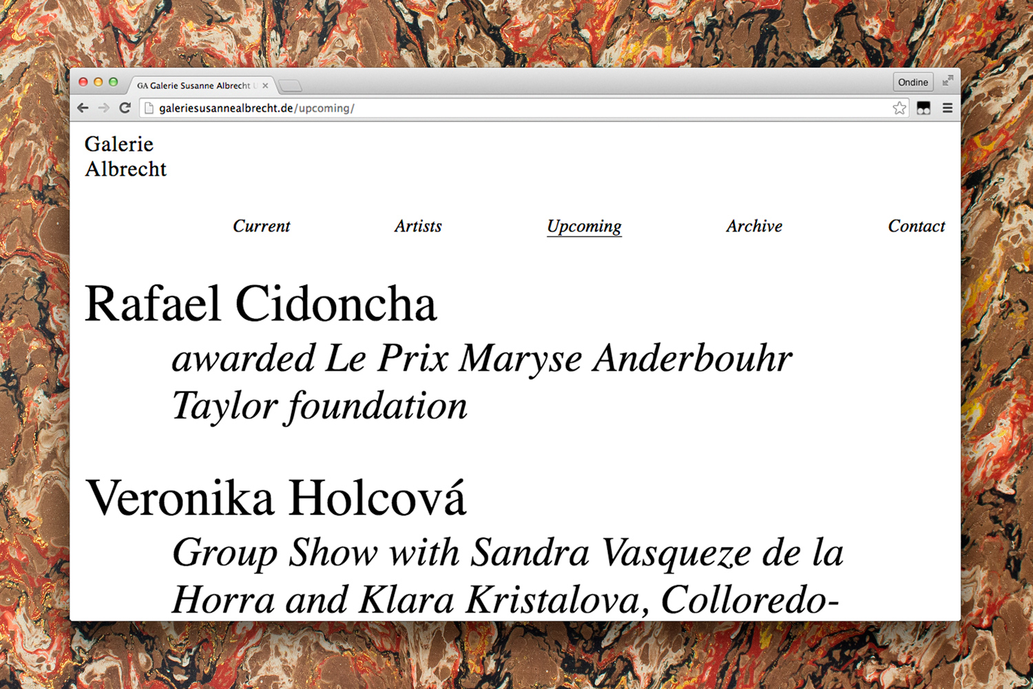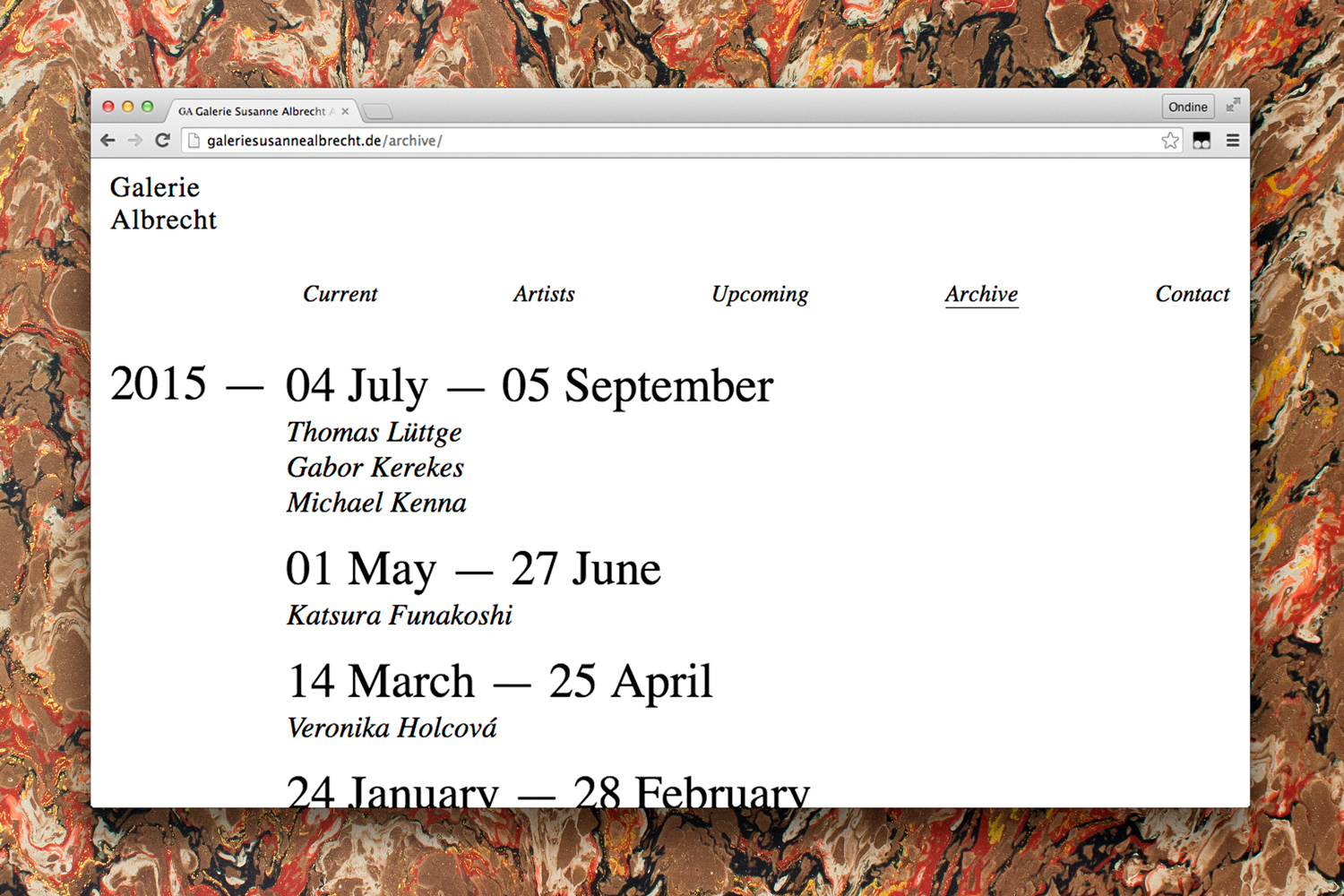 Galerie Albrecht identity Contributed by Studio 24/24 on Nov 2nd, 2015. Artwork published in October 2014. License: All Rights Reserved. Source: studio24-24.com Studio 24/24. License: All Rights Reserved. License: All Rights Reserved. License: All Rights Reserved. License: All Rights Reserved. License: All Rights Reserved. Typefaces More about TimesGet Times Formats Web (5522) Branding/Identity (8298) Posters/Flyers (5648) Topics Art (4576) Designers/Agencies Studio 24/24 (10) Tagged withidentities (2292)identities (2292)posters (1389)art galleries (143)websites (3476)black and white (1983)system fonts as primary type (186) Artwork location Germany (3793) Berlin (1124) In Setscool (Karo Konieczna) (871) Post a comment Name Email – will not be published Website Your response Submit Comment More Times in use OWL Optics2012We Are FellowsContributed by Malte Müller Bebe Magazine, vol. 12024Matilde RavanoS. PellandaContributed by Mert Şen Brasilia #3—“Warten [Waiting]”2016Christian VukomanovicBureau BordeauxJasper EiseneckerContributed by Altiplano Typefaces Sponsor More in Art BestOff 20202021MOOI DesignContributed by Nguyen Gobber Staff Pick Barry, Le Dernier Cowboy du Luberon2023Maël RavassardBazil LamyThibault ChaplainContributed by Maël RAVASSARD East of the Sun and West of the Moon2015Contributed by Roland Hörmann Staff Pick “British Neo-Romantic Art” at Beverley Art Gallery2017unknownContributed by Rob Whiting More in Web Museum Boijmans van Beuningen2006ThonikContributed by Stephen ColesBoymans(Sample unavailable) PNEU website2022Romain LaurentCédric Rossignol-BrunetSamuel VermeilContributed by Abyme Staff Pick WhatFontIs (2019)2019Alexandru CuibariContributed by Alex WhatFontIs Sydney Symphony Orchestra2013Sametz Blackstone AssociatesContributed by Emtype Foundry More Fonts In Use Vintage French Jaz alarm clockContributed by Nick Sherman Staff Pick Galt Toys (1960s–70s)c. 1961Ken Garland & AssociatesContributed by Stephen Coles Staff Pick Short Eyes (1977) movie postersc. 1977Alan PeckolickLSC&P Design GroupContributed by okno vokght Staff Pick A vida Entre Edifícios by Jan Gehl2017Ana Teresa AscensãoContributed by R-Typography Staff Pick