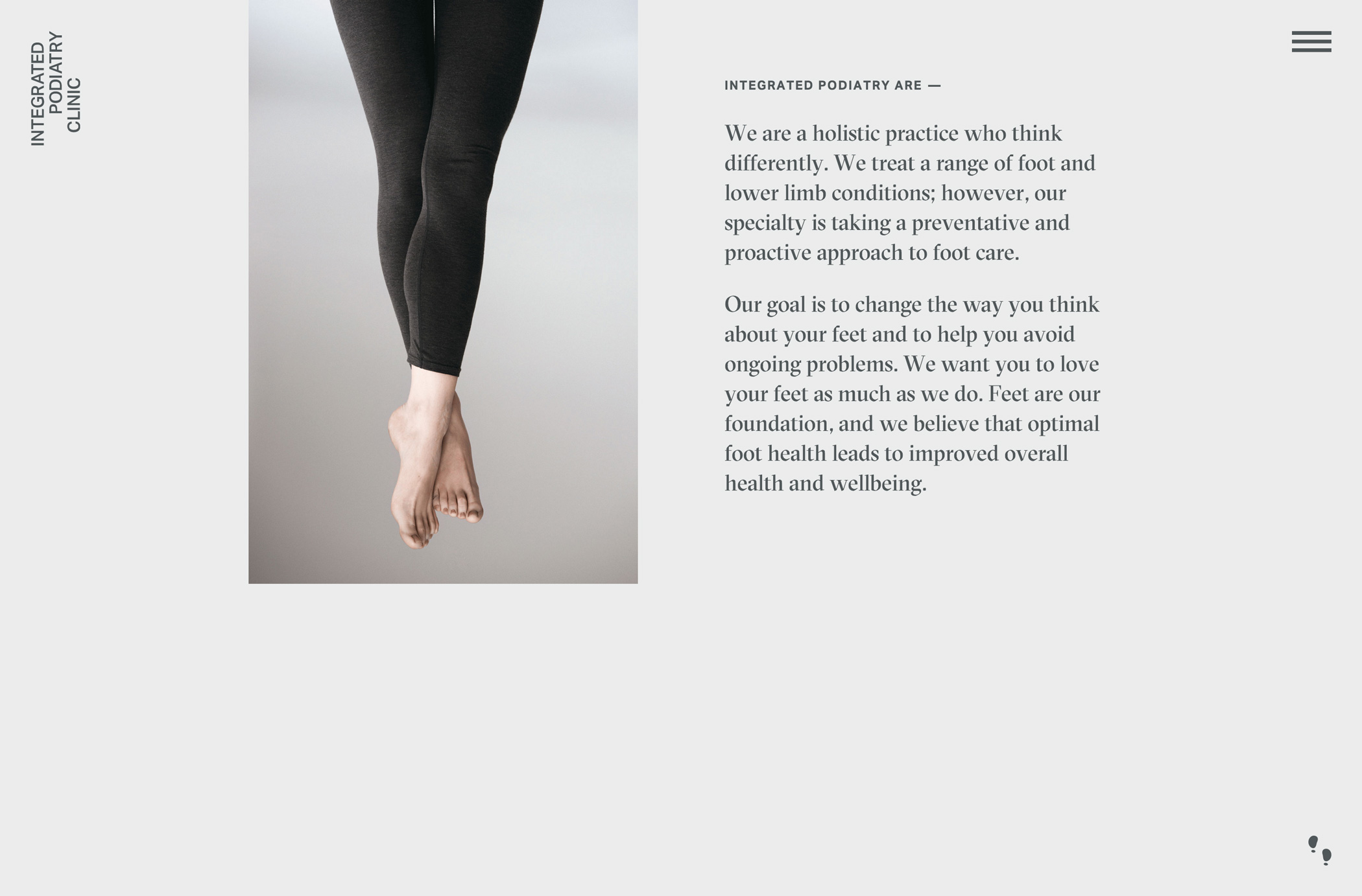 Integrated Podiatry website Contributed by Stephen Coles on Nov 20th, 2015. Artwork published in 2015. Source: integratedpodiatry.com.au License: All Rights Reserved. Source: integratedpodiatry.com.au License: All Rights Reserved. Source: integratedpodiatry.com.au License: All Rights Reserved. Source: integratedpodiatry.com.au License: All Rights Reserved. Source: integratedpodiatry.com.au License: All Rights Reserved. Typefaces More about GT SectraGet GT SectraMore about Aktiv GroteskGet Aktiv Grotesk Formats Web (5570) Branding/Identity (8368) Topics Health/Fitness (875) Designers/Agencies Jac in a Box (1) Tagged withpodiatry (3)reversed type on an image (1206)rotated type (2204)logos (4939)medical (52)medical clinic (1) Artwork location Australia (644) Melbourne (190) Camberwell (1) In SetsSarah (Laura Nash) (5)refes (ale) (41)smooth (Karo Konieczna) (524)trendy (mario b) (5)Editorial Use (Katja Hasenöhrl) (7)Design Inspiration (charles Jackman) (7)FAVS (HIEU) (140)Herbst (Gregor Herbst) (9) Post a comment Name Email – will not be published Website Your response Submit Comment More GT Sectra in use The Fermentary2020Anna Topalidou DesignContributed by Anna Topalidou Die Welt ohne uns – Inke Arns2016JAC-GestaltungJudith Anna RütherContributed by Judith Anna Rüther Staff Pick Tasting Table (2015 redesign)2015Red AntlerContributed by Stephen Coles Blog Sponsor More in Health/Fitness Fabryka Wody aquaparkc. 2024Blank StudioContributed by F37® Naturtint Hair Food packaging2021unknownContributed by Resistenza Type Ellus & Krue skincare website2021Contributed by Jan Maack Health Tech & You2014The Beautiful MemeTal BroshContributed by Tom Sharp More in Web Stories & Novels2010Copy & DesignFranz NeumannContributed by Indra Kupferschmid Blog Eclode2019Jeff HuntKate HarrisSiren SFContributed by Jeff Hunt Indivisa2022FootballcoContributed by Lily Ludford Staff Pick Typeology2012Stephen ColesContributed by Stephen Coles More Fonts In Use Chomsky Perspectives book series2015David PearsonContributed by Nick Sherman Staff Pick Vertigo opening titles1958Saul BassContributed by Stephen Coles Staff Pick Anxy magazine No. 3, “The Boundaries Issue”2018Livia FoldesIndhira RojasAlma AvilaContributed by Gareth Hague Staff Pick Glenn Branca – Lesson No. 1 album art1980unknownContributed by Florian Hardwig Staff Pick