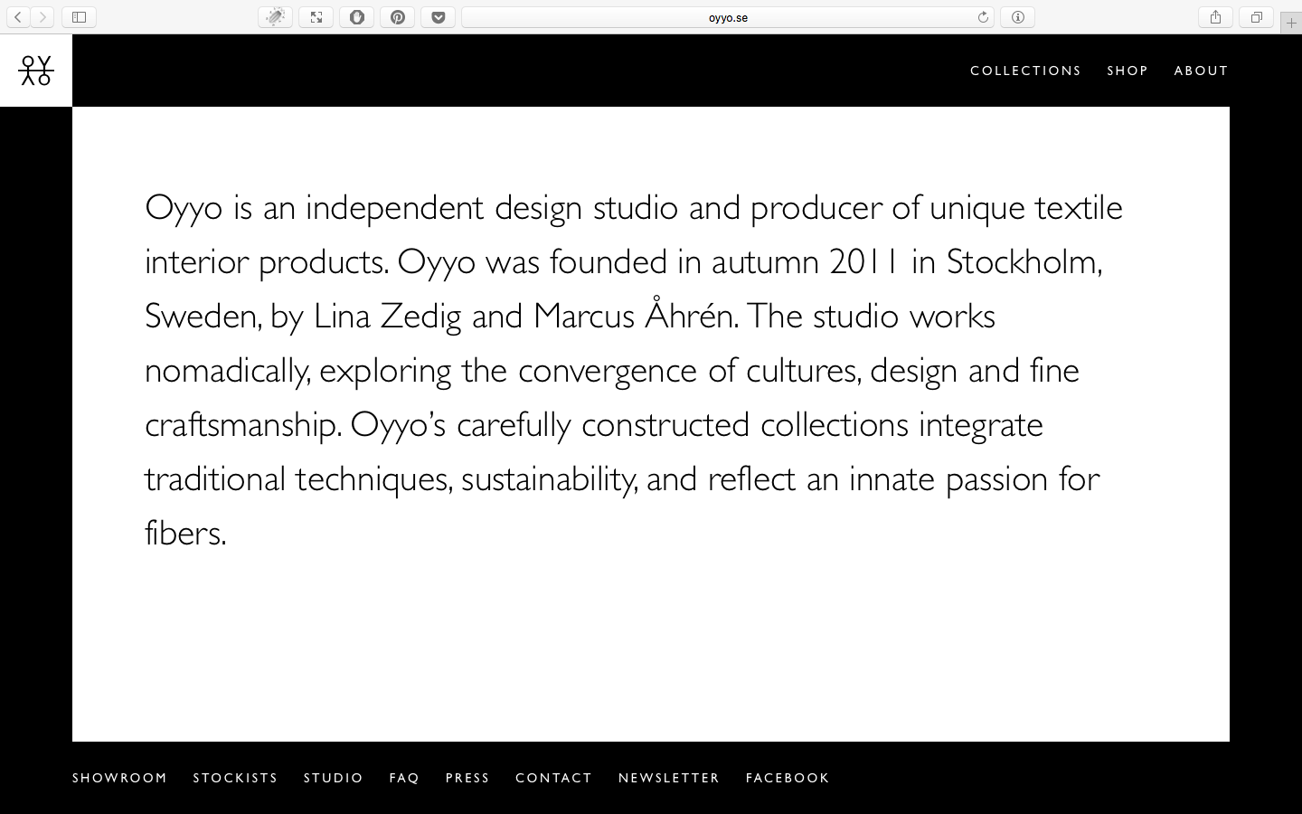 Oyyo is an independent design studio and producer of unique textile interior products. Oyyo was founded in autumn 2011 in Stockholm, Sweden, by Lina Zedig and Marcus Åhrén. The studio works nomadically, exploring the convergence of cultures, design and fine craftsmanship. Oyyo’s carefully constructed collections integrate traditional techniques, sustainability, and reflect an innate passion for fibers.