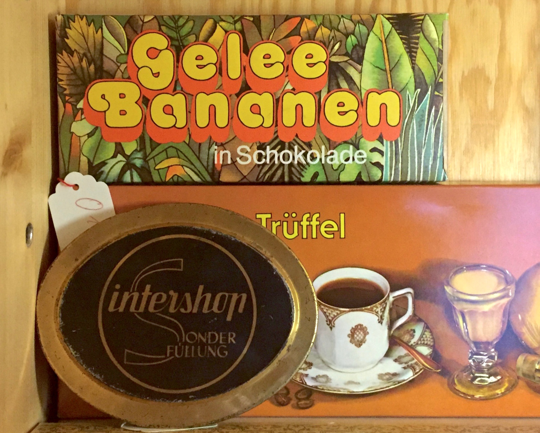 Gelee Bananen in Schokolade Photo(s) by Stephen Coles. Imported from Flickr on Nov 26, 2015. Artwork published in circa 1980. License: All Rights Reserved. Was there ever a better use for Octopuss follower Madeleine? Banana jellies in chocolate, along with other East German goods, at the Museum der Dinge, Berlin. Intershop was a DDR store which sold higher end goods, some from the West. Typefaces More about MadeleineMore about Madeleine ShadedMore about HelveticaGet Helvetica Formats Packaging (2456) Topics Food/Beverage (3082) Tagged withEast Germany (79)Museum der Dinge (1)shadow effects (1220)Intershop (1)sweets/candy (91)bananas (13)sweets/candy (91)chocolate (89)chromatic (769) Artwork location Germany (3899) In SetsMecanorma (Florian Hardwig) (216)Greeting Card Fonts (Megan Cooper) (72)PHANTA (Leonardo de la Fuente) (285) Post a comment Name Email – will not be published Website Your response Submit Comment More Madeleine Shaded in use Christopher Neil – “Hymn” / “Here We Go” French single cover1972unknownContributed by Jorge Iván Moreno Majul Boutique Georgie, St. GallenunknownPhoto(s) by Florian Hardwig on Flickr. Bombadil – “Breathless” single cover1972unknownContributed by Florian Hardwig Sponsor More in Food/Beverage Stan’s Grill2023Social FixationContributed by Mirko Bonm Du bol! booklet, Musée des Arts Décoratifs2023Clément Le Tulle-NeyretContributed by Clément Le Tulle-Neyret Eat, Shrink & Be Merry by Janet & Greta Podleski2005Matrix Four LimitedContributed by Bryson Stohr Chill Chai – Don’t Worry Be Ambient2025Grzegorz SołowińskiRedkroft LabContributed by Grzegorz Sołowiński More in Packaging “Neutrales Eiseneiweiß” pharmacy labelc. 1905unknownPhoto(s) by altpapiersammler on Flickr. Offnen2021unknownContributed by Adrien Menard Kord Quintuple beer2017Ostecx CréativeContributed by Gareth Hague Otis rum2019LobsterContributed by Gareth Hague More Fonts In Use Maser Crisis Murals2010MaserContributed by Underware Staff Pick Yves Tumor @ The Play Circle2019Caleb Vanden BoomContributed by Caleb Vanden Boom Staff Pick Talawa2015SpyContributed by Richard Baird Staff Pick Adam Naas – Goldie and the Kiss of Andromeda album art2023Image FormatContributed by Benoît Bodhuin Staff Pick