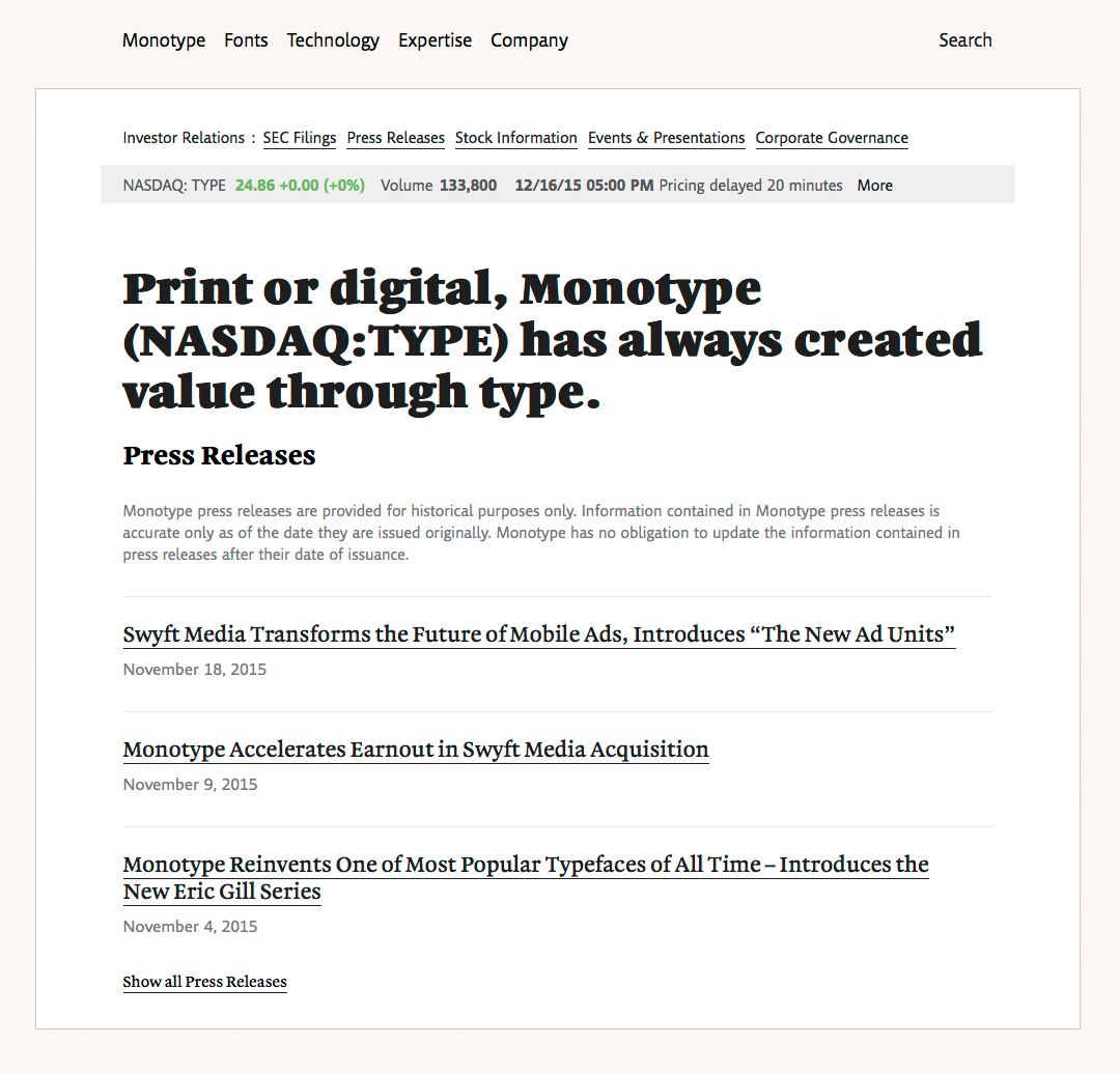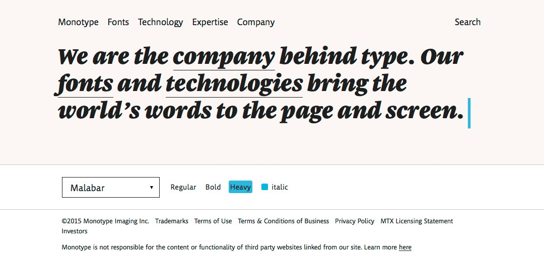 Monotype website Contributed by Peiran Tan on Dec 15th, 2015. Artwork published in October 2014. License: All Rights Reserved. Source: www.monotype.com License: All Rights Reserved. License: All Rights Reserved. Typefaces More about MalabarGet MalabarMore about Kootenay Formats Web (5659) Topics Graphic Design (3024) Technology (1492) Designers/Agencies Information Architects (3) Tagged withtype foundries (32)custom typefaces (852) Post a comment Name Email – will not be published Website Your response Submit Comment More Malabar in use The Murder of Art by Thomas Crombez2016Thomas CrombezLetterwerkContributed by Thomas Crombez Road Grays magazine, issue No. 12019Austin StahlContributed by Austin Stahl Staff Pick Portfolio website of Peiran Tan, 2016c. 2016Peiran TanContributed by Peiran Tan Staff Pick Sponsor More in Technology Spanton Dynamics2019Workshop BuiltContributed by TypeType Implication. Negotiating boundaries on damaged Earth2018Clément Le Tulle-NeyretContributed by Clément Le Tulle-Neyret Staff Pick Basecamp 2 Product Site201237signalsContributed by Stephen Coles Staff Pick Operator – Privacy Collection2022Bureau PaschmannContributed by Sally Paschmann More in Web Mode Analytics2022Brooks ChambersGretelContributed by Drew Powers Staff Pick Arkitektskapc. 2022HandverkJakobsen Frukt & GrøntEivind Stoud PlatouContributed by Smuss Studio Fact Check EU2019DatagifContributed by Maxime Loisel TelefónicaContributed by TypeType More Fonts In Use Stella Domo website2021The Graphic StandardContributed by Jan Maack Staff Pick Ragazzi restaurant identity2019SCCO StudioContributed by Production Type Staff Pick Typographic Swedish Stamps2012Gustav MårtenssonContributed by Indra Kupferschmid Staff Pick Le Chalet de l’Inconnu2024eschenlauer sinicContributed by eschenlauer sinic Staff Pick