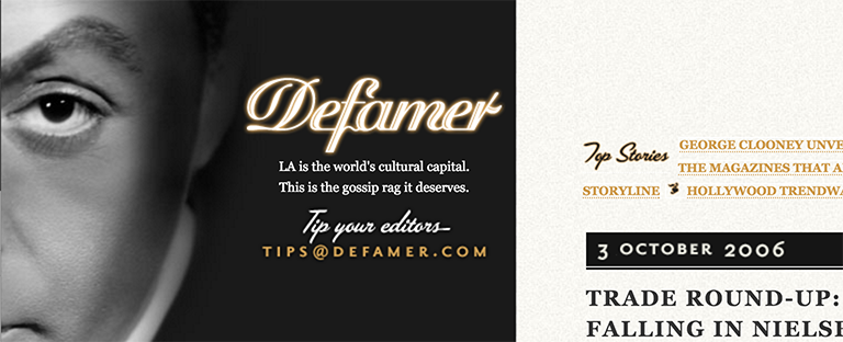Defamer logo Contributed by Stephen Coles on Dec 26th, 2015. Artwork published in circa 2005. Source: houseofpretty.com © Gawker Media. License: All Rights Reserved. Patric King customized Madisonian Engraved for the logo of online Hollywood gossip rag Defamer, modifying the final strokes of the ‘a’ and ‘m’ for a cleaner connection. Source: web.archive.org © Gawker Media. License: All Rights Reserved. Defamer nameplate as it first appeared on the site in 2004. Source: web.archive.org Gawker Media. License: All Rights Reserved. Updated logo and nameplate in 2006 incorporating Las Vegas Fabulous and Priori Sans. Typefaces More about MadisonianGet MadisonianMore about Las Vegas FabulousGet Las Vegas FabulousMore about Priori SansGet Priori Sans Formats Branding/Identity (8297) Topics Entertainment (1510) Designers/Agencies House of Pretty (1) Patric King (1) Tagged withlogos (4896)Defamer (1)Gawker (2)modified typeface (1718)logo evolution (69) Artwork location United States (9771) Chicago (262) Los Angeles (560) Post a comment Name Email – will not be published Website Your response Submit Comment More Las Vegas Fabulous in use Goulash by Brian Kimberling2019Janet HansenContributed by Florian Hardwig The Chicago Neighborhoods2012Steve ShanabruchContributed by Stephen Coles Staff Pick Studio 314 vanc. 2017Björn EwersContributed by Stephen Coles Sponsor More in Entertainment Jeux de Salon ‘Delaire’ chess set labelc. 1904Contributed by Eva Silvertant Staff Pick Sonic the Hedgehog 2 level titles1992Contributed by Cody Boisclair CSI television seriesc. 2000Contributed by Greg Thompson Staff Pick All in the Family: “Bunker for President” poster, buttons, stickers1972unknownContributed by Elise Carlton More in Branding/Identity Cave Canem2025CalorContributed by Darden Studio Travis app2021SnaskMatej ŠpánikContributed by Sean Kane R&S wedding invitation2011Studio Hi HoContributed by Stephen Coles By Humankindc. 2018XXIXContributed by Peiran Tan Staff Pick More Fonts In Use Transpassar – Poetics of movementc. 2017DAÓGabriela PiresContributed by Giovani Castelucci Staff Pick Kvilda Memorial2008Contributed by Briefcase Type Foundry Staff Pick Podere Tranchec. 2022Giacomo BoffoContributed by Margot Lévêque Typefaces Staff Pick What it Means to Write About Art2018Mark ThomsonContributed by Florian Hardwig Staff Pick
