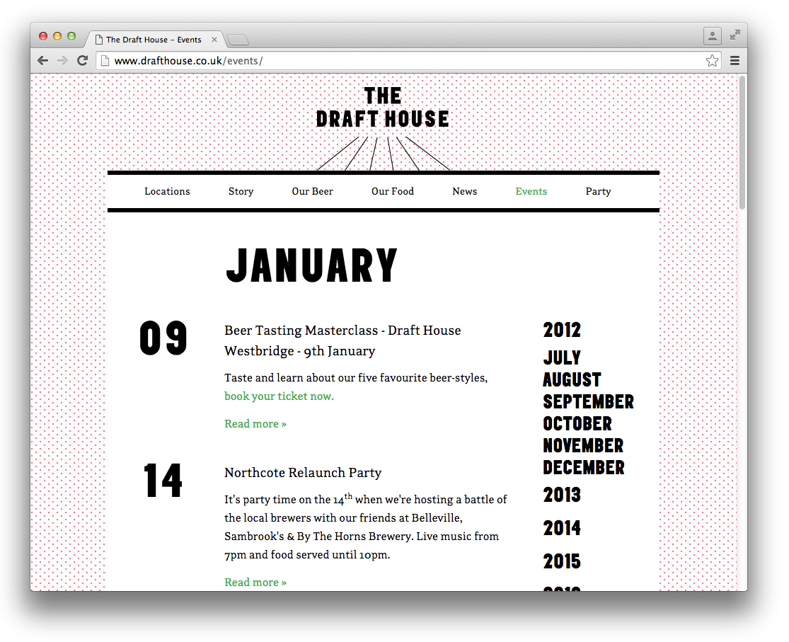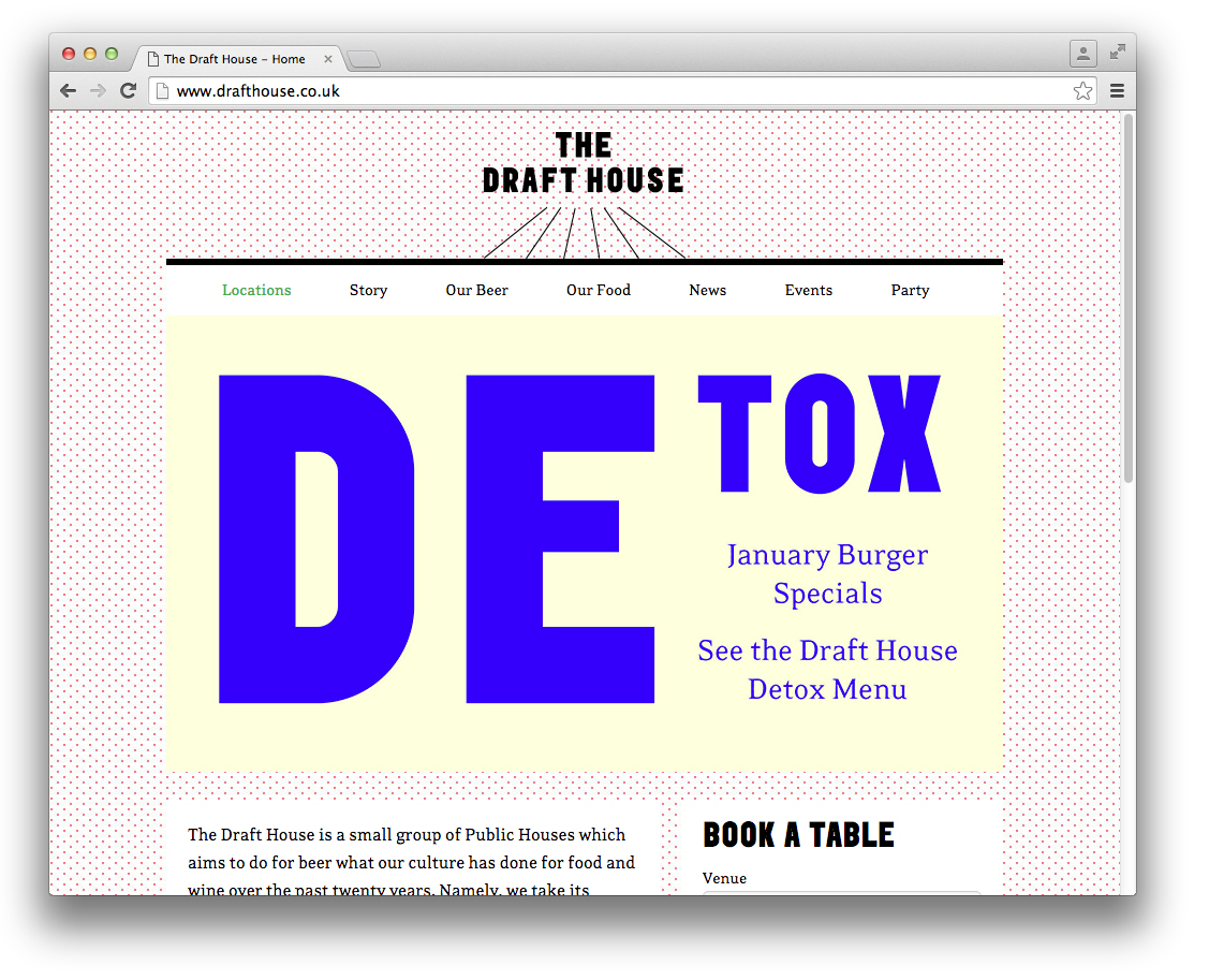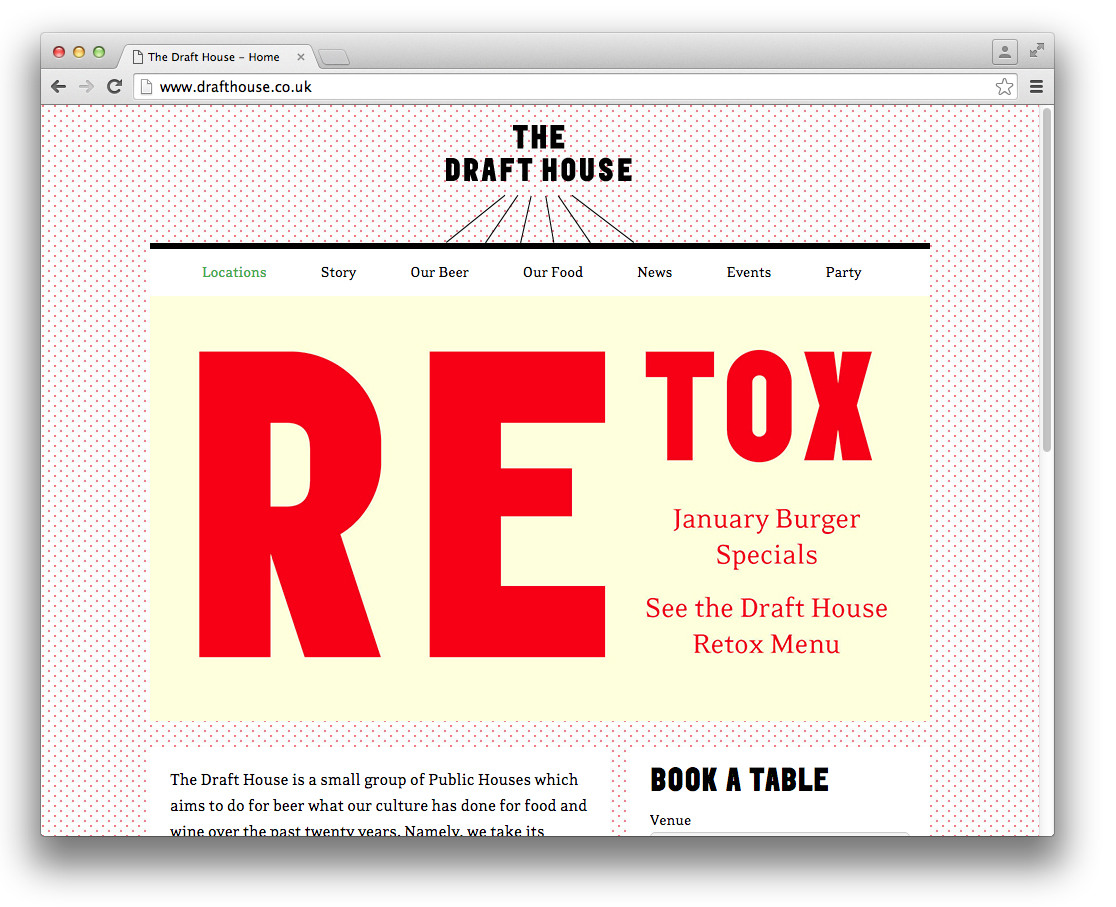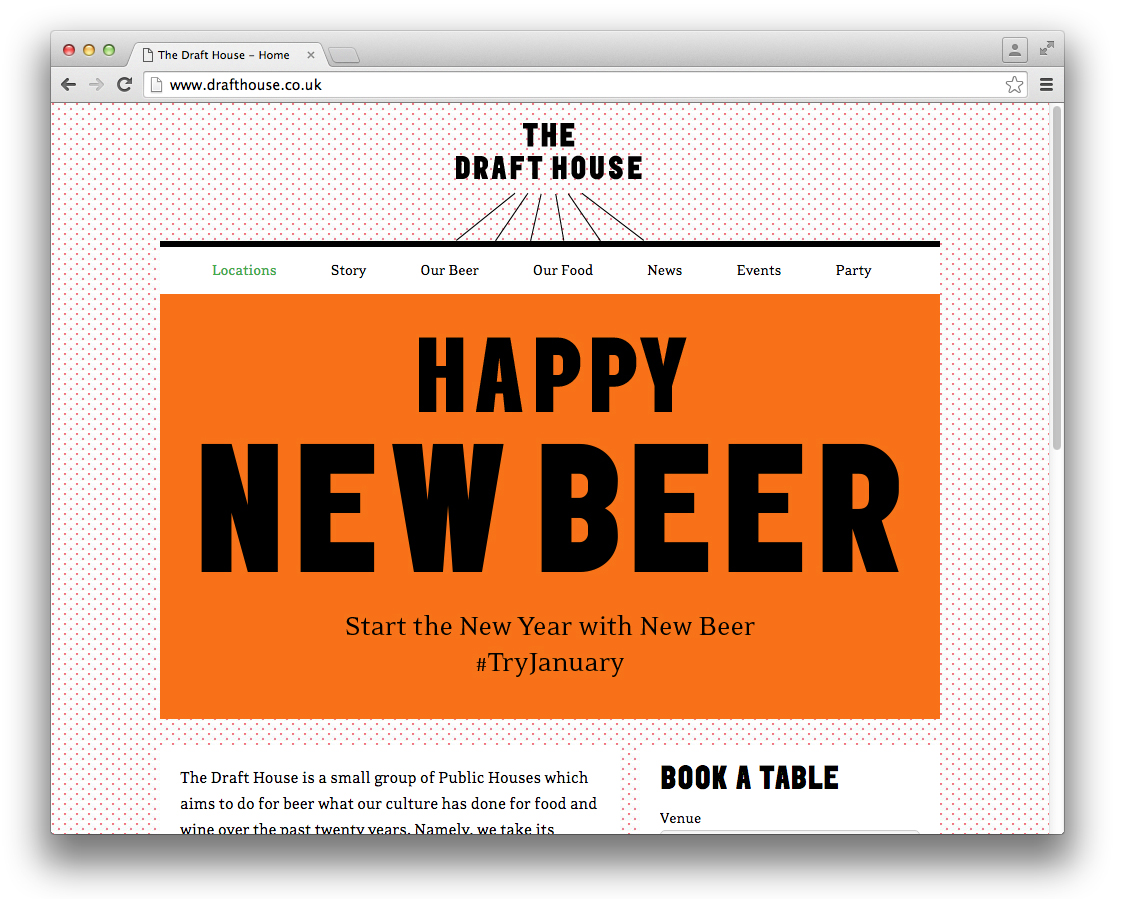 The Draft House is a small group of Public Houses which aims to do for beer what our culture has done for food and wine over the past twenty years. Namely, we take its provenance, cellaring and serving seriously. We celebrate choice and quality with an extra-ordinary range of strange and wonderful brews. — Draft House