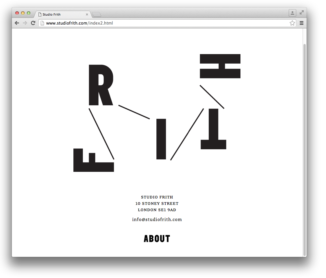 Studio Frith website Contributed by Gareth Hague on Feb 2nd, 2016. Artwork published in 2015. Source: www.studiofrith.com Studio Frith. License: All Rights Reserved. Source: www.studiofrith.com Studio Frith. License: All Rights Reserved. Source: www.studiofrith.com Studio Frith. License: All Rights Reserved. Source: www.studiofrith.com Studio Frith. License: All Rights Reserved. Typefaces More about Eidetic NeoGet Eidetic NeoMore about Elephant (Alias)Get Elephant (Alias) Formats Web (5777) Branding/Identity (8714) Topics Graphic Design (3060) Designers/Agencies Studio Frith (4) Tagged withrotated/upside-down glyphs (254)black and white (2053)big type (1754)design studios/agencies (506) Artwork location United Kingdom (3361) London (1859) In Setsa (Bagus Purwoko) (64)Alias_Web (Gareth Hague) (29) Post a comment Name Email – will not be published Website Your response Submit Comment More Eidetic Neo in use Draft House Pubsc. 2009Studio FrithContributed by Gareth Hague Staff Pick Life Between Islands: Caribbean-British Art 1950s–Now exhibition book2021The Bon TonContributed by Gareth Hague Du yéti au calmar géant2016ABM StudioContributed by Production Type Sponsor More in Graphic Design Oakford Social Club, Music & Arts Programmec. 2014Jig TailorContributed by Jig Tailor Le Petit Didier2021Bureau 205Contributed by 205TF Staff Pick Burg-Enzyklopädie2015Ferdinand UlrichContributed by Norman Posselt Staff Pick Typetura introduction articles2019Scott KellumContributed by Scott Kellum More in Branding/Identity Better Homes and Gardens cook books (1968–75)c. 1968Contributed by Paul Hunt Opéra de Tours, saison 20222022Claire-Gil JacquenodContributed by VJ-Type Staff Pick G de L EKO visual identityc. 2023Roche StudioKonrad RocheContributed by Konrad Roche Buffy the Vampire Slayer logos1997Margo ChaseThomas CobbGeorge MontgomeryContributed by Stephen Coles More Fonts In Use OH Catalogue website and folder2025mutoco AGThomas HirterSimon MoserContributed by Thomas Hirter Staff Pick Programmierte Hoffnung. Architekturexperimente an der HfG Ulm folder and invitationc. 2025Matter OfContributed by Anna-Sophia Pohlmann (kimera) Staff Pick Crazy Otto’s Back in Town album art1958unknownContributed by Florian Hardwig Staff Pick Bedow2014Andreas KällbomStudio KällbomContributed by Andreas Källbom Staff Pick