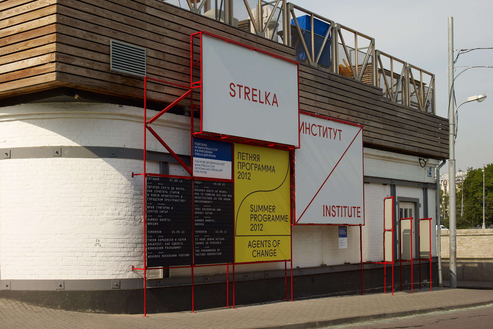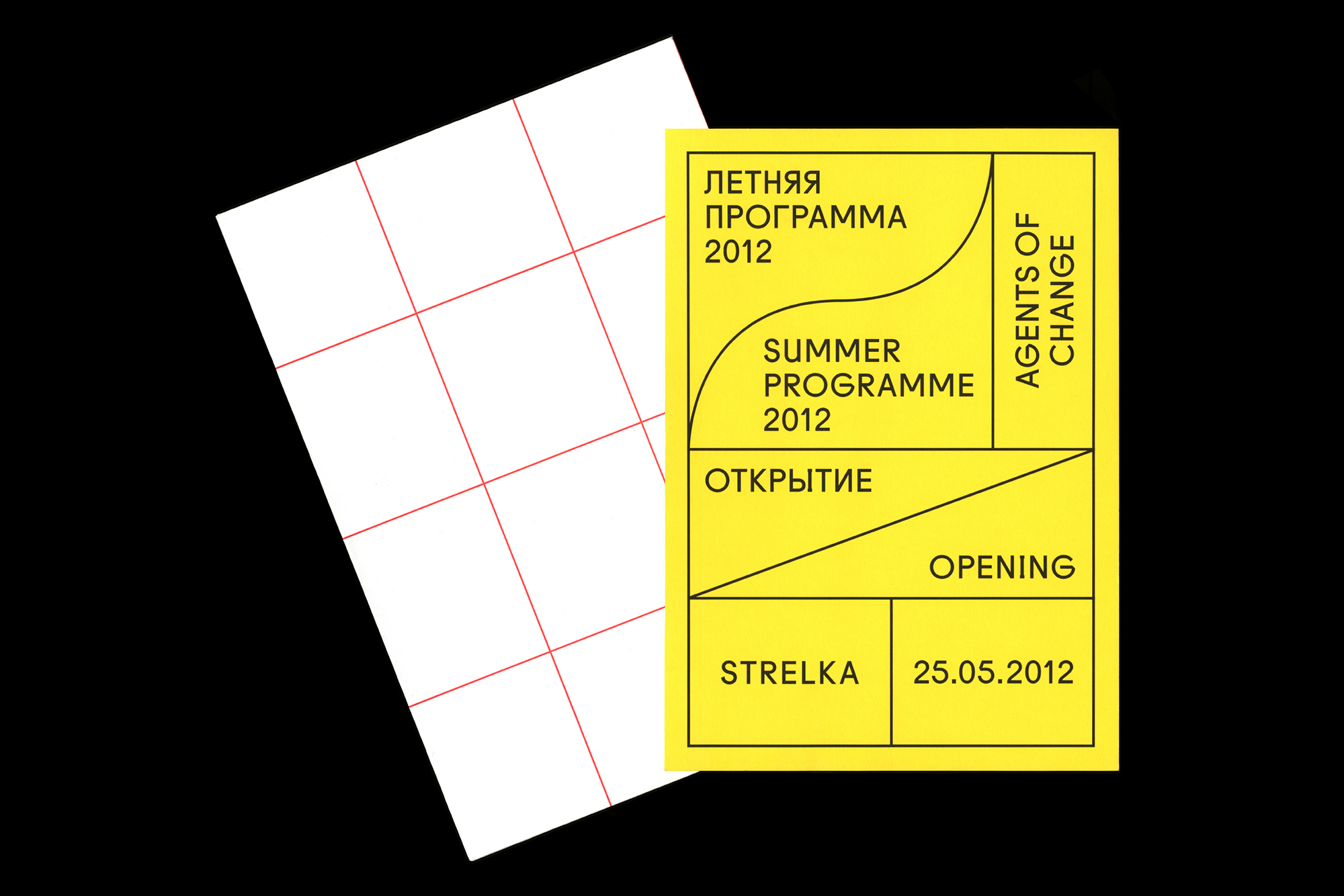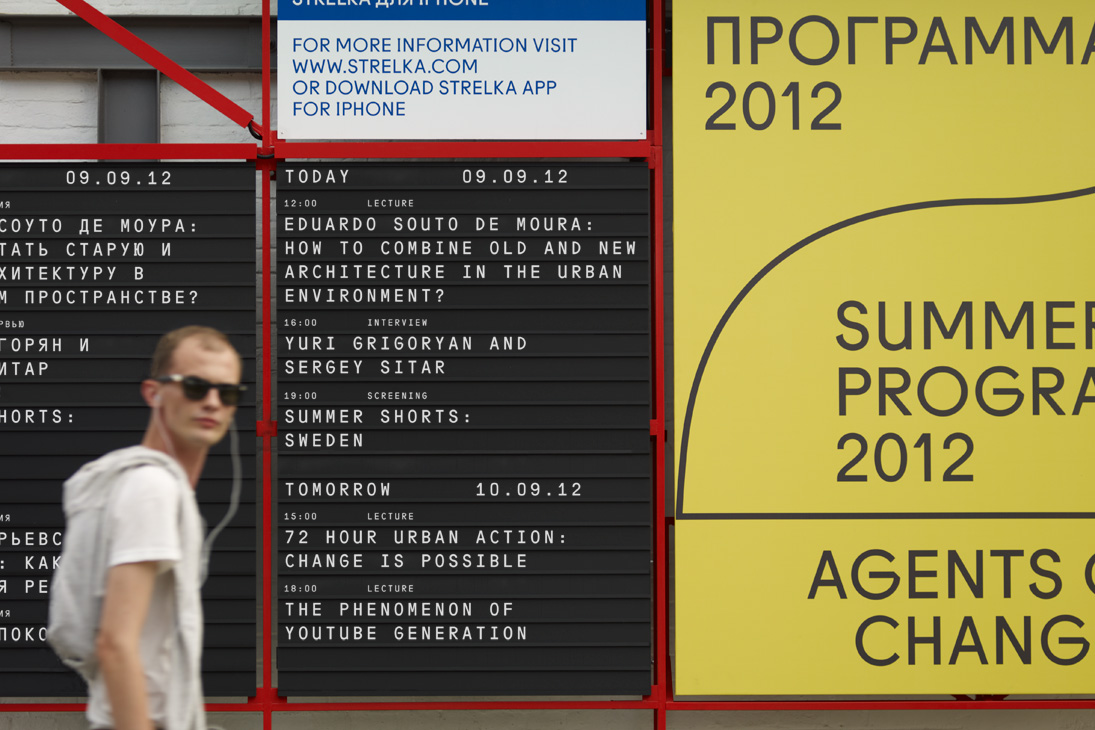 Strelka Institute is a pioneering architecture, media and design institute based in the heart of Moscow. At the centre of the visual identity is a grid which acts as a metaphor for public space. It promotes a democratic relationship between the institute, events and people that shape it. Dual language is employed throughout to portray a Russian institute with an international outlook whilst the varied mantra communicates an institute that is continually redefining itself. In application the grid is recognisable, efficient and flexible for the display of multiple levels of content across various formats — from printed materials and digital media to architectural scale signage and publications.