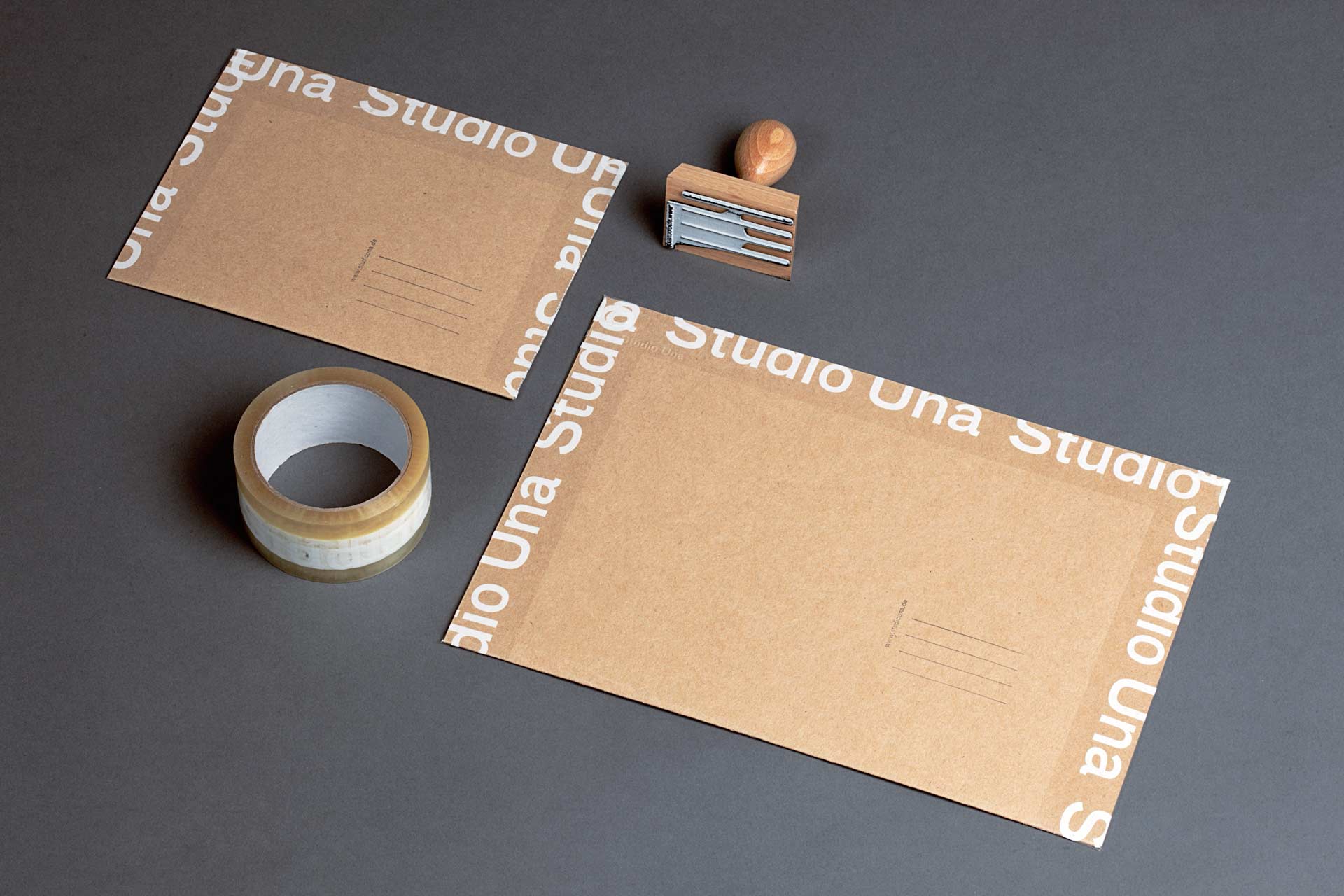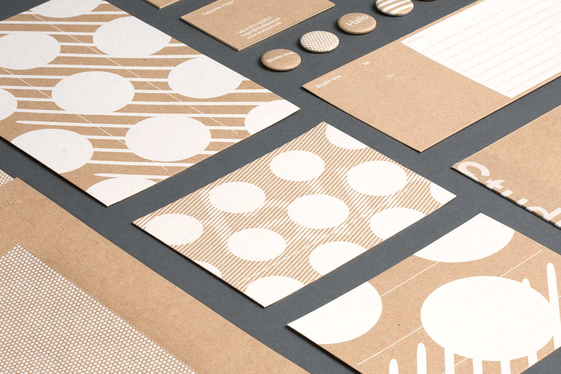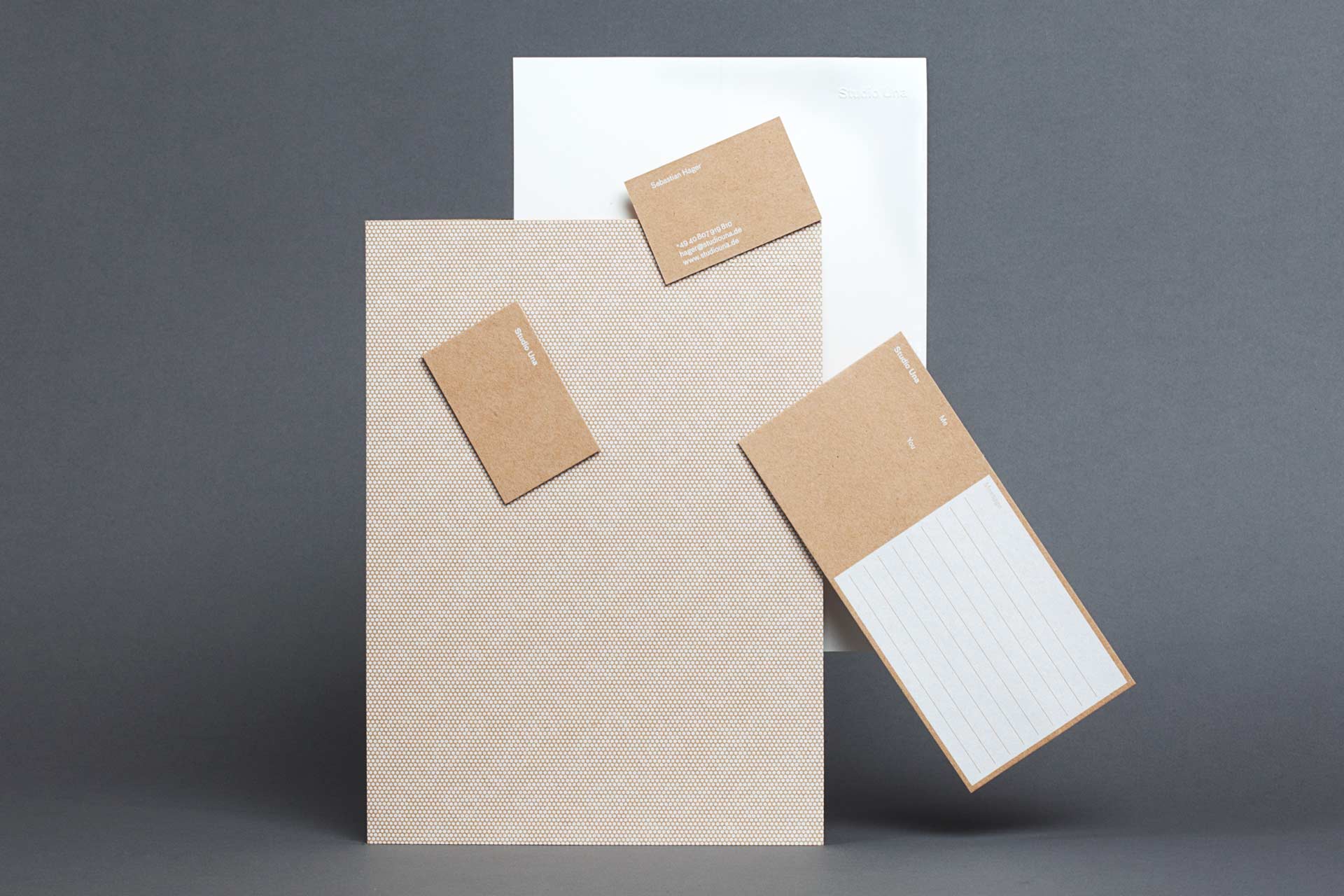 The aim of this project was to produce a flexible and high-quality stationery with a pleasant touch for our studio. To produce various printed materials in a single pass, we have screen-printed on a sheet with different formats, patterns and applications. The open textured and sand-colored cardboard was printed with white, writable color. A special feature is the large dot-matrix sheet from which we have made various applications such as folders and notebooks. In addition to business cards and short messages we made some postcards and buttons. The print project is complemented by utilities and tools, such as printed tape, stamps and an embossing press to individualize the printed matter and to produce additional applications such as shipping envelopes.