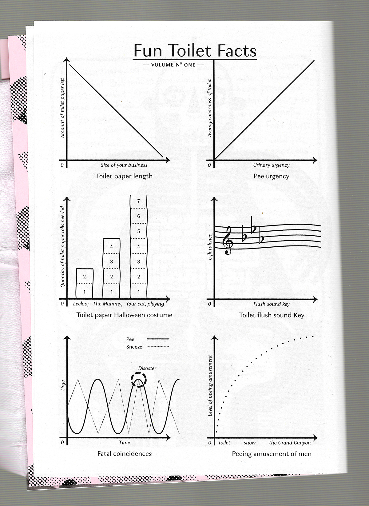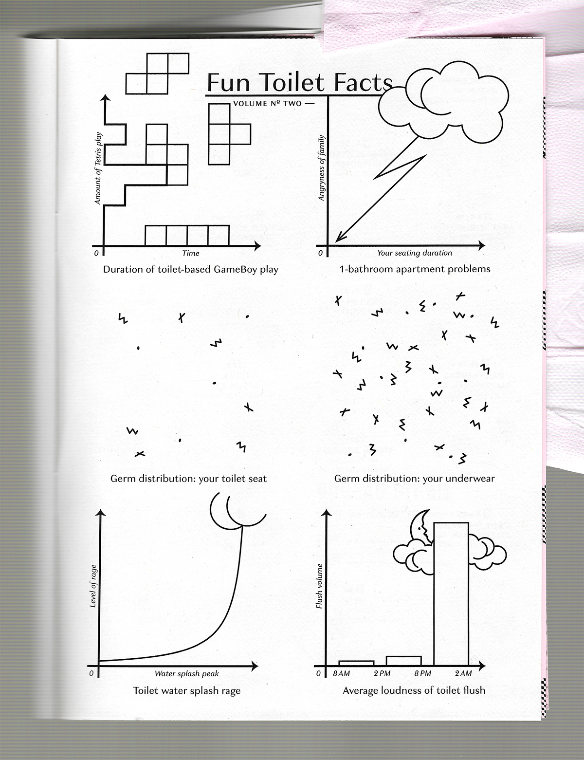 Fun Toilet Facts is a series of diagrams and was contributed to Bureau Stabil’s toilet-themed fanzine “Klolektüre” (toilet read). The entry uses (then newly released) Granville, a modulated sans by Production Type. The crescent moon in Average loudness of toilet flush is a Webdings glyph.
