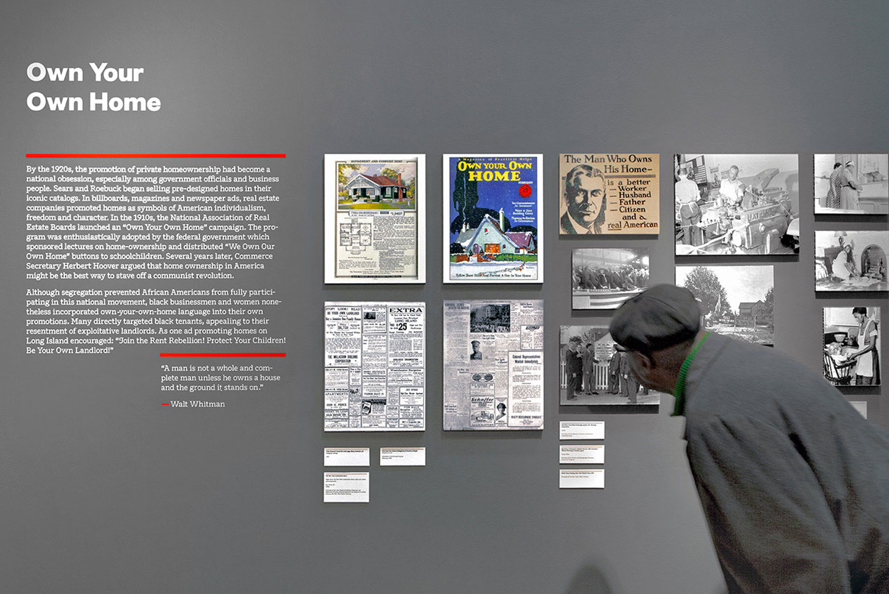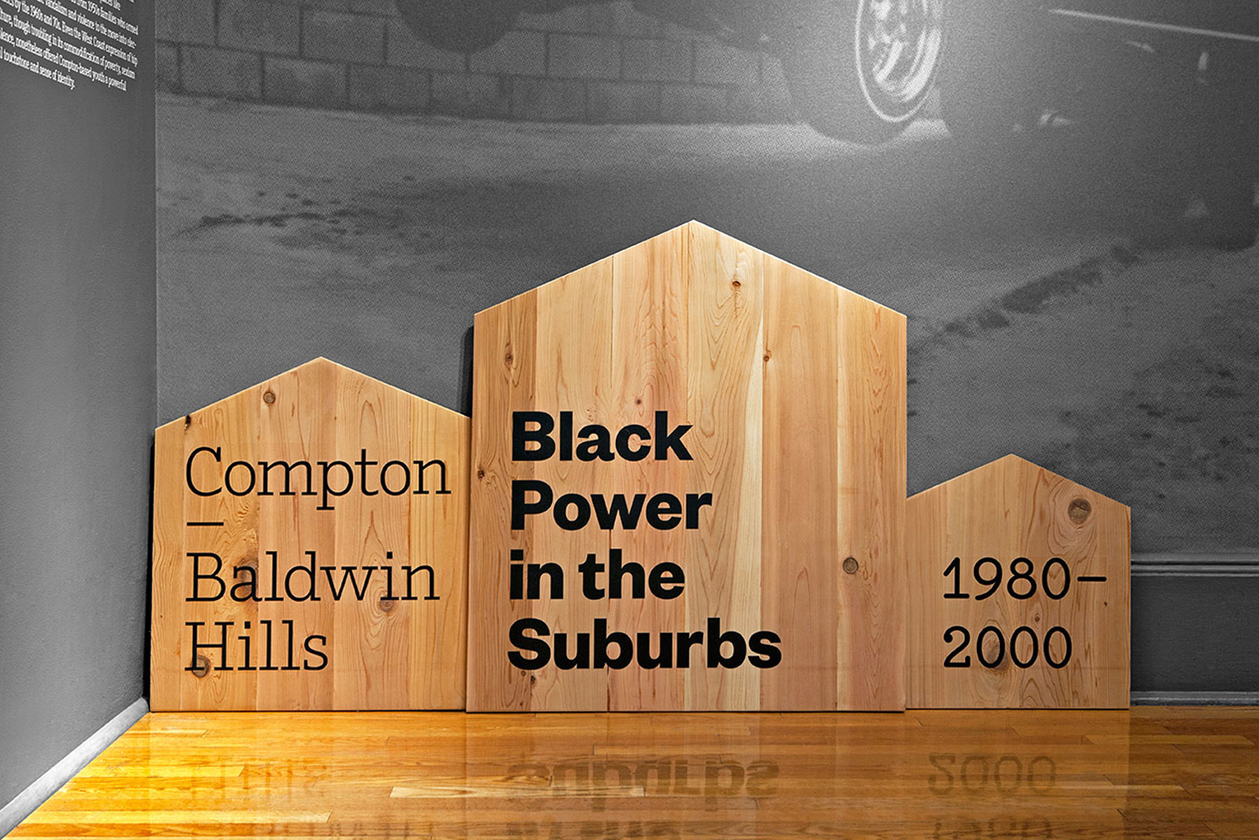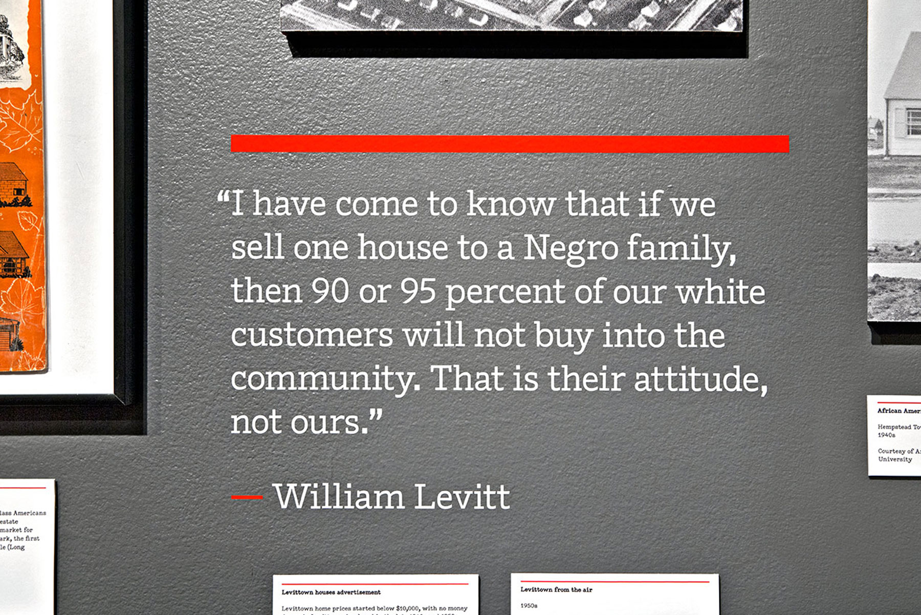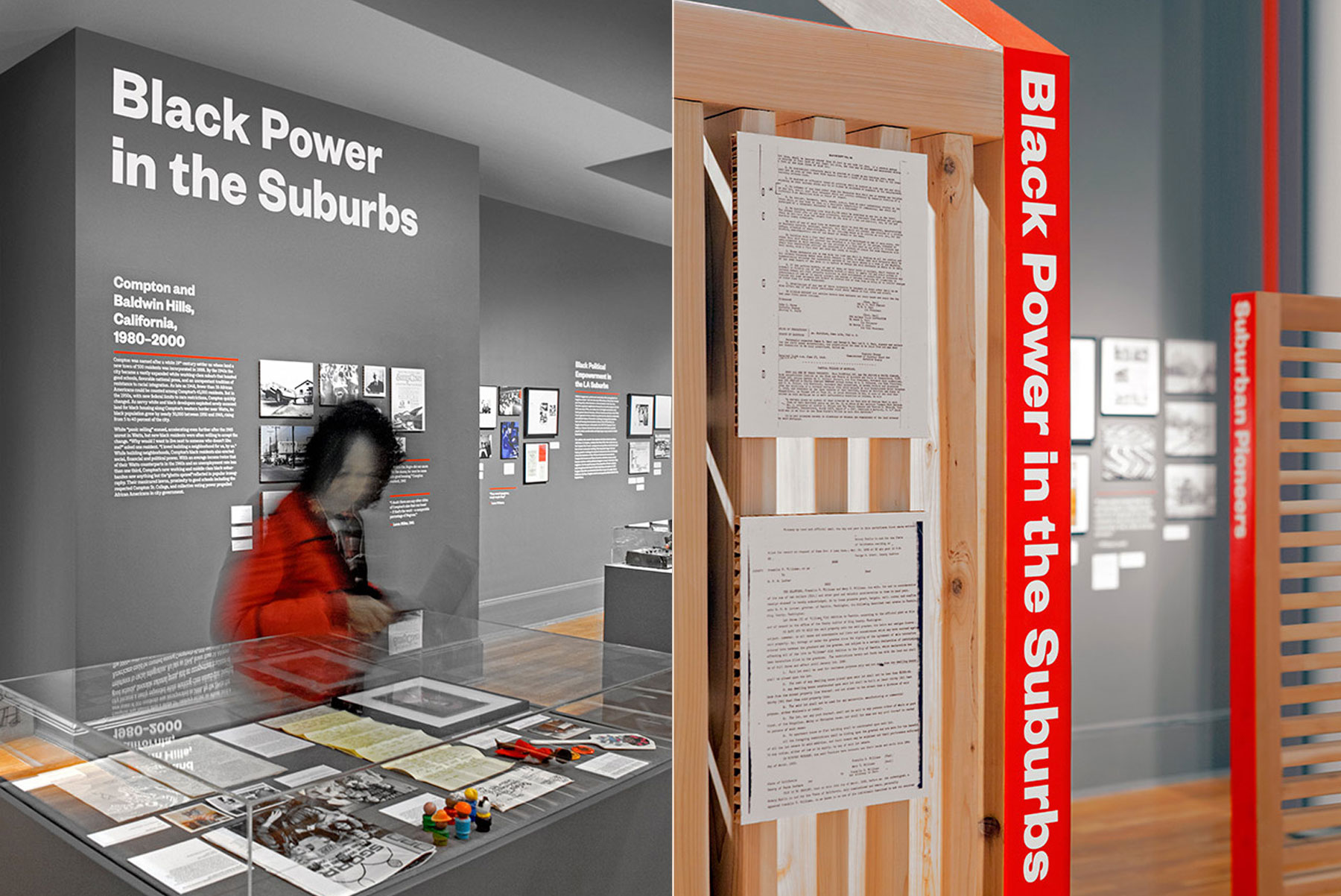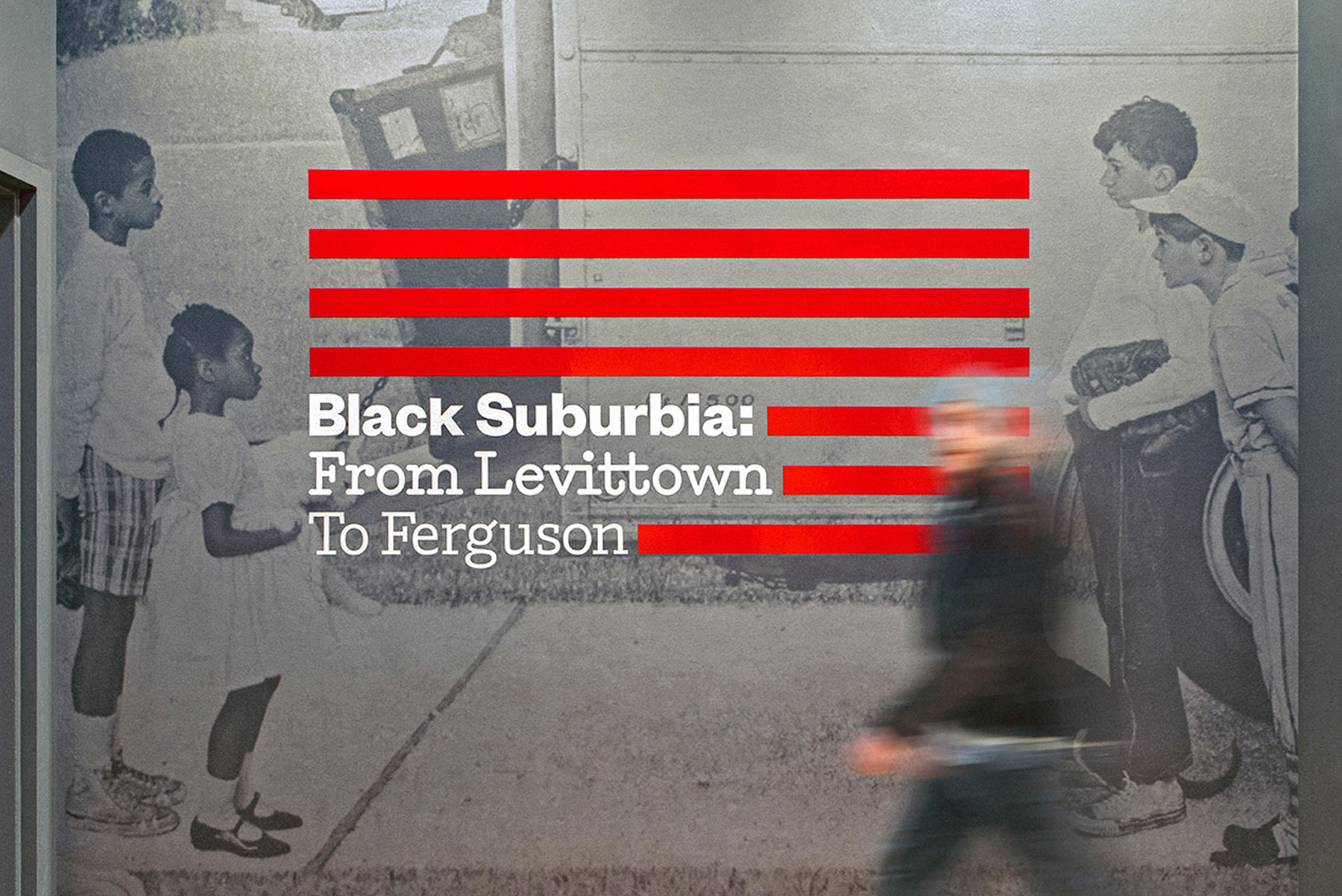 Developed in collaboration with the National Center for Suburban Studies at Hofstra University, Black Suburbia, tackles issues such as suburban segregation, institutional discrimination, and residential racism in black communities from the late 1800s to current day. Opara wanted to stress the severity of these issues in the exhibition’s logo, which sets type within an upside-down American flag. The application references the United States Flag Code, which states that the flag “should never be displayed with the union down, except as a signal of dire distress in instances of extreme danger to life or property.” The red stripes of the flag are echoed throughout the titling of the exhibition.