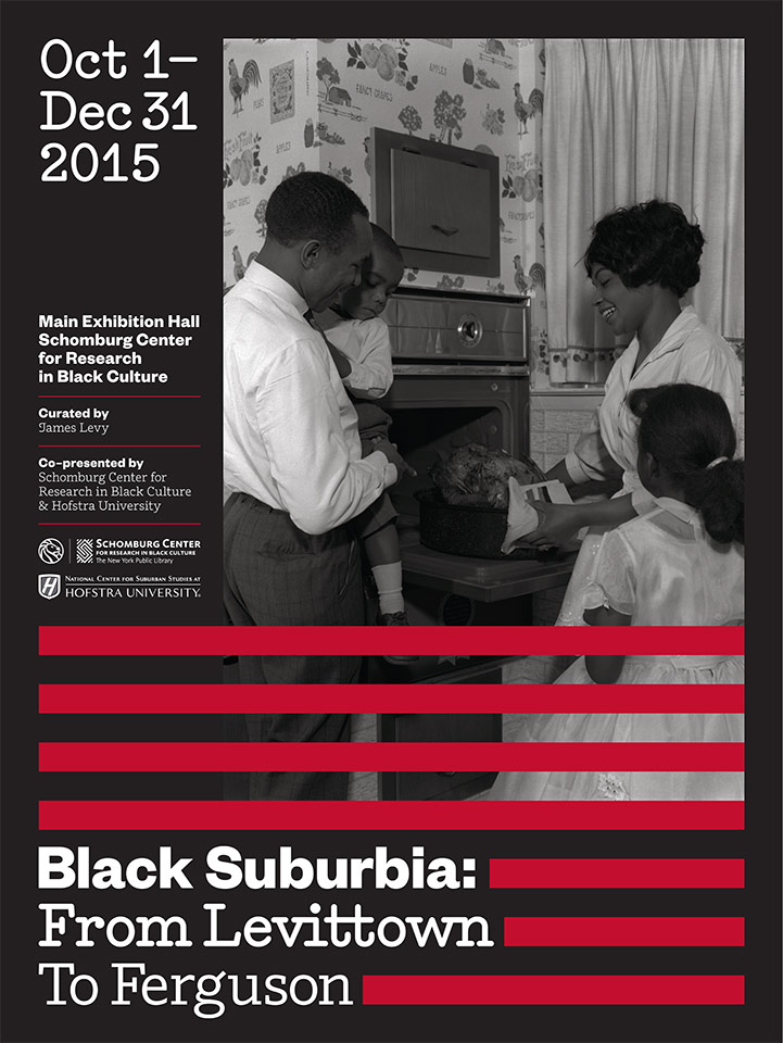 Black Suburbia: From Levittown to Ferguson is an exhibition presented by The New York Public Library’s Shomburg Center for Research in Black Culture, one of the leading institutions focusing exclusively on African-American, African Diaspora, and African experiences. The exhibition examines the complex narrative of the African-American suburb from the 20th century to today, looking to communities such as Hempstead, NY, Ferguson, MO, and Shaker Heights, OH, as case studies for a contradictory yet hopeful dream. Pentagram’s Eddie Opara and team designed exhibition graphics and print materials for Black Suburbia which address the unique triumphs and challenges of the black suburban struggle.