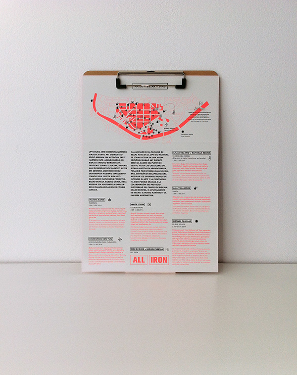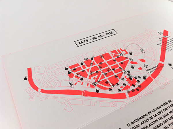 Bilbao Art District (BIAD) is an exhibiton that takes place both in indoor and outdoor spaces around town. On their 2014’s edition, they worked on a small collaboration with the Fine Arts university for which Happyending Studio developed a brochure that would help visitors locate all the students’ proposals that were shown during the event.