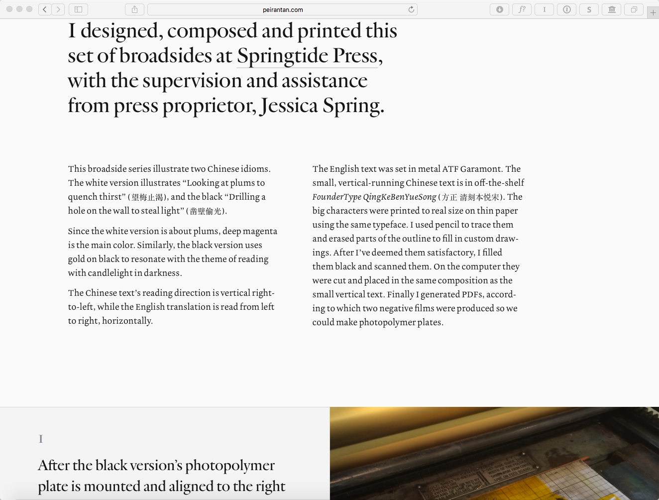 Though not all, many texts that appear on this website were written directly within the design mockup with set leading and measure, solely for the sake of achieving a better unjustified rag without hyphenation, or evenly grey paragraphs in the case of the front page. Body texts are then automatically hyphenated using Mathias Nater’s Hyphenator.