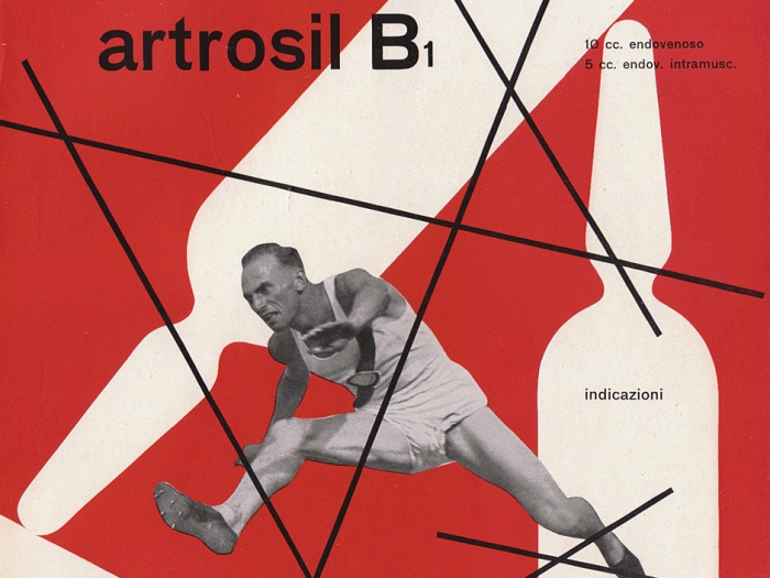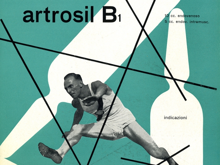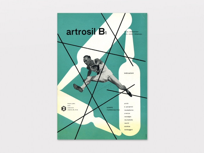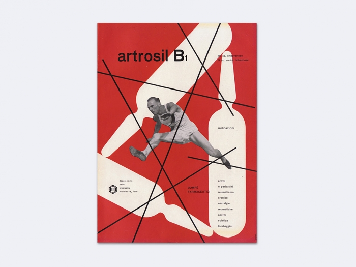 Medical advertisement for Dompé Pharmaceutical (Milan) easily identifiable by repeating ampule silhouettes as background image. “I have attempted to escape from the geometrical and typographical straightjacket imposed by Swiss constructivism and the influence of Mondrian” (The Work of Franco Grignani by Alan Bartram, Typographica 1, June 1960).
