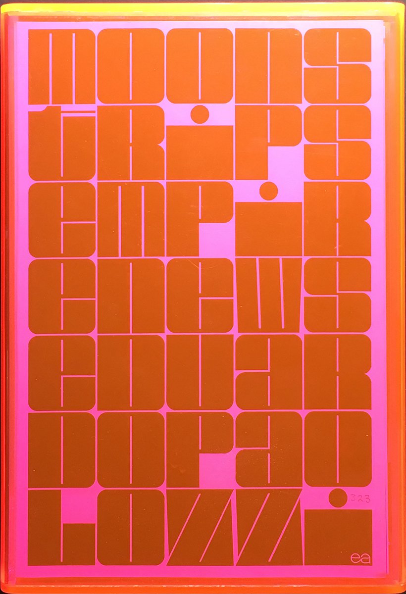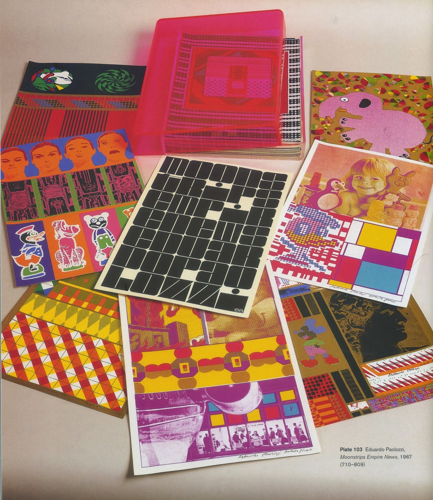 Moonstrips Empire News is a portfolio of 100 (or 98) photo-lithographs and screenprints by Sir Eduardo Paolozzi, a forerunner of British pop art. The prints are contained in a pink Perspex (acrylic) box.