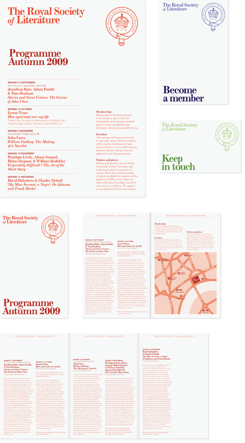 A rebrand of the Royal Society of Literature which has been in existence for almost 200 years and exists to promote British writing and writers. Hyperkit revised its typographic identity – whilst still employing the crest that it has used since its foundation – and designed a range of print material. These use traditional book sizes (such as Imperial Quarto and Crown Octavo) and an offwhite paper stock to give the material more relevance to the subject and its heritage. They also designed and developed a database-driven website with a bespoke Content Management System to allow staff at the RSL to add and edit content. The site features online donations and audio files of many past lectures.