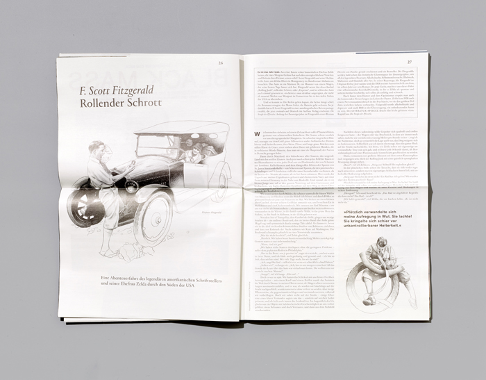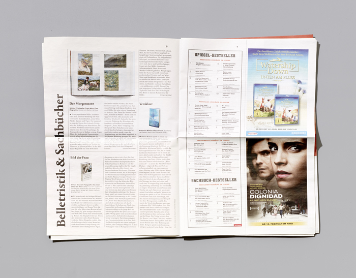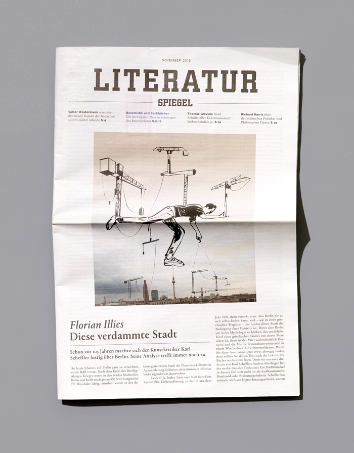 Literatur Spiegel Contributed by Nils Küppers on Apr 20th, 2016. Artwork published in circa October 2015. Illustration: Cyprian Koscielniak. License: All Rights Reserved. Literatur Spiegel is the monthly literary supplement of Germanys biggest news magazine Der Spiegel. Illustration: Christoph Niemann. License: All Rights Reserved. Portrait: Marina Weigl. License: All Rights Reserved. License: All Rights Reserved. Illustration: Jindrich Novotny. License: All Rights Reserved. License: All Rights Reserved. Typefaces More about PortraitGet PortraitMore about Baskerville (Storm)Get Baskerville (Storm)More about Basis GrotesqueGet Basis Grotesque Formats Newspapers (263) Topics News (550) Literature (2983) Designers/Agencies Nils Küppers (3) Der Spiegel (3) Tagged witheditorial design (605)magazine supplements (12)newsprint (155)Der Spiegel (3)rotated type (2175) Artwork location Germany (3785) Hamburg (293) In Setsworthy (greg aponte) (11)Fonts to Get? (Nic Harp) (121) Post a comment Name Email – will not be published Website Your response Submit Comment More Portrait in use The Shining by Stephen King, Bonnier Pocket edition2014David PearsonContributed by Florian Hardwig Staff Pick Sebastian Groes websitec. 2018Alessandro CarossoContributed by Alessandro Carosso An Inconvenient Place by Jonathan Littell and Antoine D’Agata, Russian edition2024Mārtiņš JansonsContributed by Adelina Shaydullina Sponsor More in Literature Paris Polar 20192019Studio Fire WorkContributed by Lucas Le Bihan Kosmikomiksai by Italo Calvino2022Linas Spurga Jr.Contributed by Franziska Weitgruber Staff Pick Cazar la liebre azul zine2024Renée Rodo IunnissiContributed by Renée Rodo Iunnissi Éditions du Félin branding and book covers2019Mathilde DuboisContributed by 205TF More in Newspapers Gonzaï journal Nº12024Quentin HourieContributed by Quentin Hourie Staff Pick Überschatten — Beleuchtung eines Unbekannten2011Sebastian SchichelContributed by DaIstSebastian La Voz de Almería2013Cases i AssociatsContributed by TypeTogether Staff Pick Conquêtes spatiales. Où vivrons-nous demain ?2020Bureau 205Contributed by 205TF More Fonts In Use In-use examples from Bauer Corvinus brochurec. 1935unknownContributed by Stephen Coles Staff Pick Konstfrämjandet websitec. 2015Konst & TeknikContributed by (Harald) Peter Ström Staff Pick Dutch Design Week 2021: The Greater Number2021ThonikContributed by The Foundry Types Staff Pick Mel Bay’s Chords in Picture and Diagram Form series (c. 1973–1976)c. 1973unknownContributed by Florian Hardwig Staff Pick
