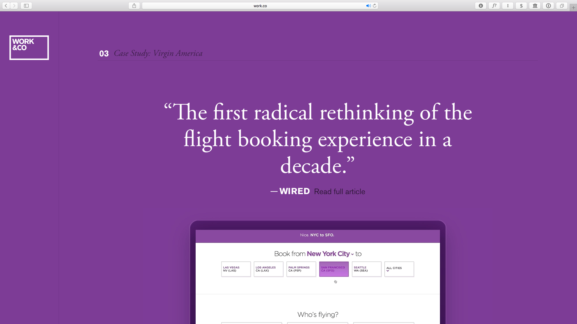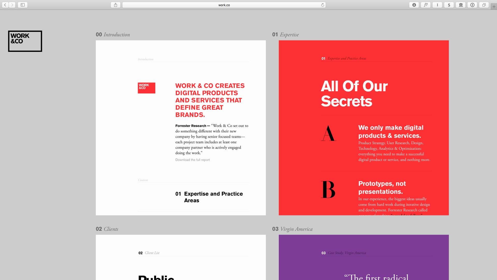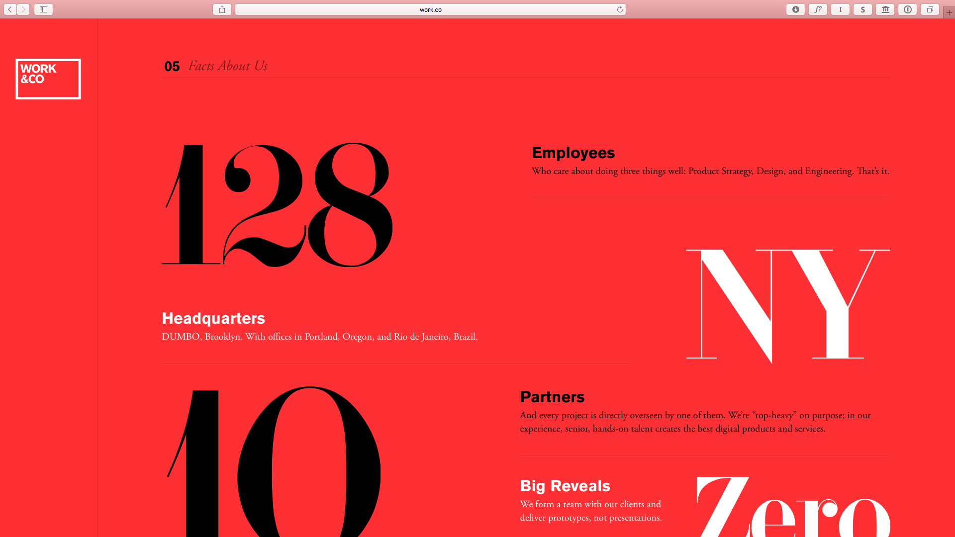 Work & Co. is a digital product design agency with offices in New York, Portland, and Rio de Janeiro. Recently its most famous project was the redesign of Virgin America. Both Akzidenz-Grotesk and Adobe Garamond are served through Typekit. The Didone bits are embedded as svgs and appear to be in Domani CP, a digital version of ITC Didi.