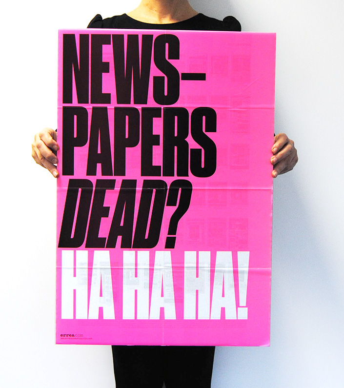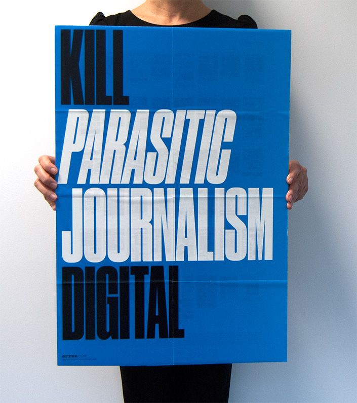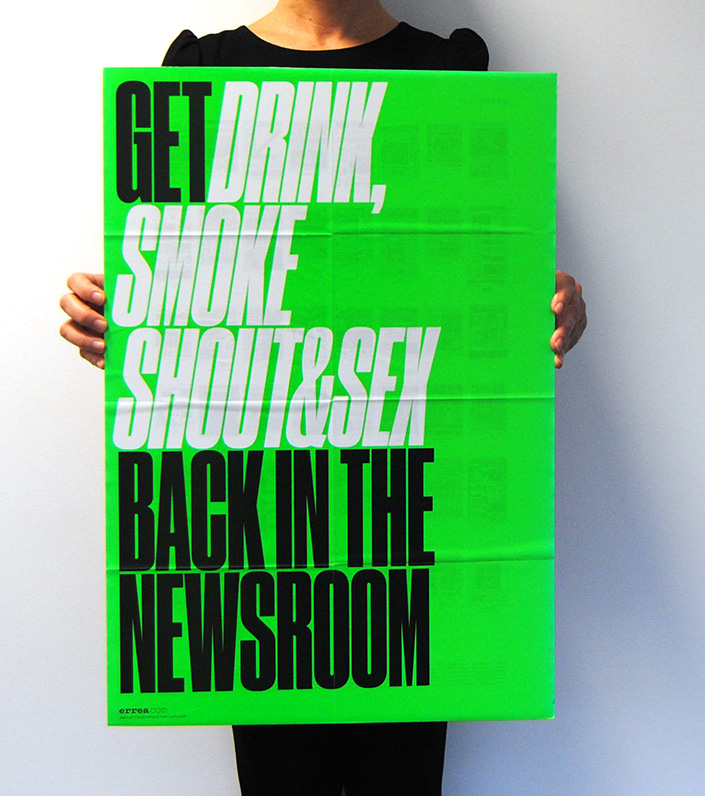 Politically incorrect posters Contributed by errea comunicacion on Apr 25th, 2016. Artwork published in circa October 2014. Source: www.erreacomunicacion.com Photo: errea comunicacion. ©erreacom. License: All Rights Reserved. Artwork by errea comunicacion. Newspapers dead? Ha ha ha! A small tribute that Errea Communication wanted to pay to all the newspapers during the Annual Workshop held by the Society for News Design in Frankfurt, 2014. We also printed notebooks and stickers of each poster. Photo: errea comunicacion. License: All Rights Reserved. Artwork by errea comunicacion. Get Drink, Smoke Shout & Sex back in the newsroom Photo: errea comunicacion. License: All Rights Reserved. Artwork by errea comunicacion. Kill Parasitic Journalism Digital Source: www.erreacomunicacion.com Photo: errea comunicacion. erreacom. License: All Rights Reserved. Artwork by errea comunicacion. Paper is the New Shit Typefaces More about Druk CondensedGet Druk Condensed Formats Posters/Flyers (5693) Topics News (550) Graphic Design (2982) Designers/Agencies Javier Errea (4) Tagged withall caps (7495)series (1153)neon/fluorescent/phosphorescent colors (223)about newspapers (1) Artwork location Spain (1039) Pamplona (10) In Setsinso (Brendan Conroy) (12)visiones (Savannah Taylor) (4)UWUWB (Liselle Ewing) (76)Favorites (Liselle Ewing) (54)Entertainment Business (Liselle Ewing) (55)[1] (Ivan Ilic) (172)PosterSet (Chris Z) (13)fresh (Alex Amani) (7)DRUK (Angelica Oliveros) (4)SPOTIFY (Daniel Cannizzo) (30)Vison Board (C P) (136) 1 Comment on “Politically incorrect posters” Joe Towsey says: Sep 1st, 2019 11:56 am Super Nice work. Well done you, I love these! Post a comment Name Email – will not be published Website Your response Submit Comment More Druk Condensed in use Kunsthaus Dresden: Social Motions / Demotape / German Angst2014Pascal StorzFabian BremerContributed by X-Ray Charles Staff Pick Lizdo Sezono Atidarymas2018Domantė NalivaikaitėContributed by Cristiano Trapani Staff Pick Dramaturgias #1, Sesc2019Tereza BettinardiContributed by Tereza Bettinardi Staff Pick Sponsor More in Graphic Design Collected Works guest lecture at SVA2019Jack RoizentalContributed by Jack Roizental The Most We Can Do Is Our Best2011David PearsonContributed by Stephen Coles Elias Tinchon portfolio website2020Elias TinchonContributed by Alain Papazian Apart2018Afloat StudioContributed by WELTKERN® Typefaces More in Posters/Flyers Snoop Dogg + Google Translate posterc. 2018Giulia BoccarossaContributed by Giulia Boccarossa Hürlimann beer poster1983Contributed by Philipp Messner Ibsenfestival 20162016Andreas Red SkilhagenGøril Johnstad HansenContributed by JAF MIT fundraising campaign20167d8Contributed by Swiss Typefaces Staff Pick More Fonts In Use Rūlo2022Studio FuriousContributed by Studio Furious Staff Pick Jané Winestore Expo-Licorc. 2019Pablo RovaloSingular GlassContributed by Pablo Rovalo Staff Pick State Theatre Company South Australia 2018 season2017Frame CreativeContributed by Gareth Hague Staff Pick Hera nei Campi2023MultiverseContributed by Margot Lévêque Typefaces Staff Pick