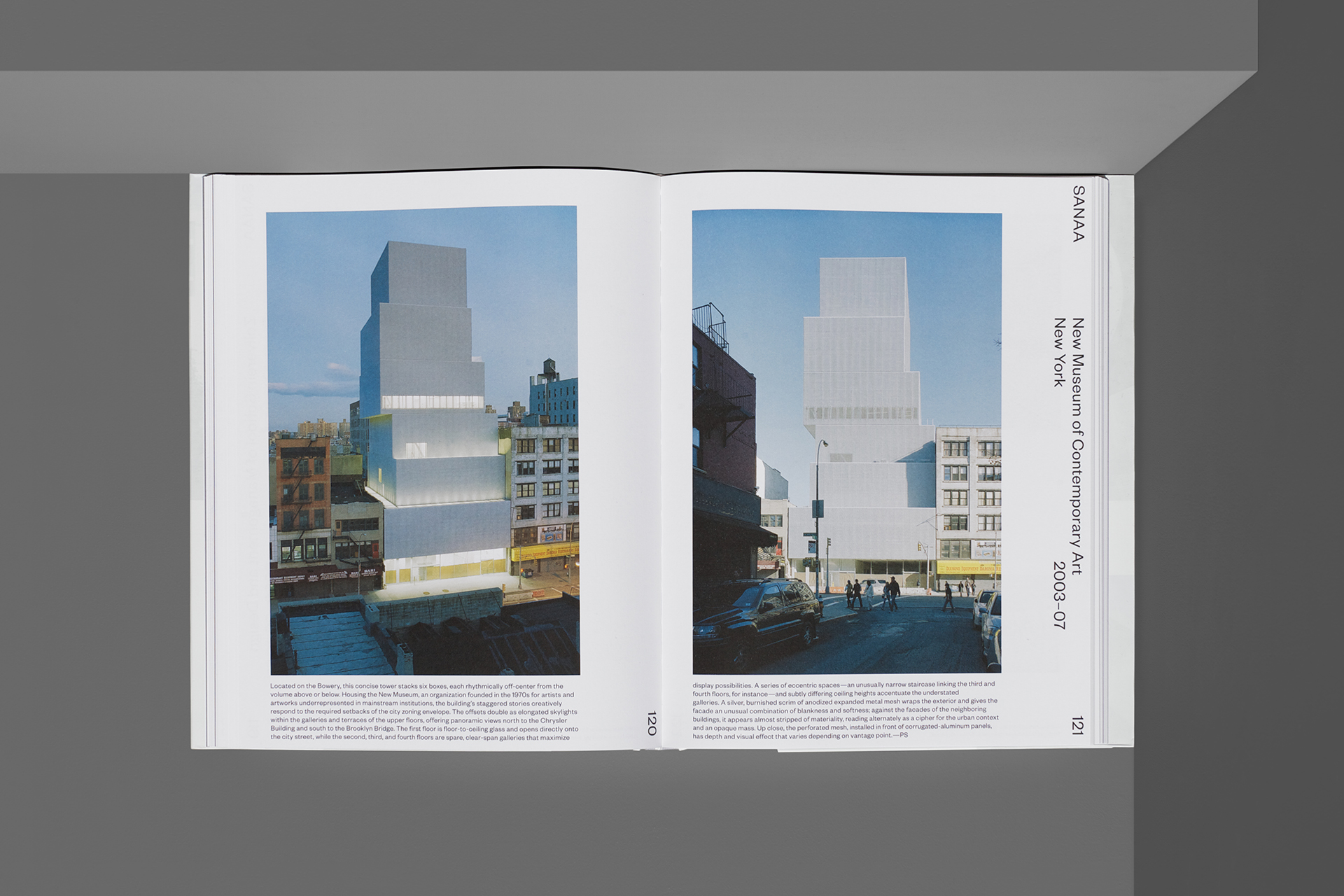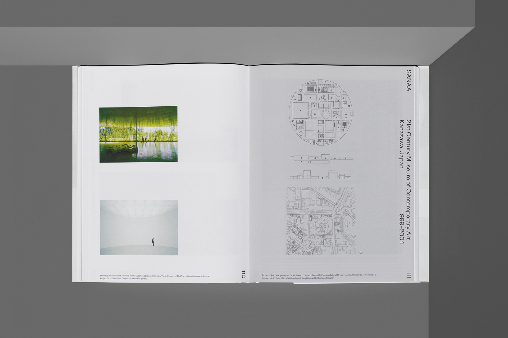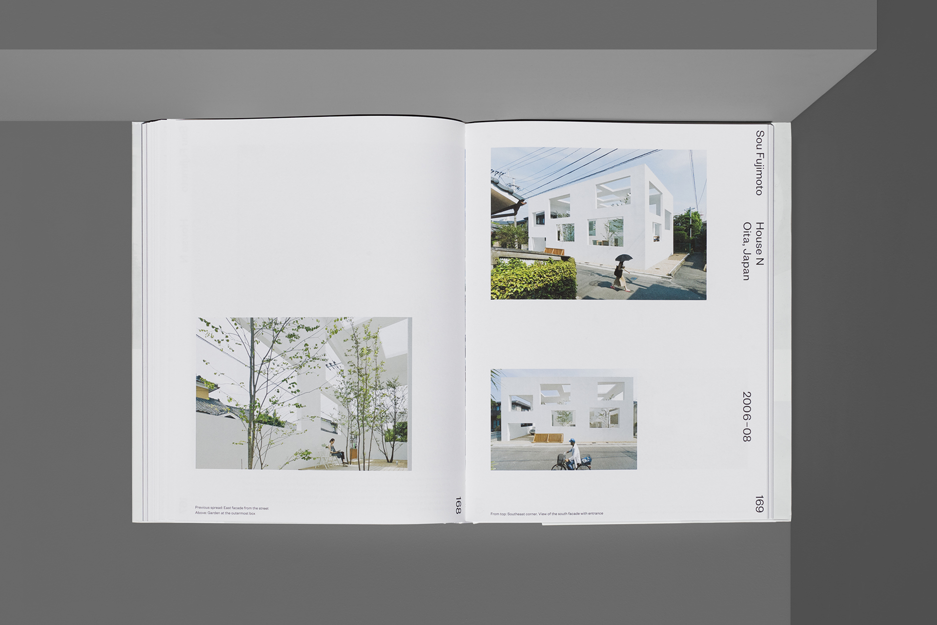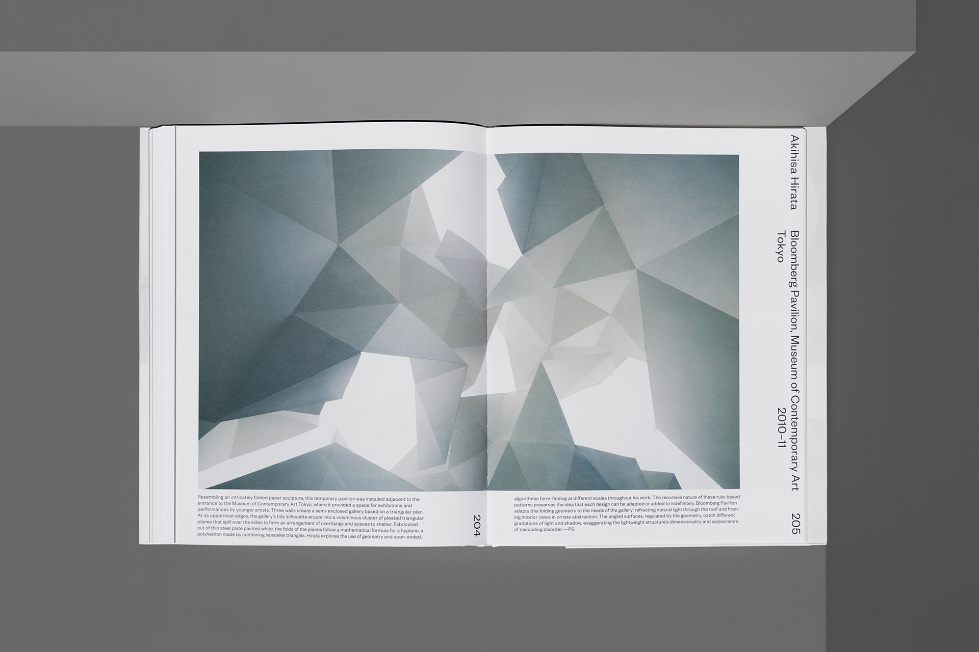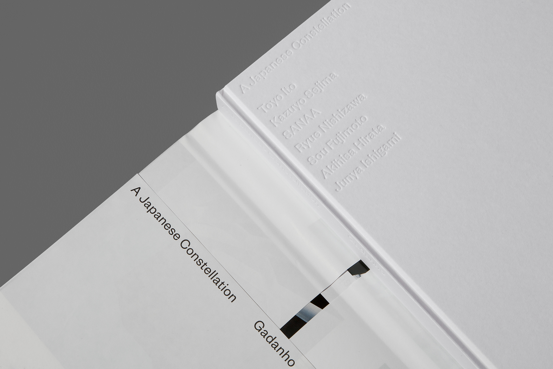 Concerned with notions of transparency and lightness, the book utilizes a color palette of gray and white. Referencing this “constellation”, its cover is wrapped in translucent matte white paper, with project images printed in color on its glossy reverse. Translucent glossy paper separates each chapter, divided by architect; included essays are printed on gray paper; texts are inversely set in white in Founders Grotesk.