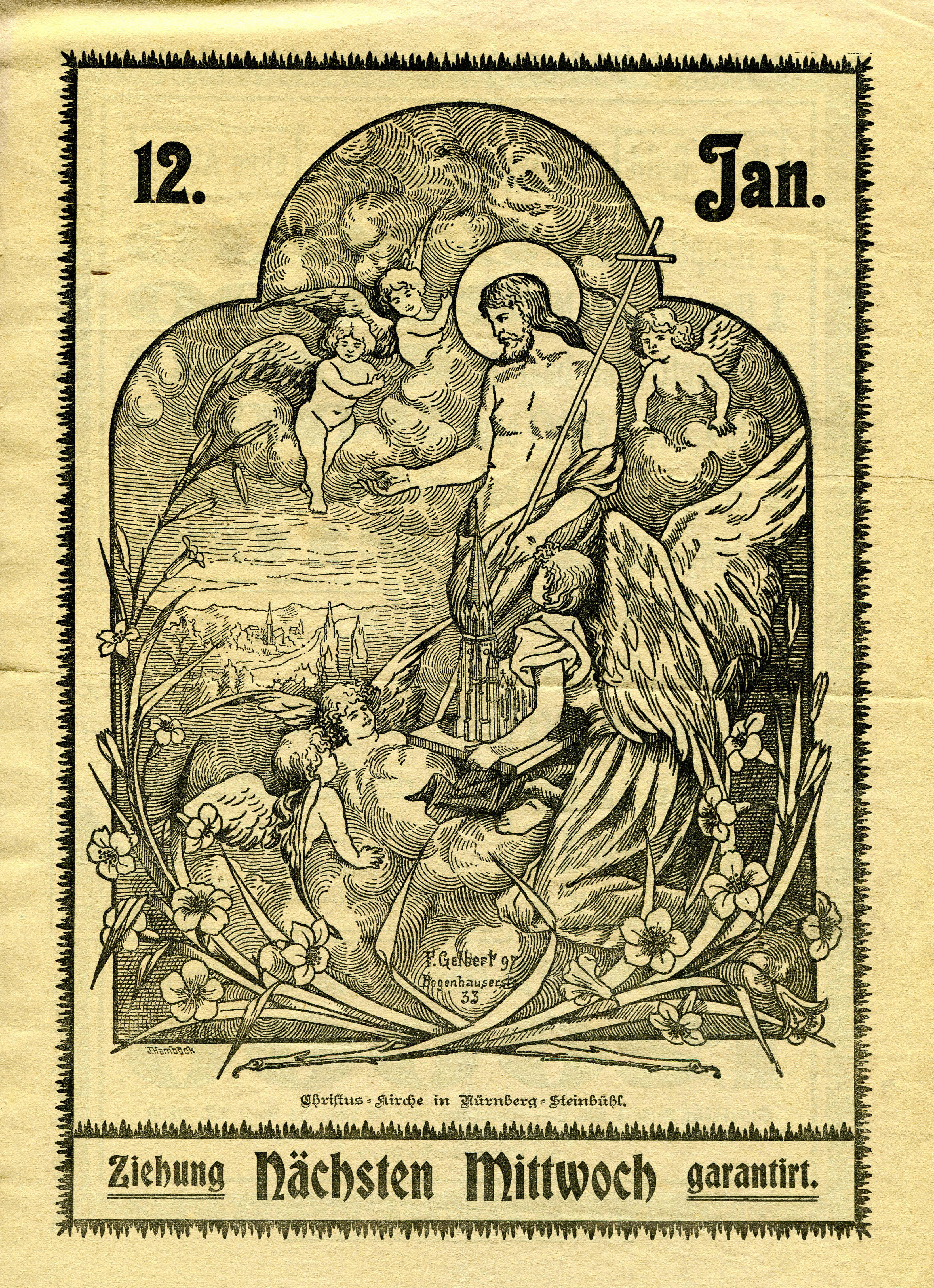 The lottery was organized in favor of the Christus-Kirche in Nuremberg-Steinbühl. The foundation stone of this church was laid in 1891, and built by David Röhm in the style of Burgundian Early Gothic until 1894. The depiction of Jesus Christ with an angel holding a model of the church is signed by “F. Gelbert (18)97 Bogenhauserstr. 33” (the artist) and “J. Hamböck” (= Graphische Kunstanstalt Johann Hamböck, Munich; in backslanted angular letters).