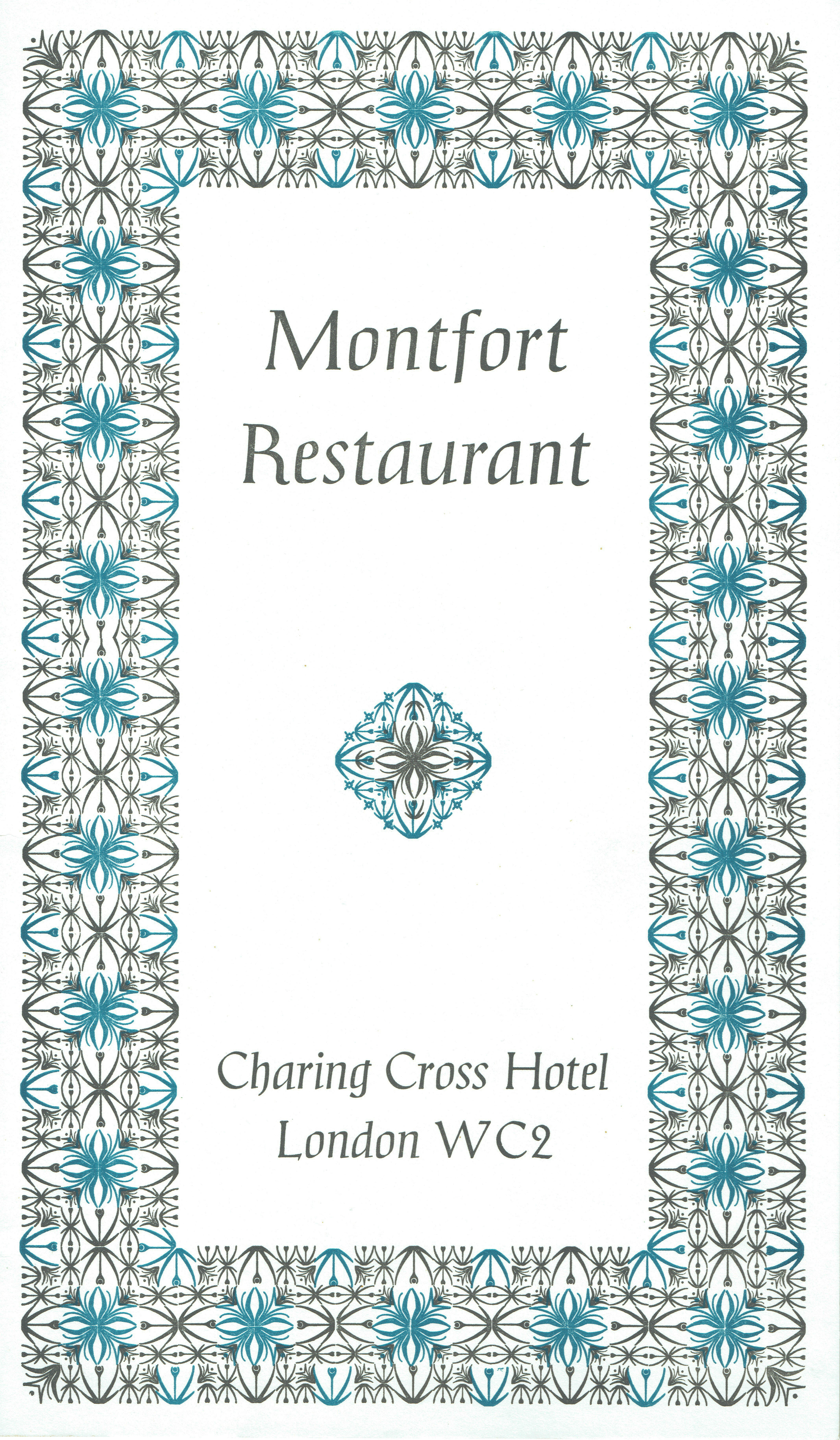 British Transport Hotels – Montfort Restaurant, Charing cross Hotel, London WC2 – menu card from 1967, printed at Curwen Press. Another in the fine series of BTH menu cards – to their house style and printed at the exemplary Curwen Press at Plaistow in east London.