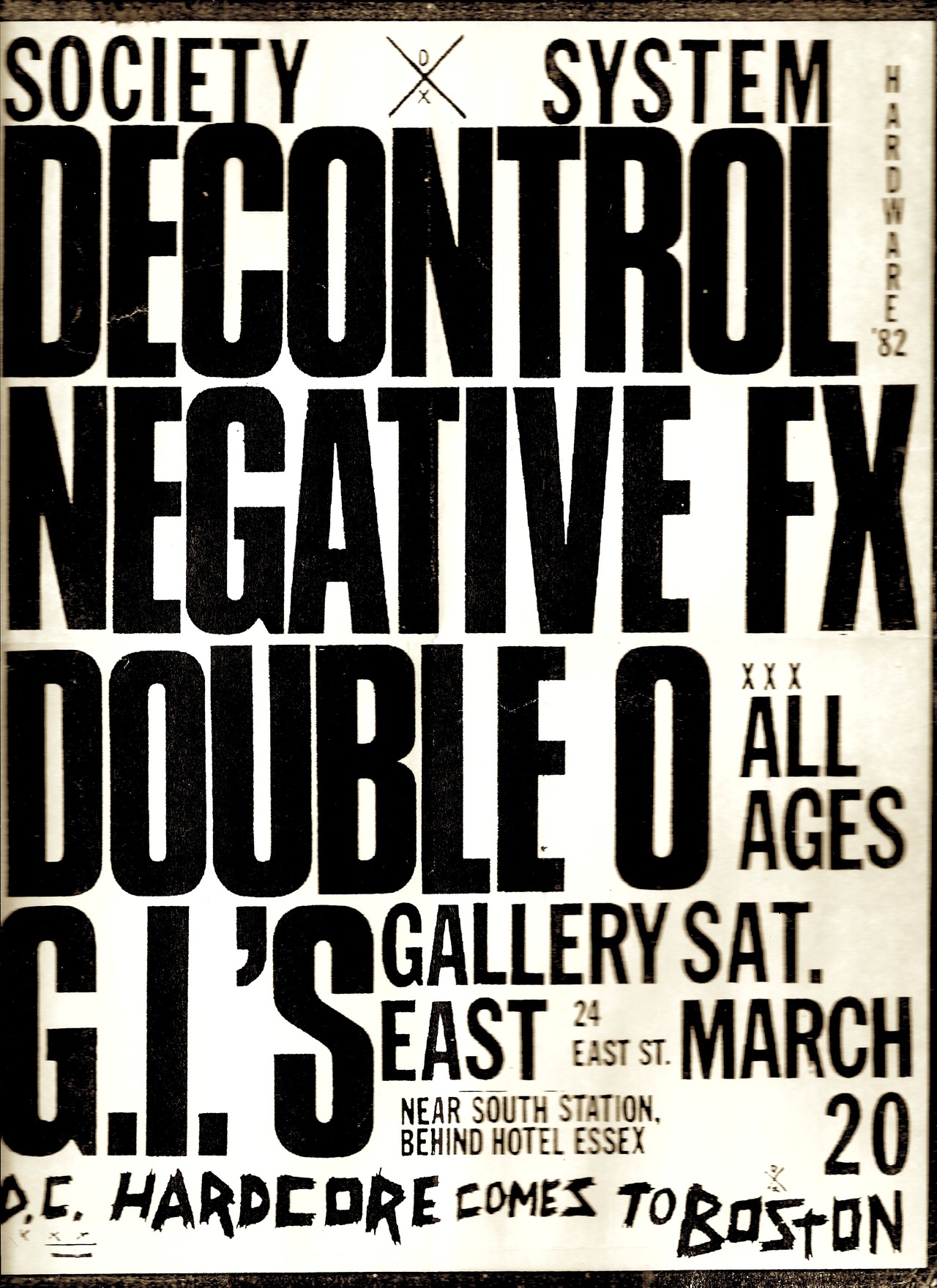 SSD, Negative FX, Double 0, and G.I.’s show flyer Contributed by Nick Sherman on May 13th, 2016. Artwork published in March 1982. Source: mainthreat.tumblr.com License: All Rights Reserved. Flyer for an all ages straightedge hardcore punk show on March 20, 1982, at Gallery East in Boston, featuring Society System Decontrol, Negative FX, Double O, and Government Issue. Typefaces More about CompactaGet CompactaMore about Franklin GothicGet Franklin Gothic Formats Posters/Flyers (5697) Topics Music (6278) Tagged withpunk rock (81)concert & gig posters (509)photocopied (15)dry transfer lettering (156)only type (1271)all caps (7502)all caps Franklin (79)black and white (2003)straight edge (2)big type (1718)stacked lines (227)1980s (668)crude production (31)hardcore punk (17)flyers (346)wall of type (258)tight letterspacing (865)tight linespacing (348) Artwork location United States (9840) Boston (102) In SetsFall2016 (Shannon Young) (42)posterx (Leonardo de la Fuente) (42)Franklin Gothic Condensed & Extra Condensed (Nick Sherman) (145)goth (Emma Ramberg) (7)Poster (Luana Fonts InUse) (48) Post a comment Name Email – will not be published Website Your response Submit Comment More Compacta in use Payy single covers (2021)2021Julian GrönbergSimbayu StudiosContributed by Julian Grönberg Dancing to a Higher Place2018Ross Paul McEwanContributed by Cristiano Trapani Omar Rayo exhibitions catalogues and posters (circa 1972–1985)c. 1972Museo La TertuliaunknownContributed by Jorge Iván Moreno Majul Staff Pick Sponsor More in Music A Musical History of Jazz album art1956David Stone MartinCasper Pinsker, Jr.Photo(s) by Bart Solenthaler on Flickr. “3 ans du Montezuma” poster2022Studio JimboContributed by Ethan Nakache Koyil & Polam poster2020Anna KulachekContributed by Nick Sherman “Spicy Boyfriend” – Shawn Wasabi cover art2019Jack GrimesContributed by Jack Grimes More in Posters/Flyers Tarot instruction manual2019Ana Belén AgüeroContributed by Ana Belén Agüero Hardcore Hell 20192019Lauren N. BaileyContributed by Lauren N. Bailey The Business of War2015Jonathan BarnbrookContributed by Florian Hardwig Melon Diesel – La Cuesta De Mister Bond, 25 Year anniversary concert2024Kenshō AgencyNicholas Naughton-RumboCharles PonsContributed by Kenshō Agency More Fonts In Use Industrial Design Magazine (1955–63)1955James S. WardMathilde LouriePeter BradfordContributed by Stephen Coles Staff Pick Guitar Chords and other sheet music booklets (Centerstream)1984unknownContributed by Florian Hardwig Staff Pick 1870. Sur les traces des insurgés2021CRC StudioContributed by CRC Studio Staff Pick AnOther magazine, issue 35 “Fearless”, A/W 20182018Diego FellayChloé B. RombaldiMarc AscoliContributed by Out of the Dark Staff Pick