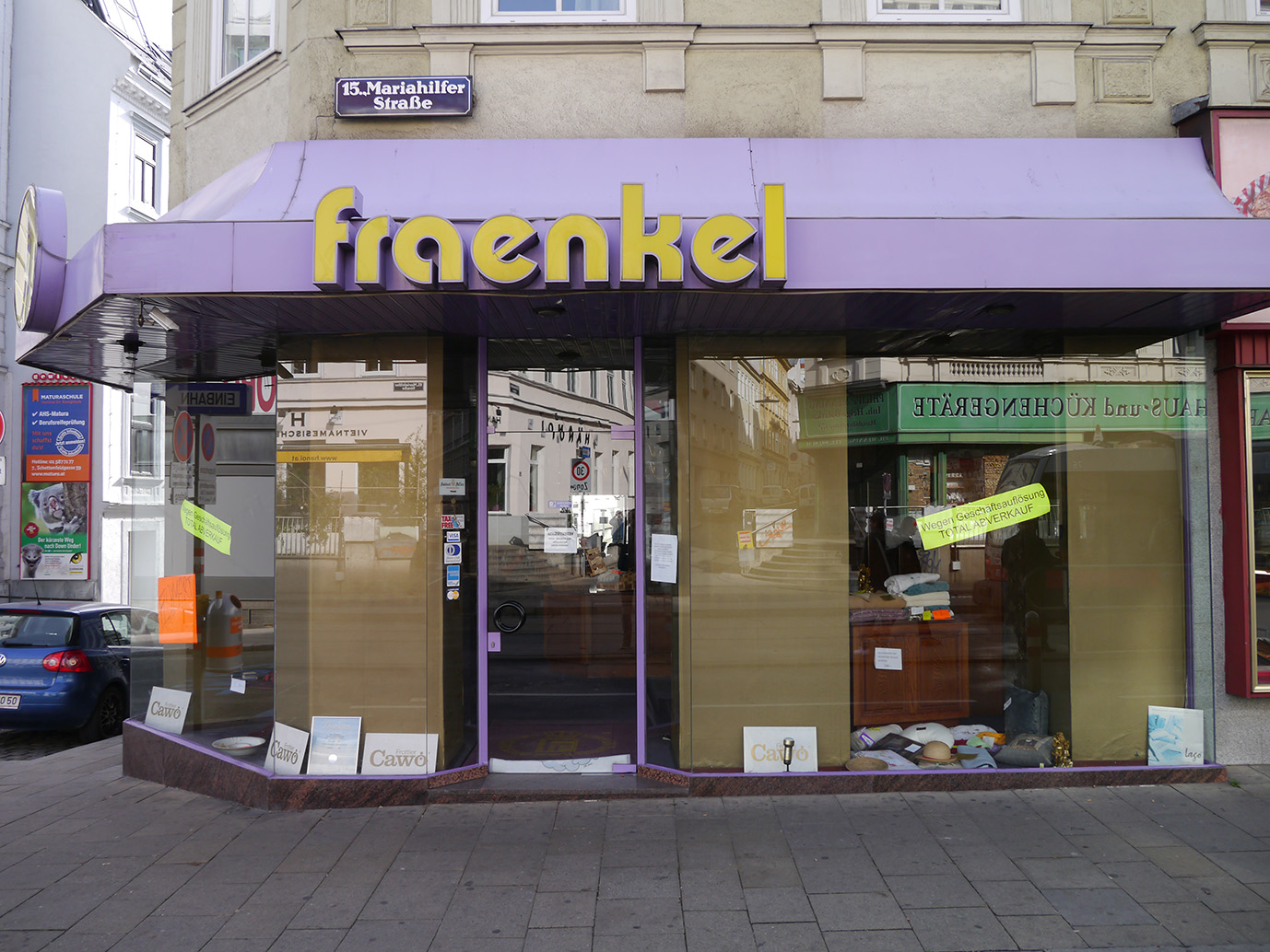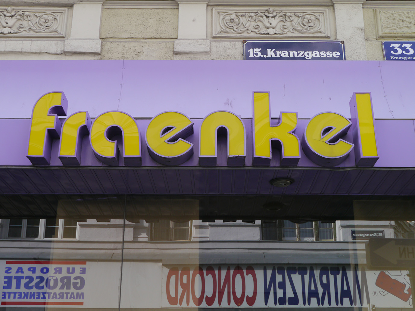 Fraenkel was a bedding store that opened up in 1981 in Vienna’s 15th disctrict. The signage used Expressa with minor alterations to the 'a’ and 'e’. After the close-down in 2013 the sign was dismounted and added to the collection of Stadtschrift, the association for the collection, preservation and documentation of historical facade signs.