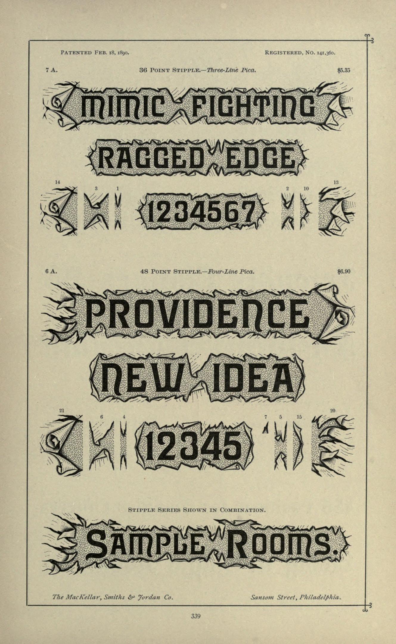 The lettering, background, and torn paper effect are all produced by an unusually elaborate typeface called Stipple by the most prolific 19th-century designer of ornamental type, Herman Ihlenberg. He patented it in 1890, and Mackellar, Smiths & Jordan showed in their 1892 catalog, below.