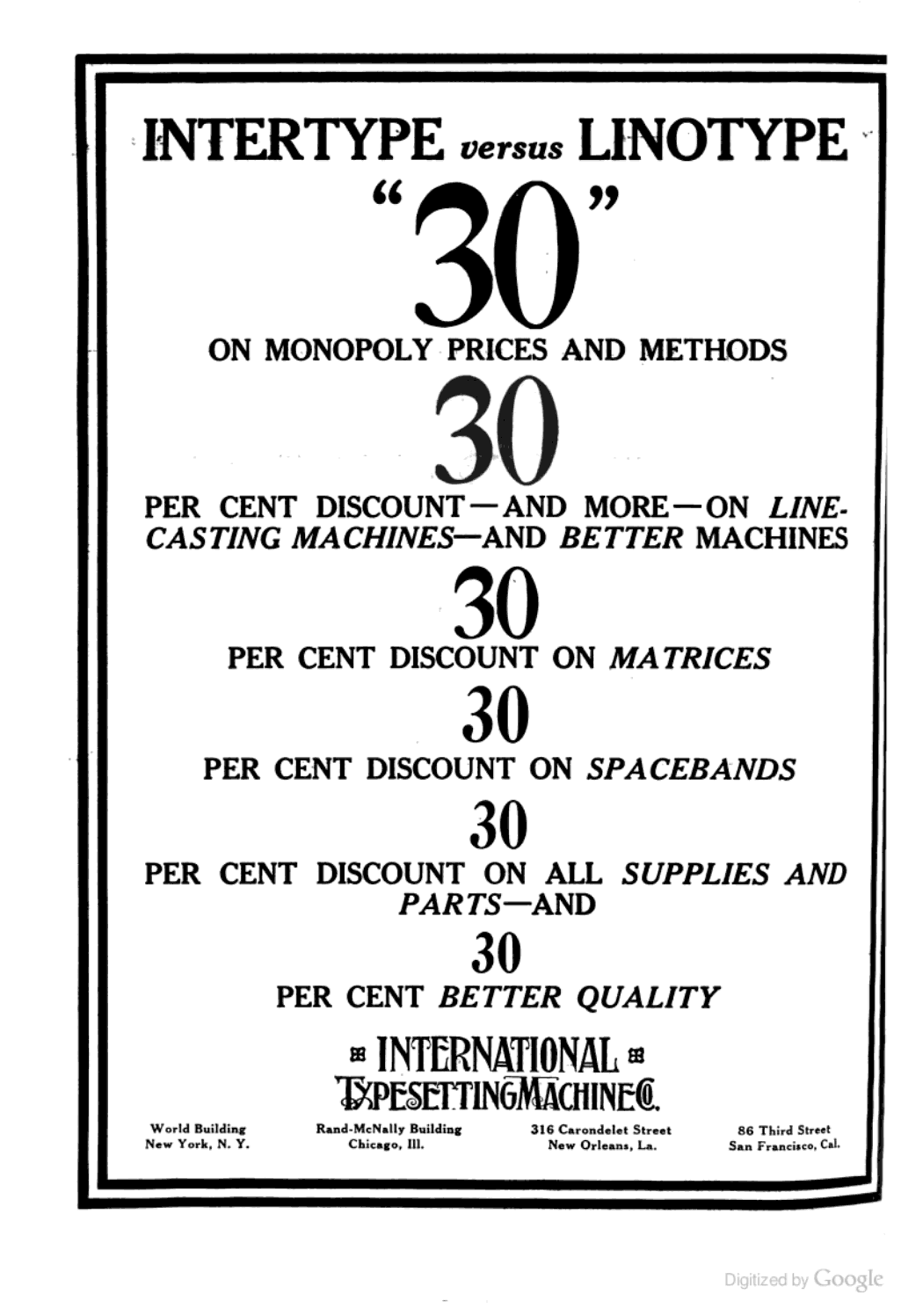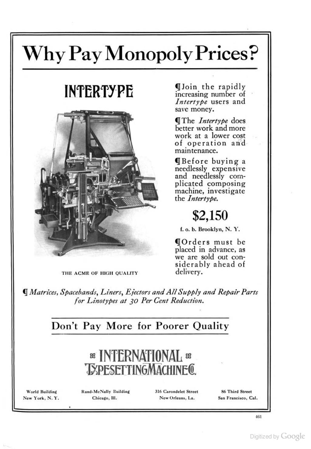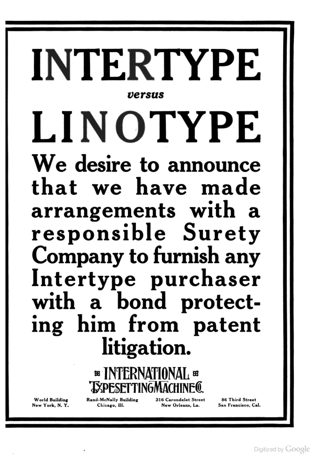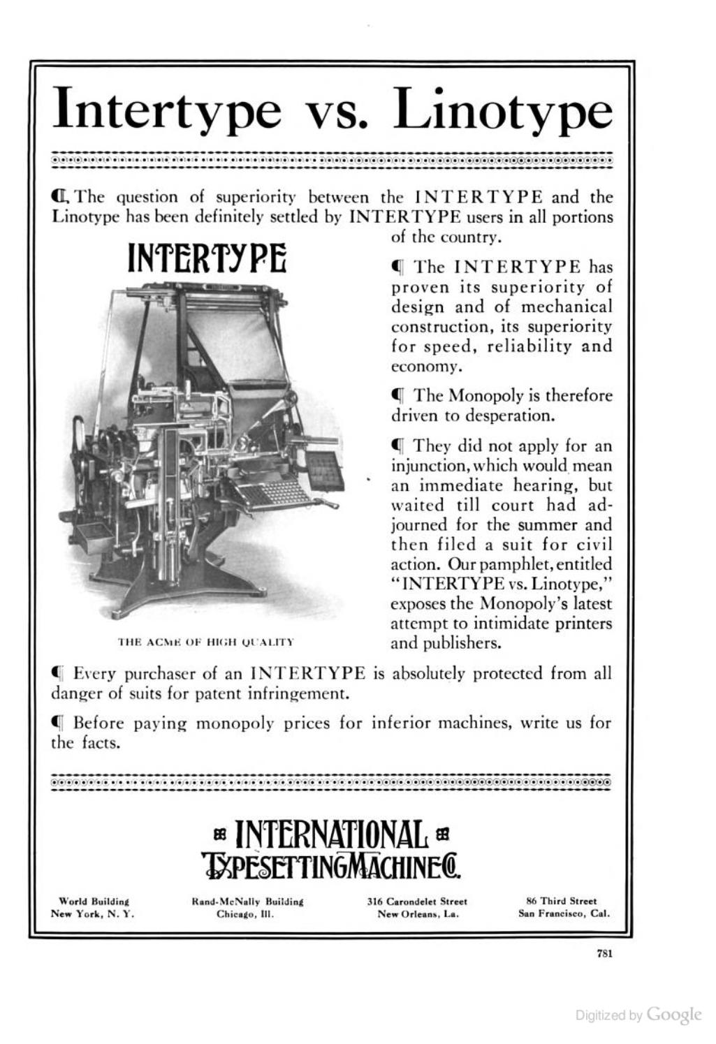 Intertype placed several brash advertisements in The Inland Printer during the trade magazine’s 1913 run. The first ad is a direct response to Linotype’s claim of patent infringement. In a slightly ironic twist, some of the ads (below) use the same typeface as Linotype’s ad, Caslon 3.