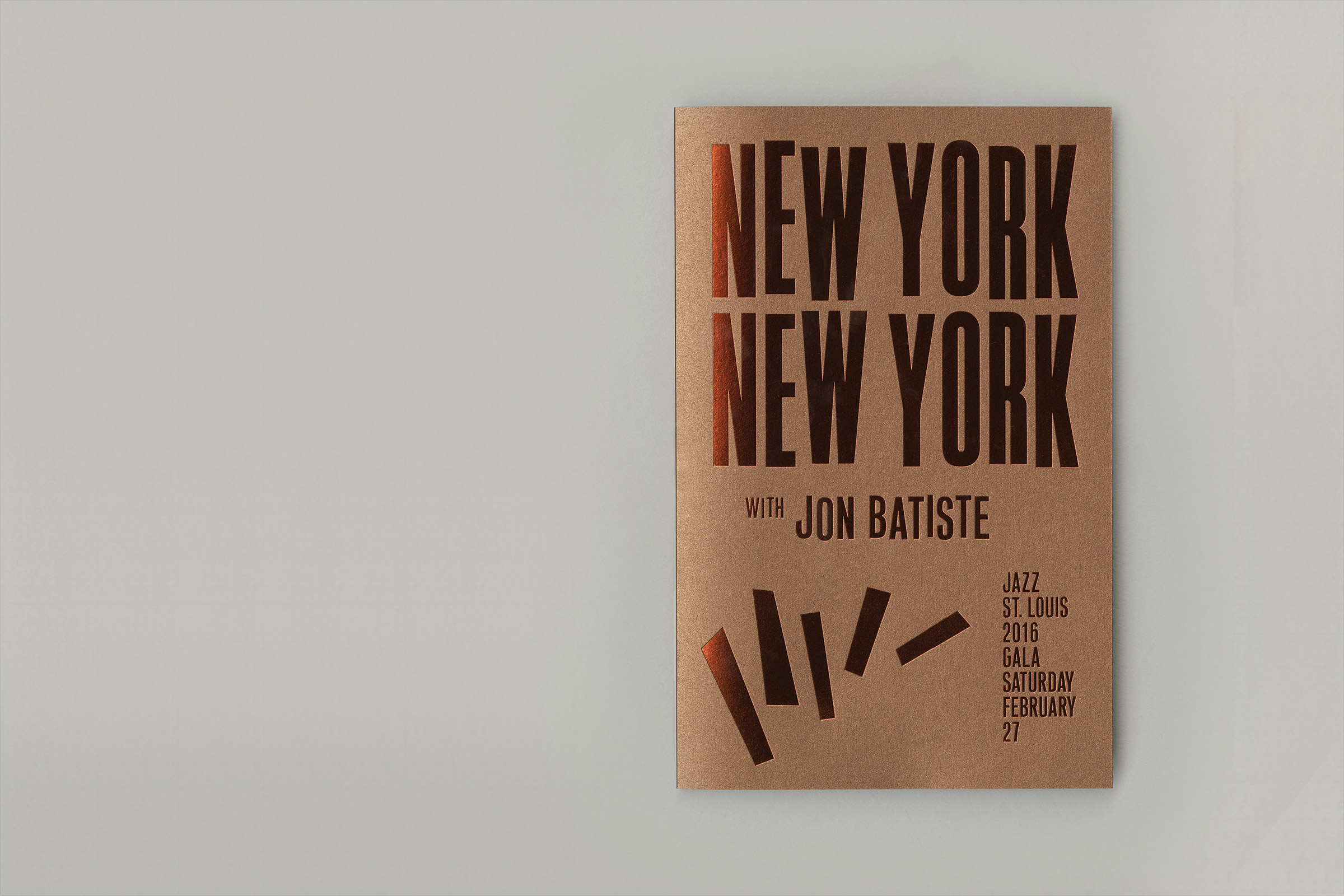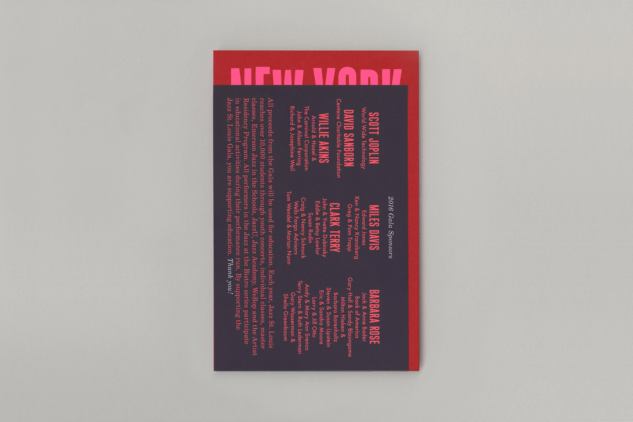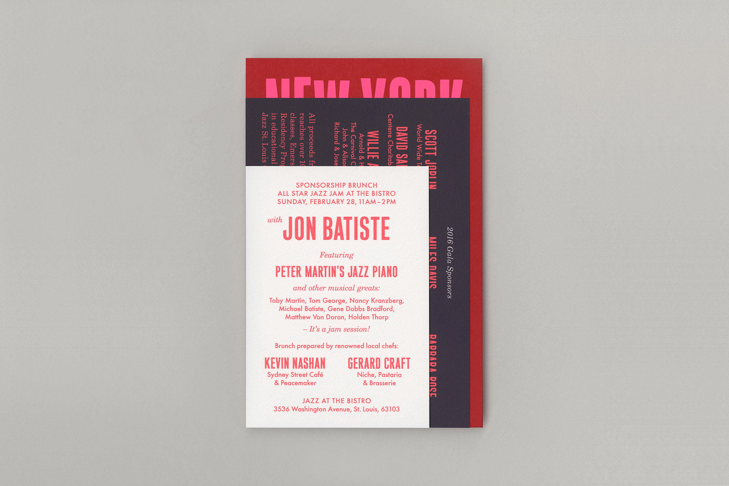 The design for the event’s invitation and program is a contemporary take on classic jazz graphics, using silkscreened neons for the invite and a tone-on-tone bronze foil for the program cover.