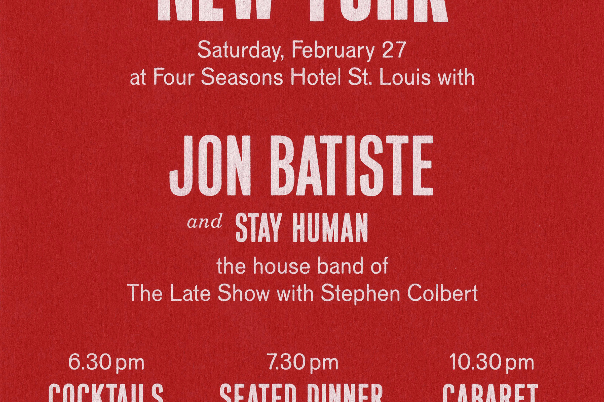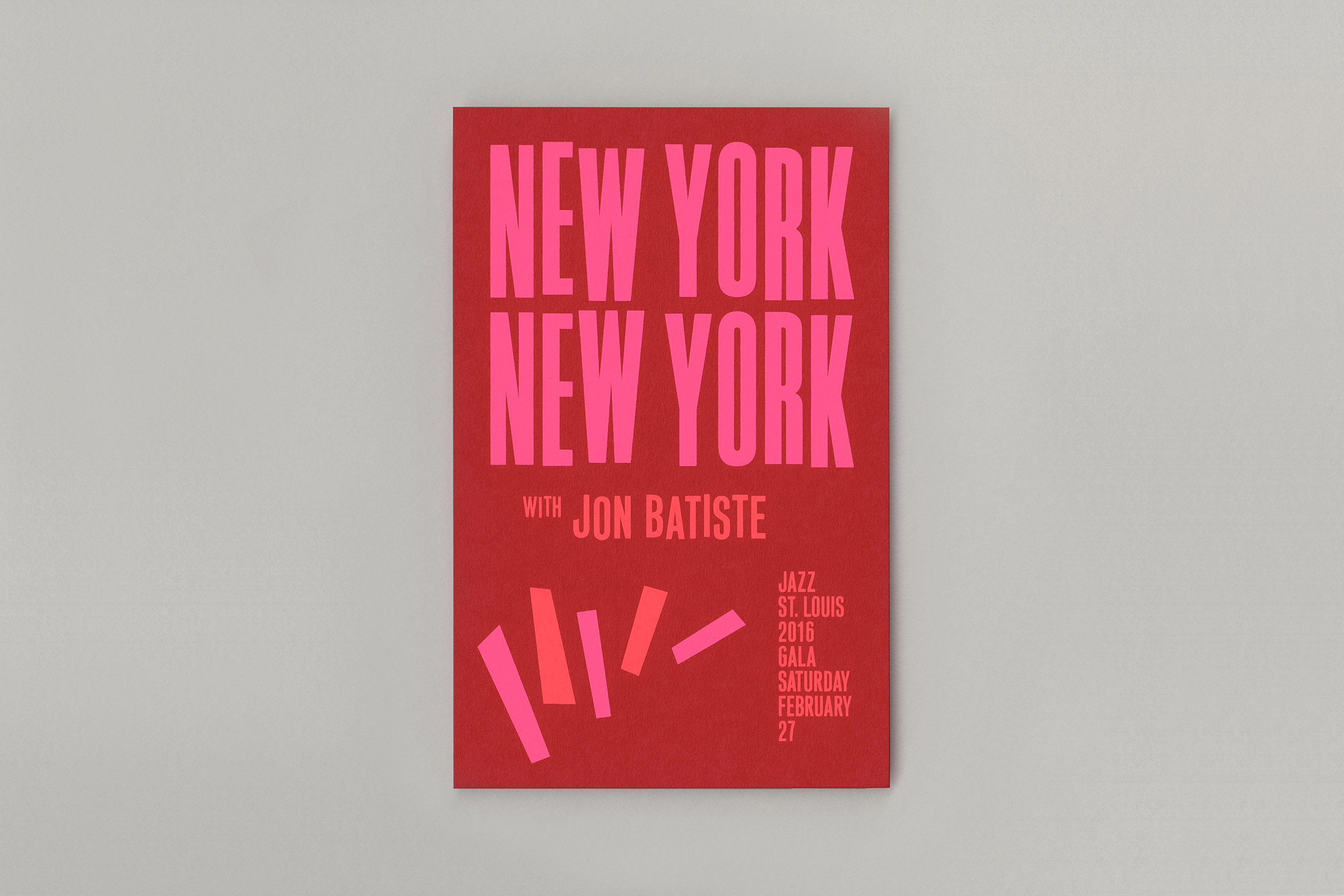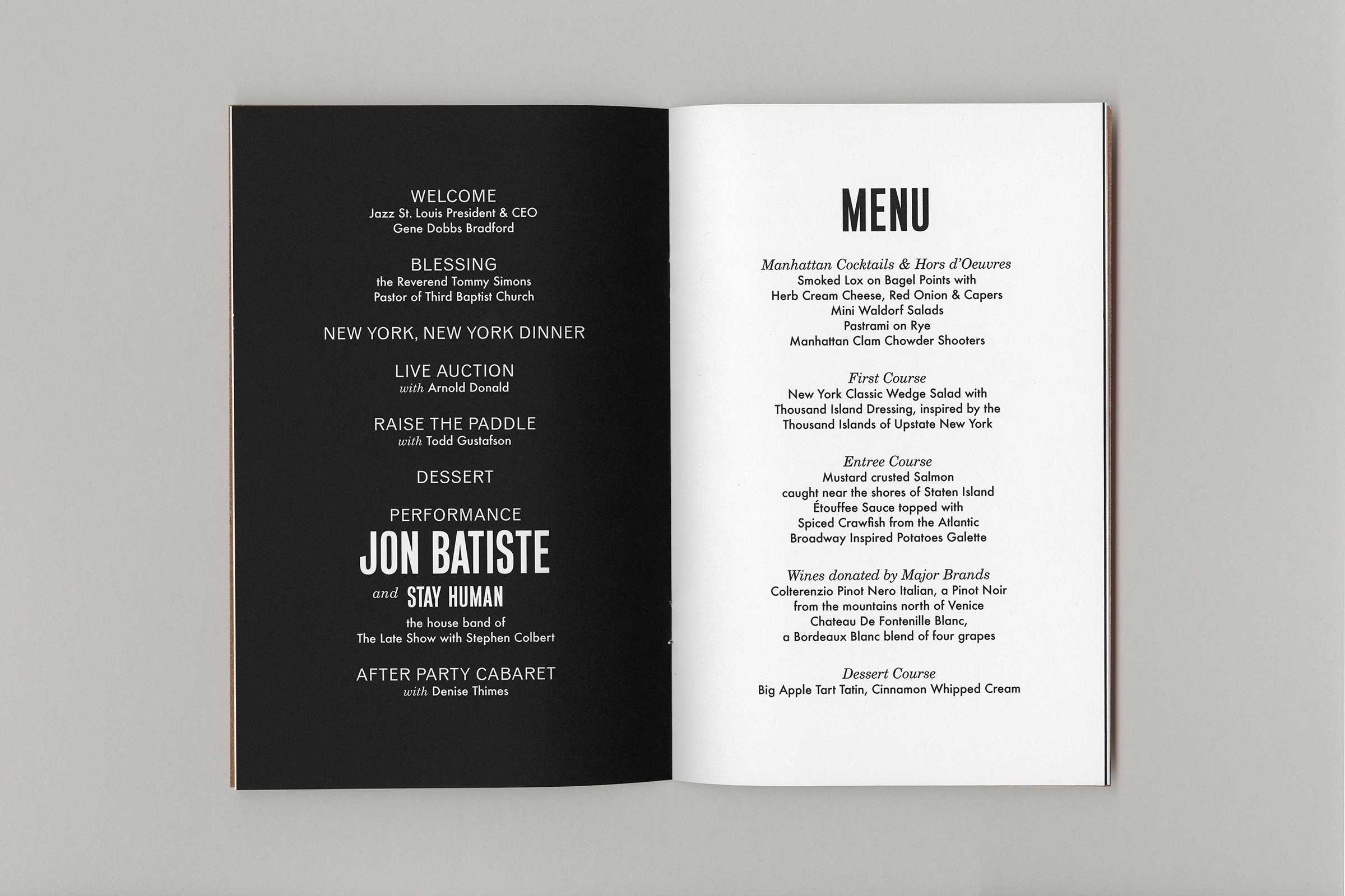 The design for the event’s invitation and program is a contemporary take on classic jazz graphics, using silkscreened neons for the invite and a tone-on-tone bronze foil for the program cover.