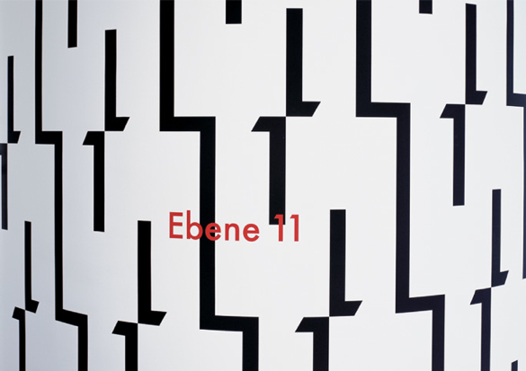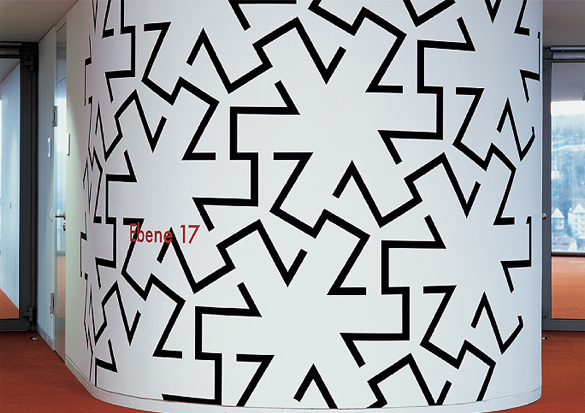 “nineteen storeys, and nineteen times the same story: the same door, the same wall, the same floor. the only unmistakable element is the graphic wall-covering. the figures that make up the number of each floor are combined in graphic patterns that decorate the curving walls. they tell me: i’m at the right level.”