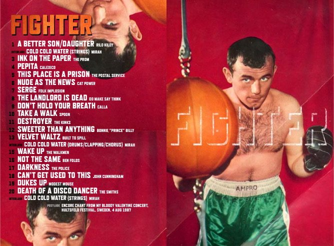 My last few months in Stockholm were filled with bitterness and angst, fueled by self-imposed isolation and four hours of sunlight per day. The only cure was a mix CD full of cathartic music. Here is the cover, sized for Jewelboxing’s King Size cases. The art is a page ripped from a book I found at a Stockholm bar called The Library. Just discovered tonight that the dude is a Swedish boxer named Ingemar Johansson who won the World Heavyweight Championship in 1955. Fitting that the guy shares my middle name. He looks like I felt at the time. The toughest weight of Refrigerator, by Mark Simonson, keeps the shadow-only title legible without obscuring the image.