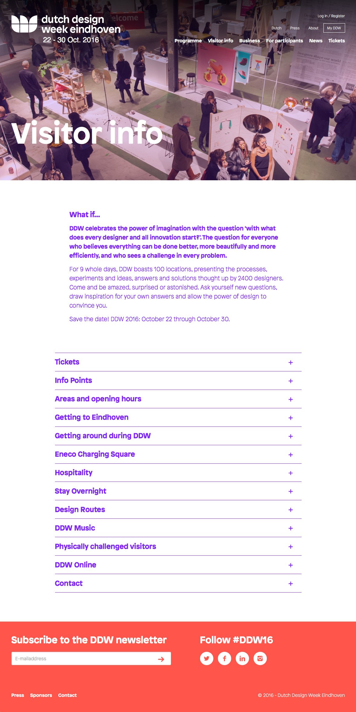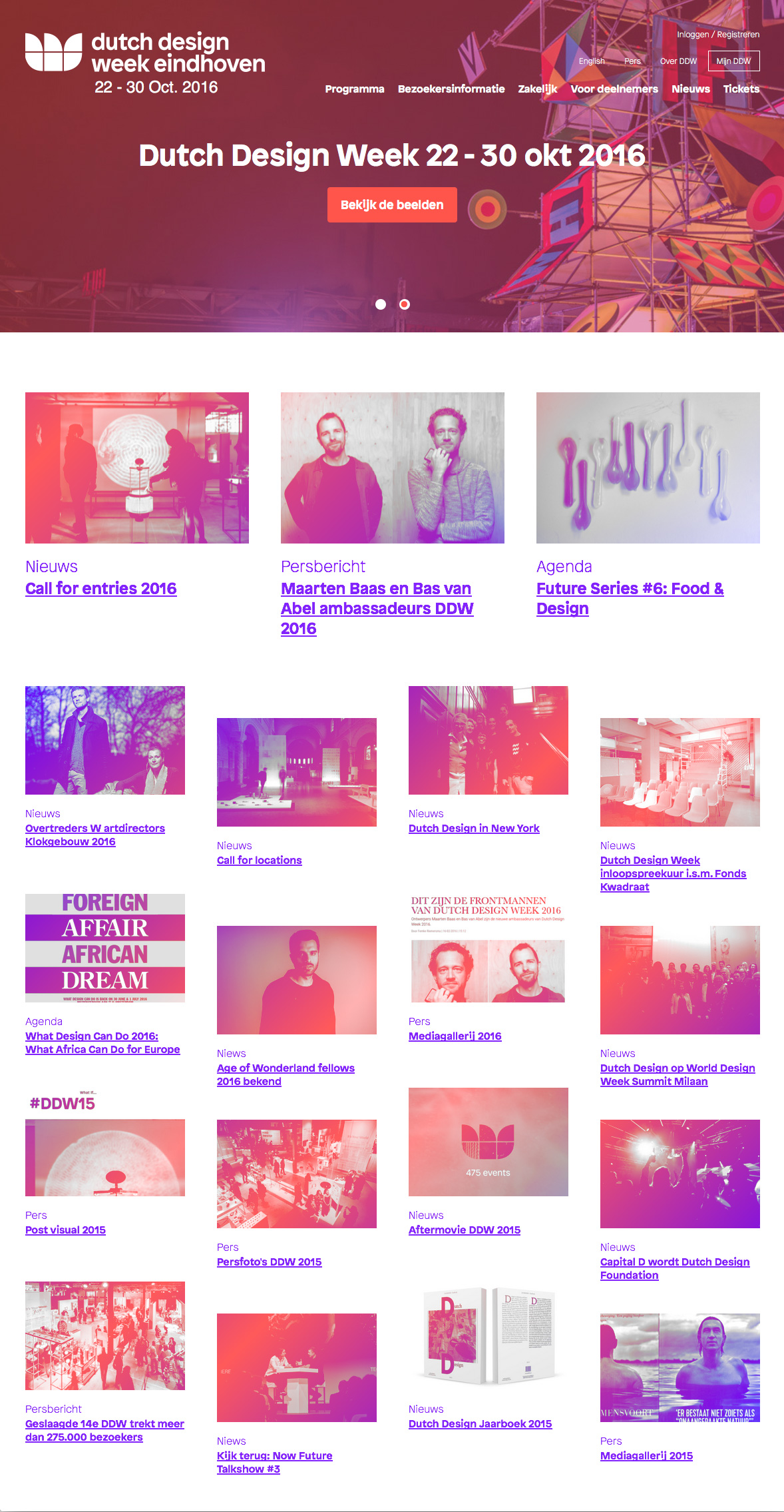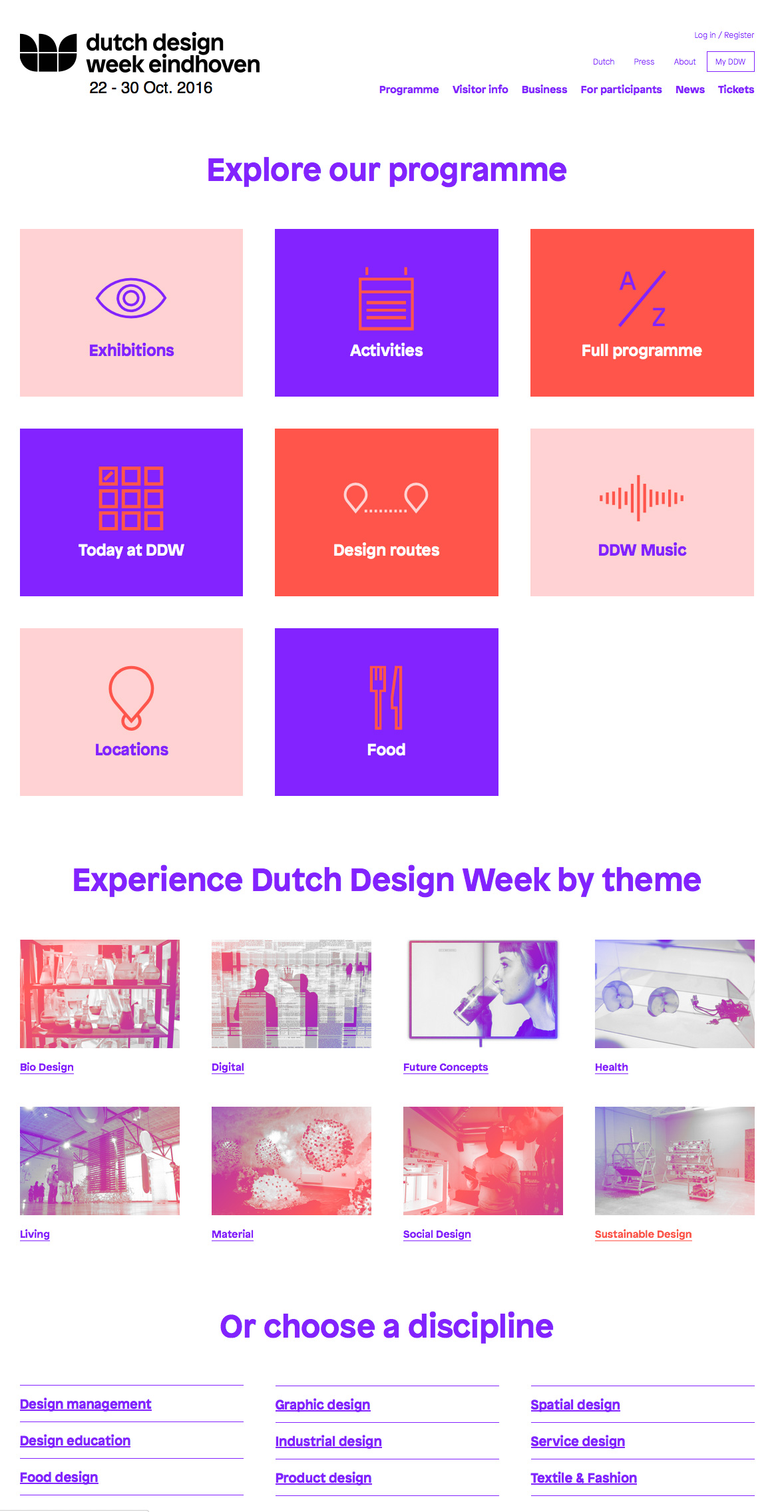 Dutch Design Week 2016 takes place from 22 to 30 October in Eindhoven, Netherlands. It presents the work and ideas of more than 2,400 designers to more than 250,000 visitors. The identity/campaign is designed by Fabrique, while the website is provided by Freshheads. Timo Gaessner’s Patron (Milieu Grotesque, 2014) is used across all media.