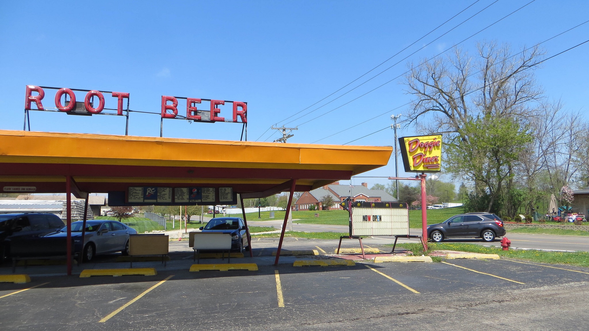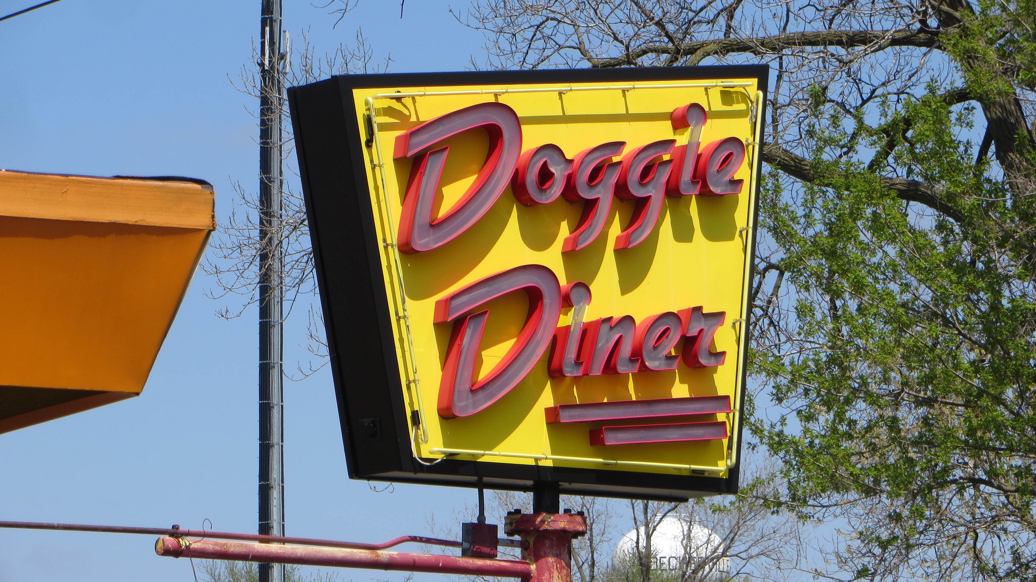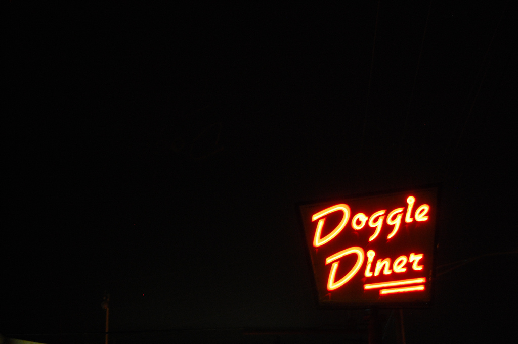 This Doggie Diner was originally the site of a Dog n Suds, a classic drive-in diner from the 1950s. The sign is fairly new, using the mid-century script Gillies Gothic to hearken back to that golden age of carhop culture. The Illinois-based Doggie Diners were established in 1986 and appear to be unrelated to the famous California chain of the same name that was active 1948–86.