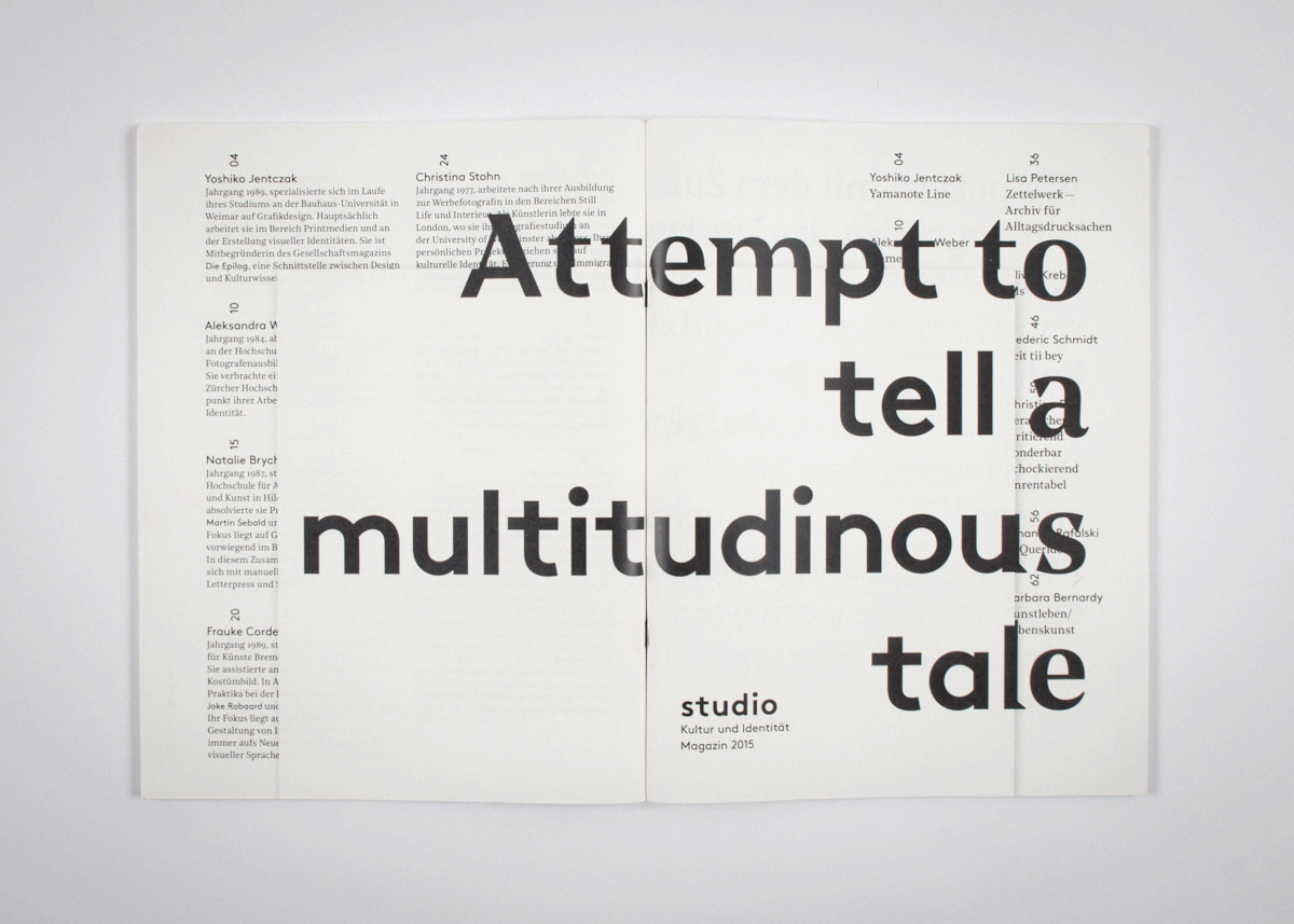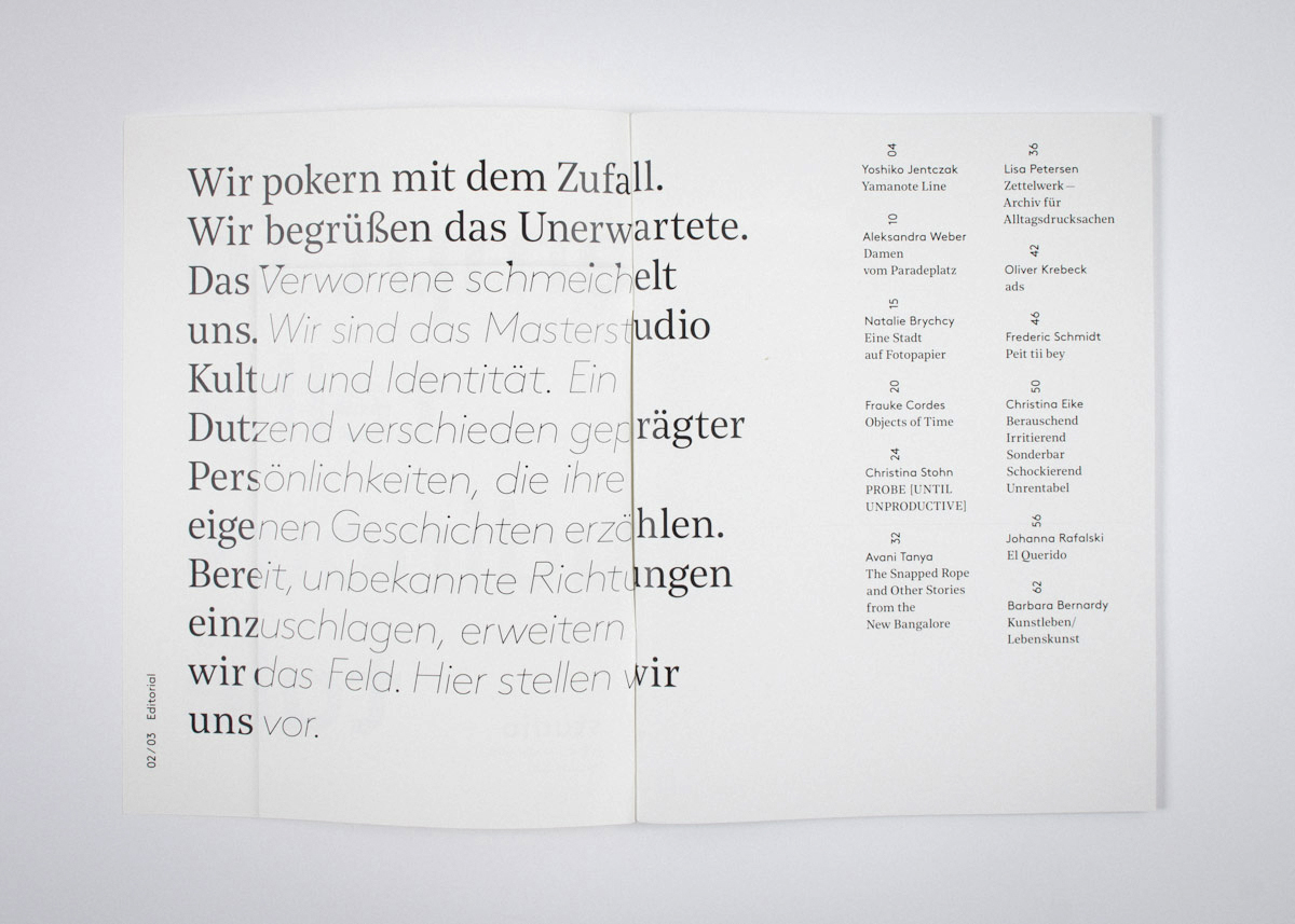 Twelve students of the Masters Studio “Culture and Identity” at the HfK Bremen introduce themselves in this magazine. They bid for coincidence and welcome the unexpected. The widely different personalities tell their own stories to henceforth wend their way together.