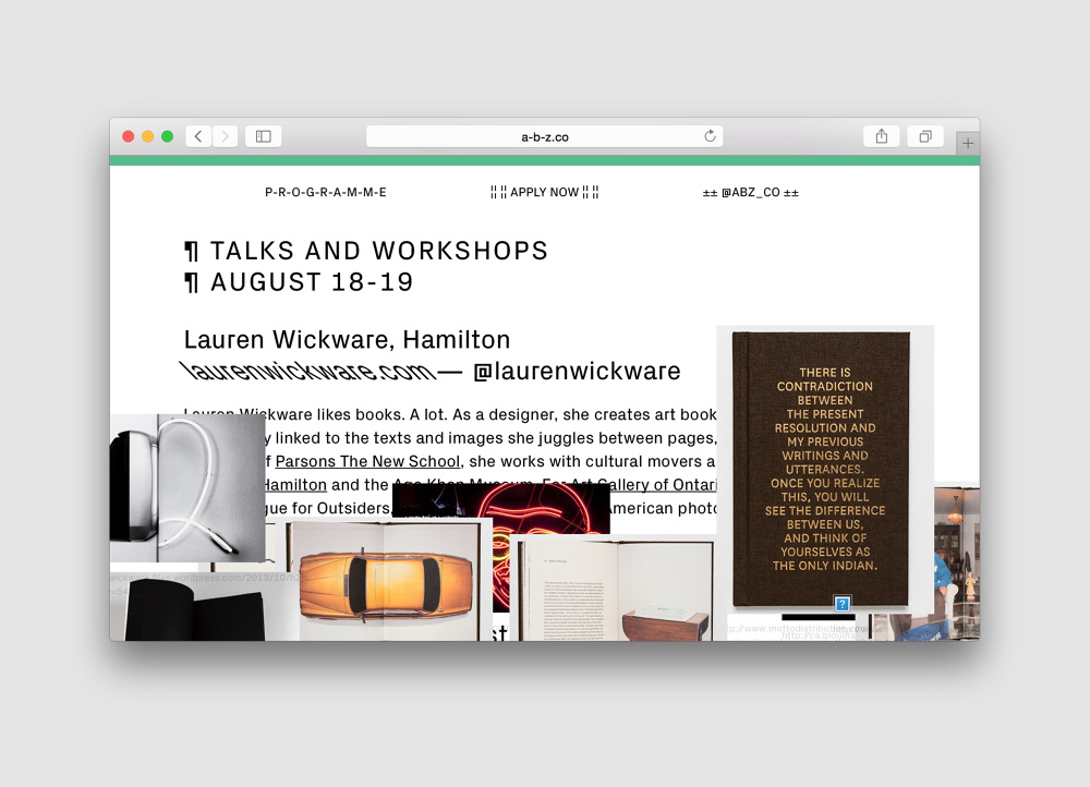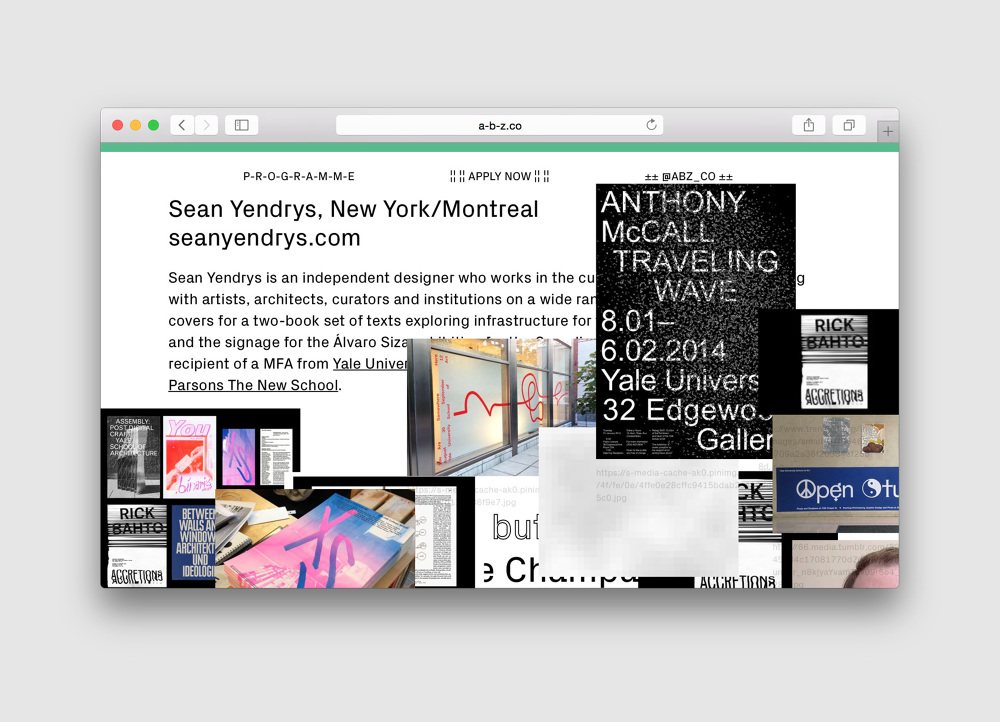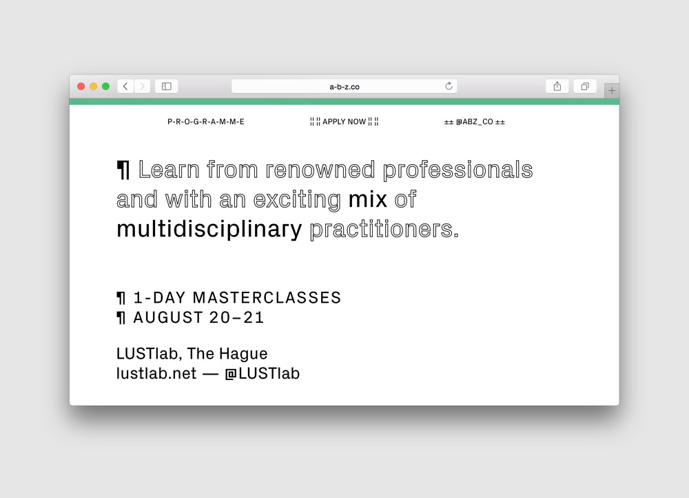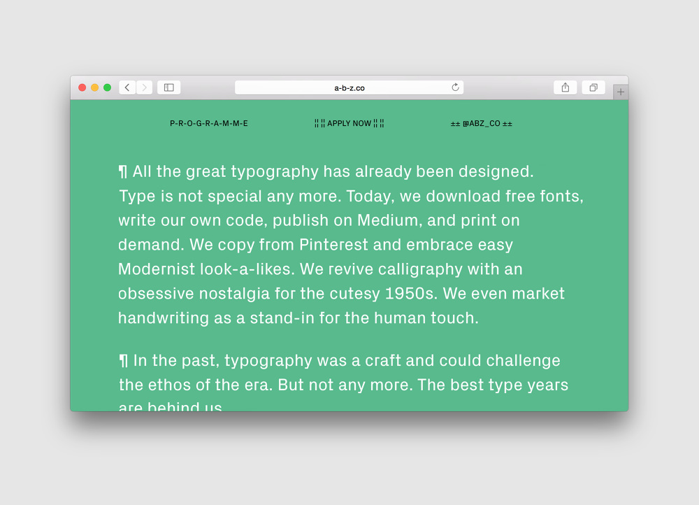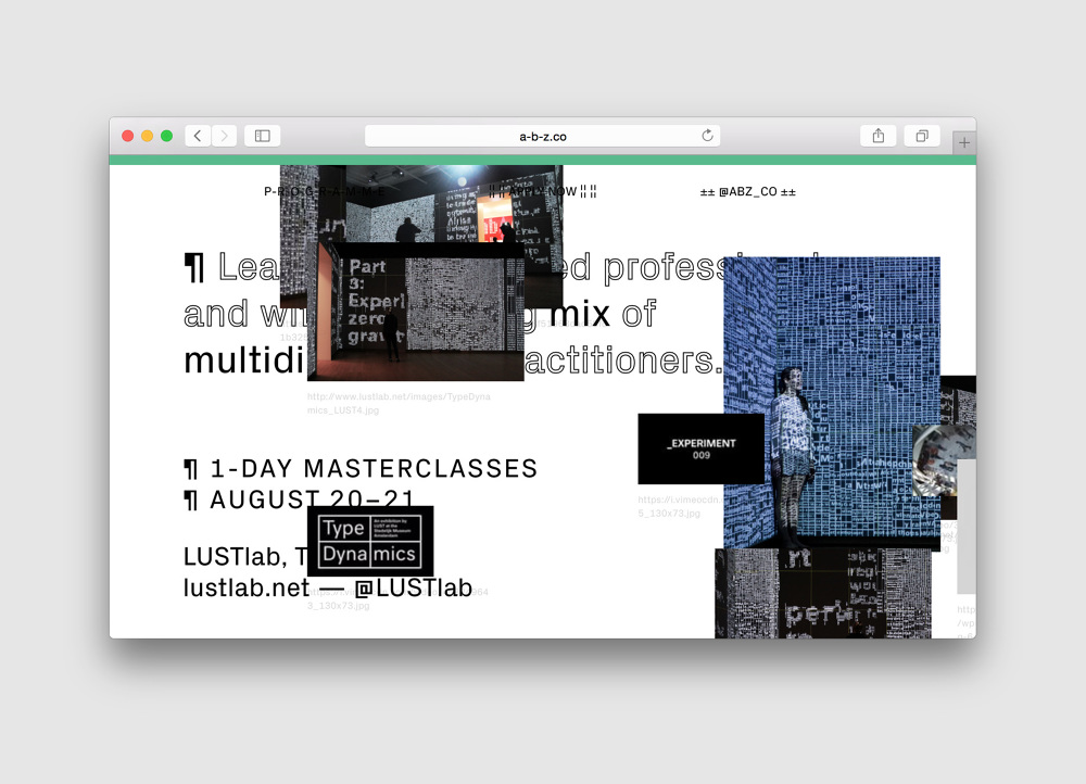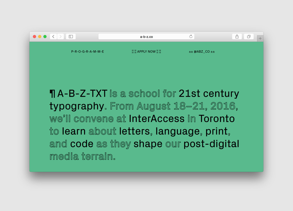 A-B-Z-TXT is a school for 21st century typography. Too often, typography is treated like a mere marketing tool or trend, and split between print or digital. A-B-Z-TXT will offer a hybrid alternative, with greater rigour and investigation. With Creativeapplications.net and InterAccess in Toronto, the school will offer hands-on masterclasses, workshops, lectures and group discussions. Leading practitioners will include LUSTlab from The Hague, N O R M A L S from Paris, Steph Davidson and Tracy Ma from Bloomberg Businesweek, Lauren Wickware from Hamilton, and yours truly.