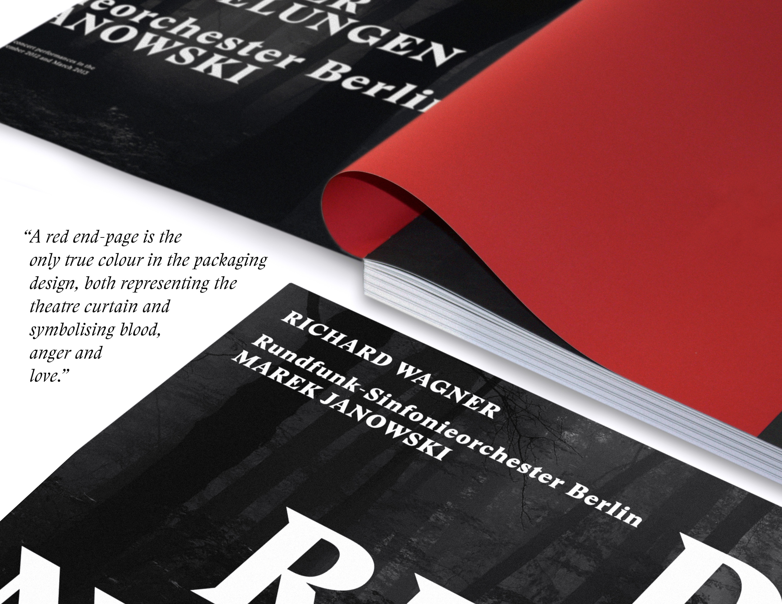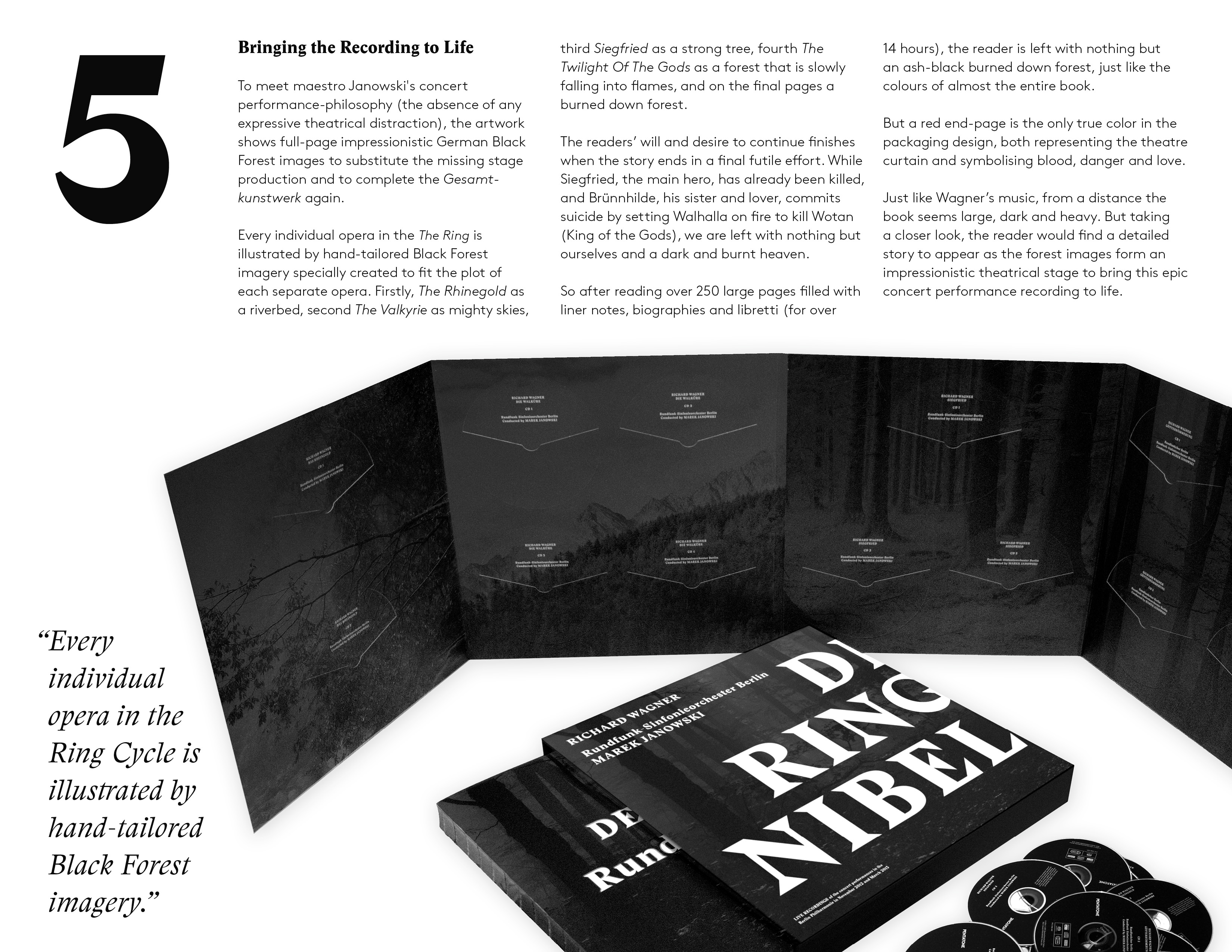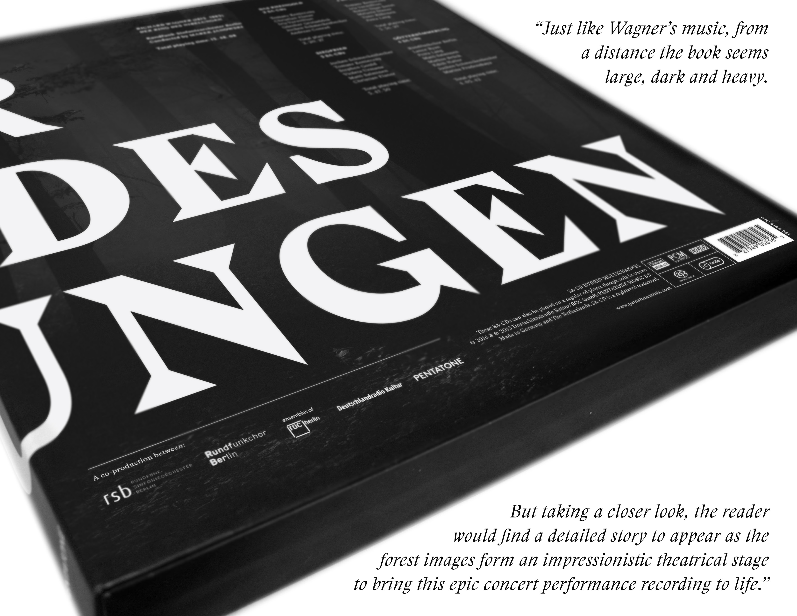 The way the album is designed, with its dark colours and large typography, is intended to give an added visual dimension to the epic music, representing in a way the missing “theatre” and completing Wagner’s Gesamtkunstwerk.