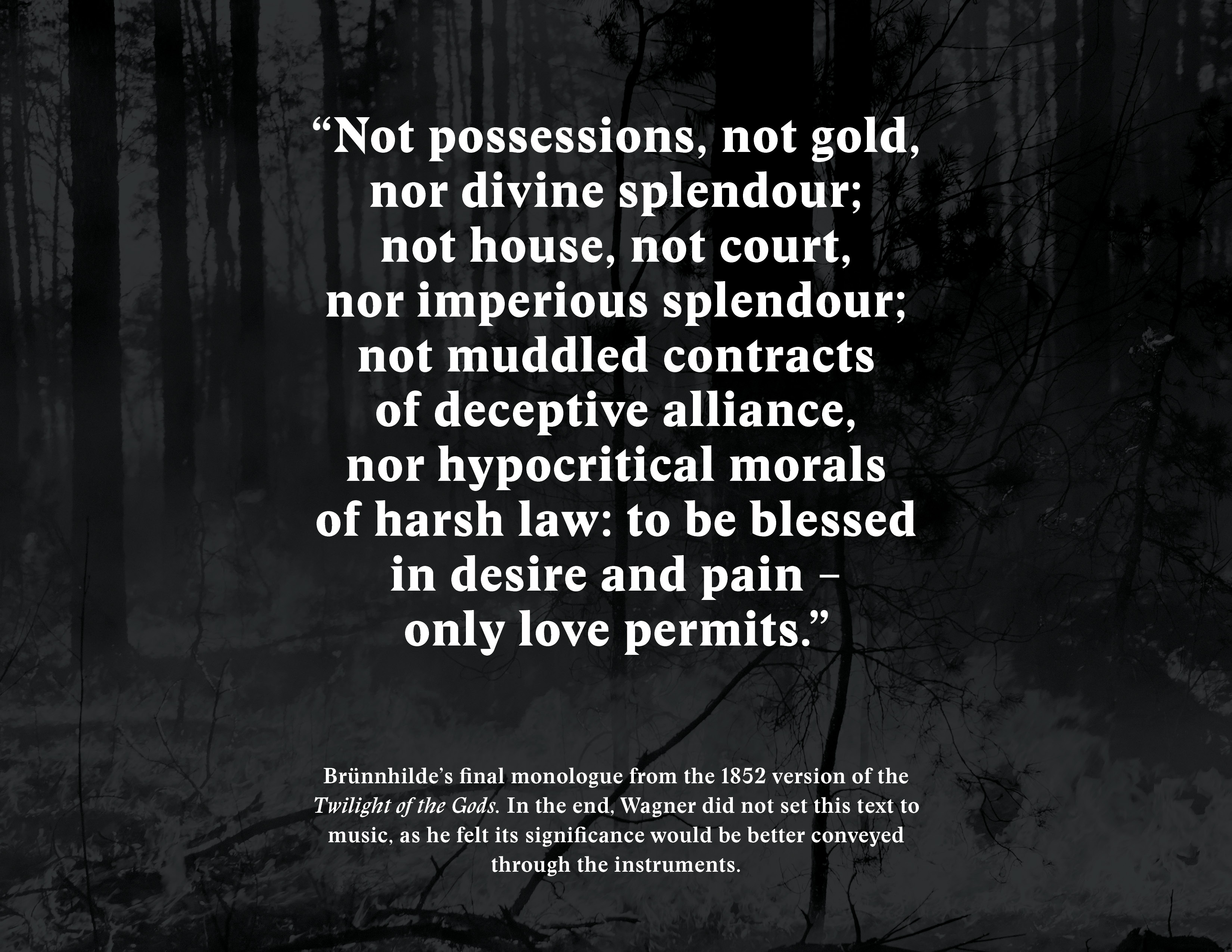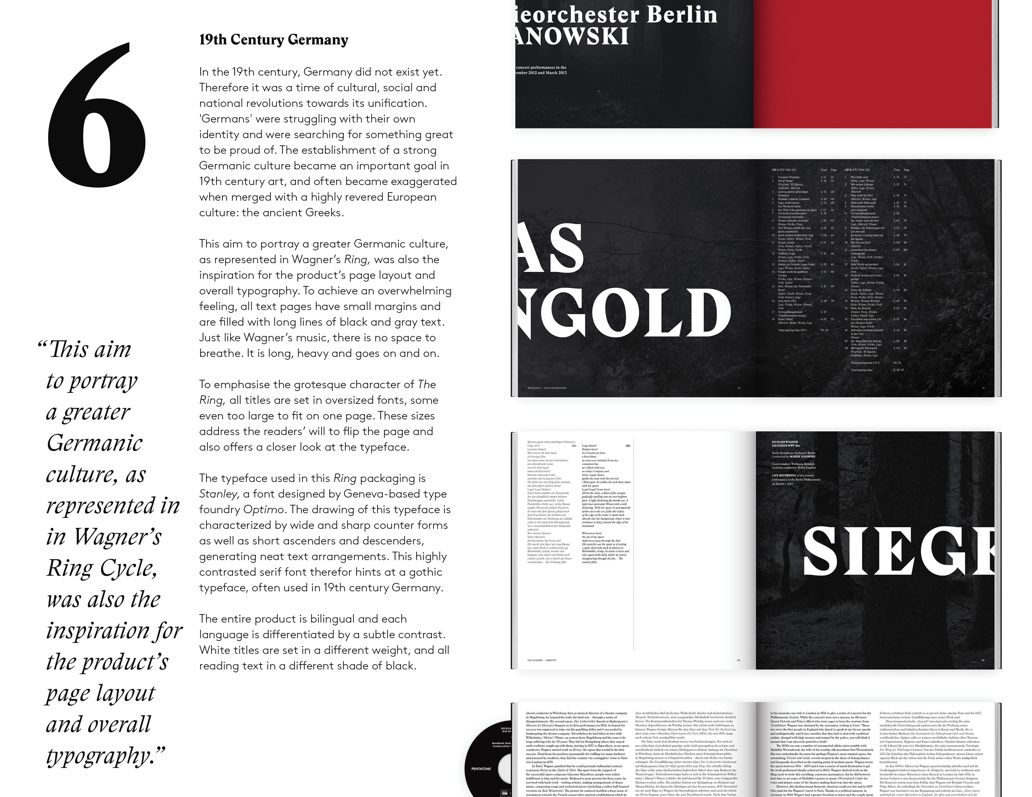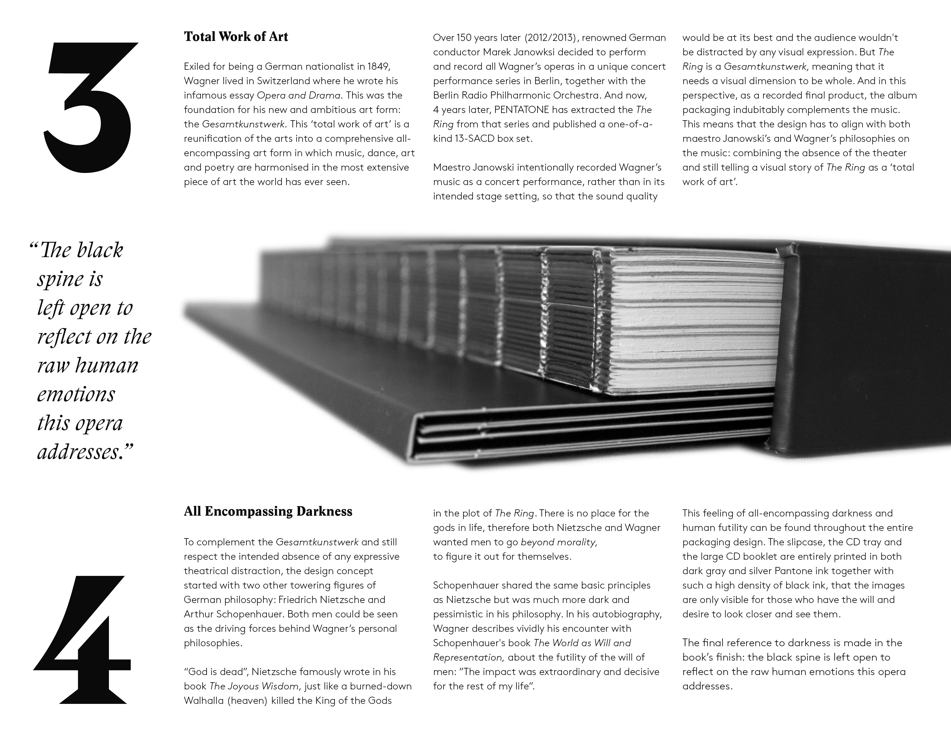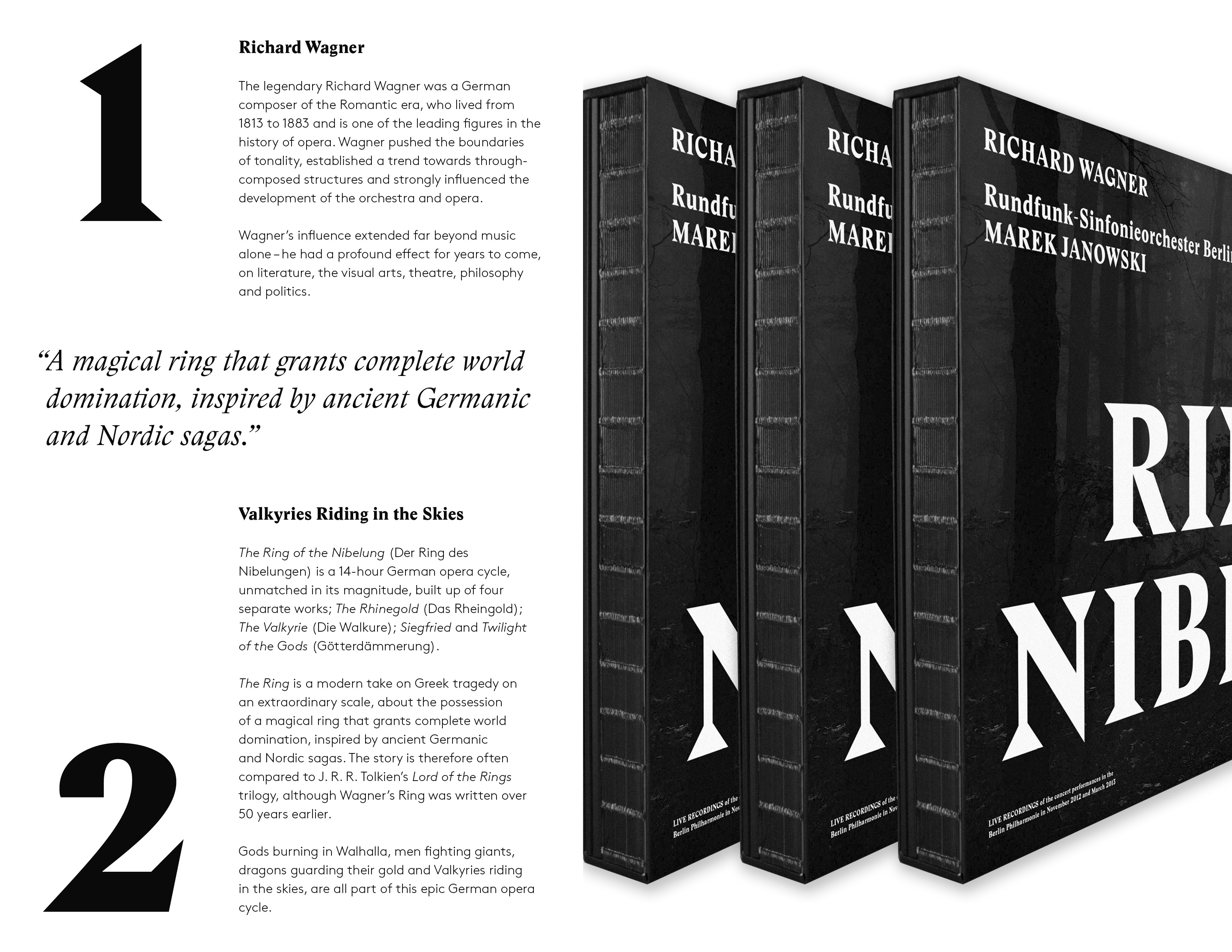 The way the album is designed, with its dark colours and large typography, is intended to give an added visual dimension to the epic music, representing in a way the missing “theatre” and completing Wagner’s Gesamtkunstwerk.