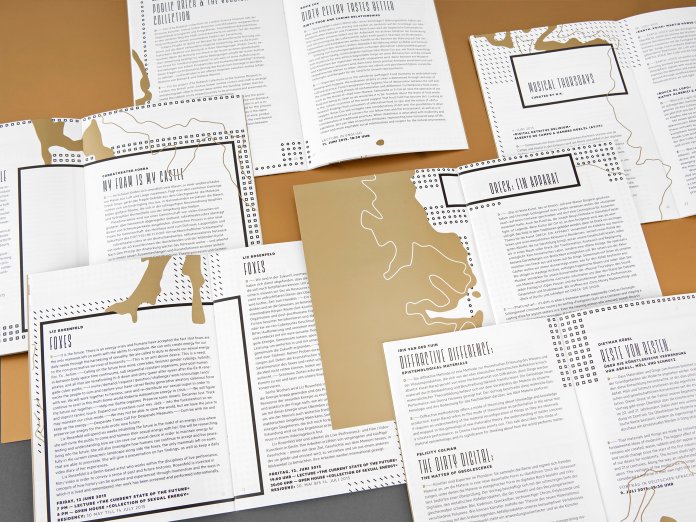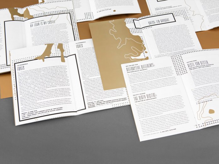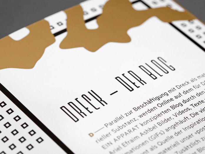 Dirt, waste, muck — it’s always there, surrounds us, it’s an everyday thing, be it problem or art. The project Dreck — ein Apparat (Dirt — an apparatus) deals with the most different perspectives of dirt. Food from bins, mudfighting, discussions about dirty topics. In the design of the programme booklet JAC has taken up the systemic aspect of dirt. Layers resembling geological drawings are found throughout the programme — systematic as circles, squares or crosses. But they are interrupted and pervaded by something that can be hidden in the earth, the waste, the dirt; a treasure. Designed in gold these structures form the opposite, the other perception, yet still a part of the system.