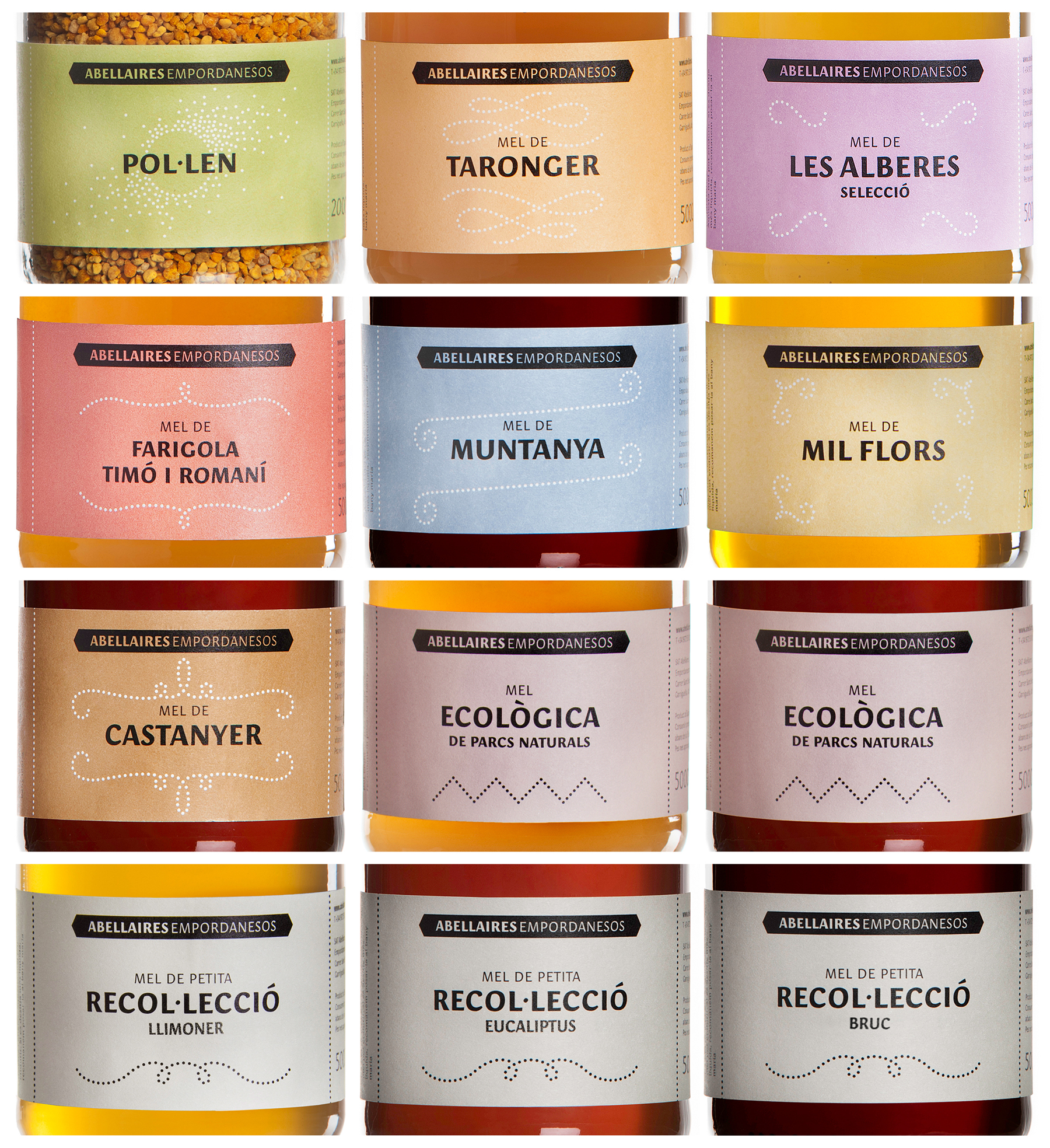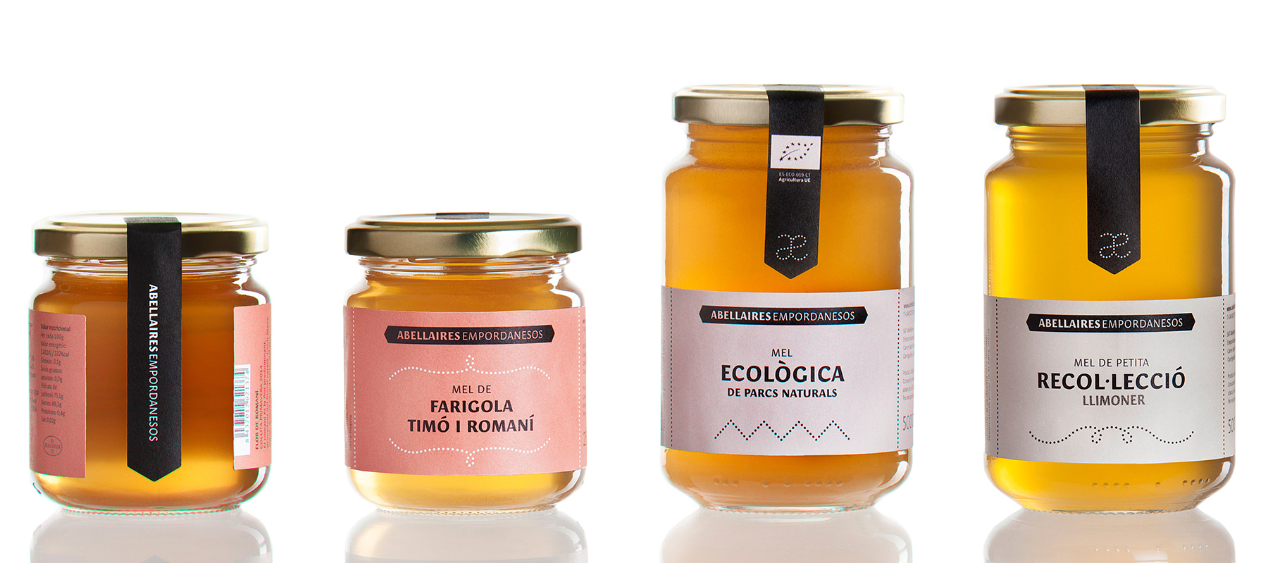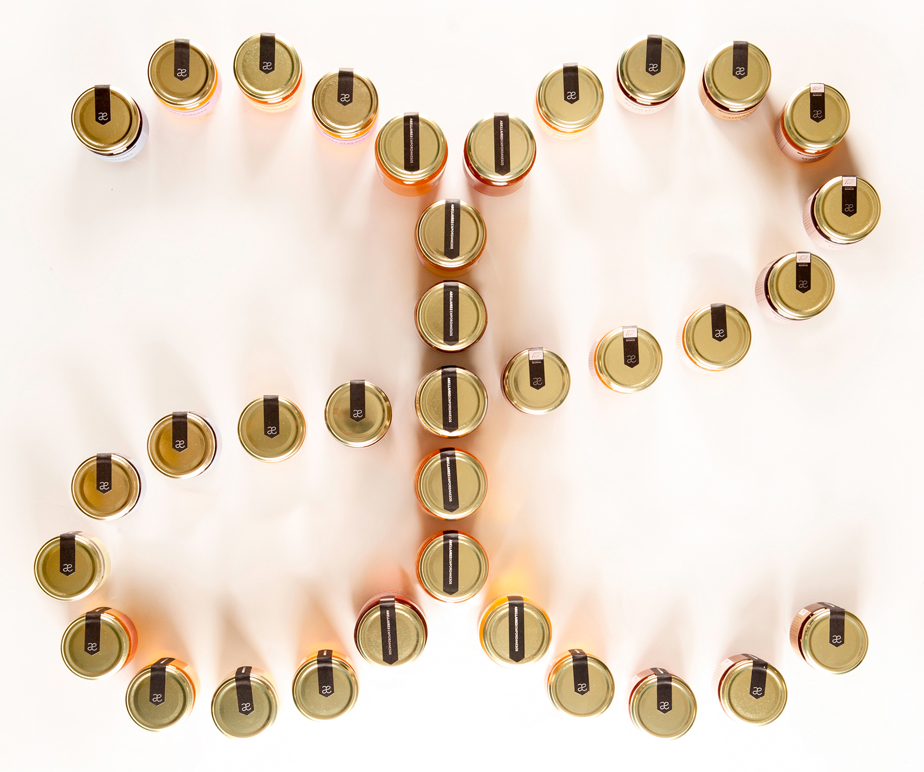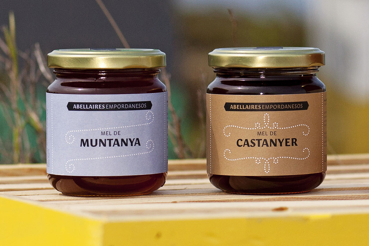 Their characteristic form of flight, in the form of the symbol for infinity (∞), now becomes a monogram with the initials of Abellaires Empordanesos (AE → ae → æ) — Empordanese Beekeepers. Transferring the same language to the packaging, filigrees and lines of points recall the coming and going of the flight of the bees.