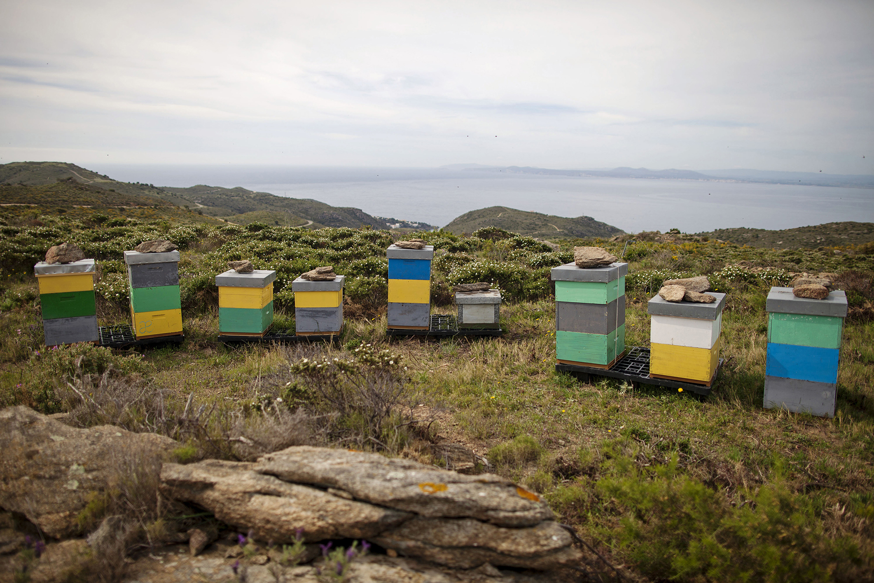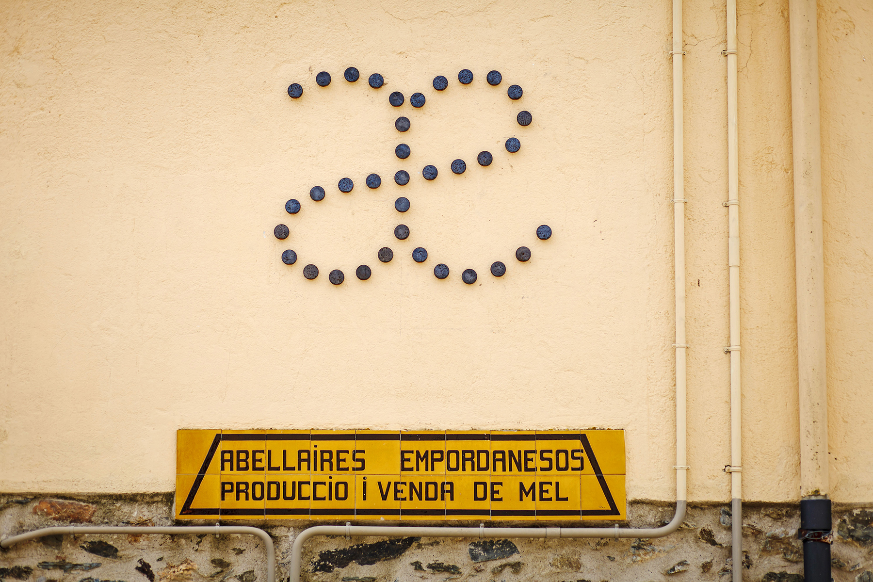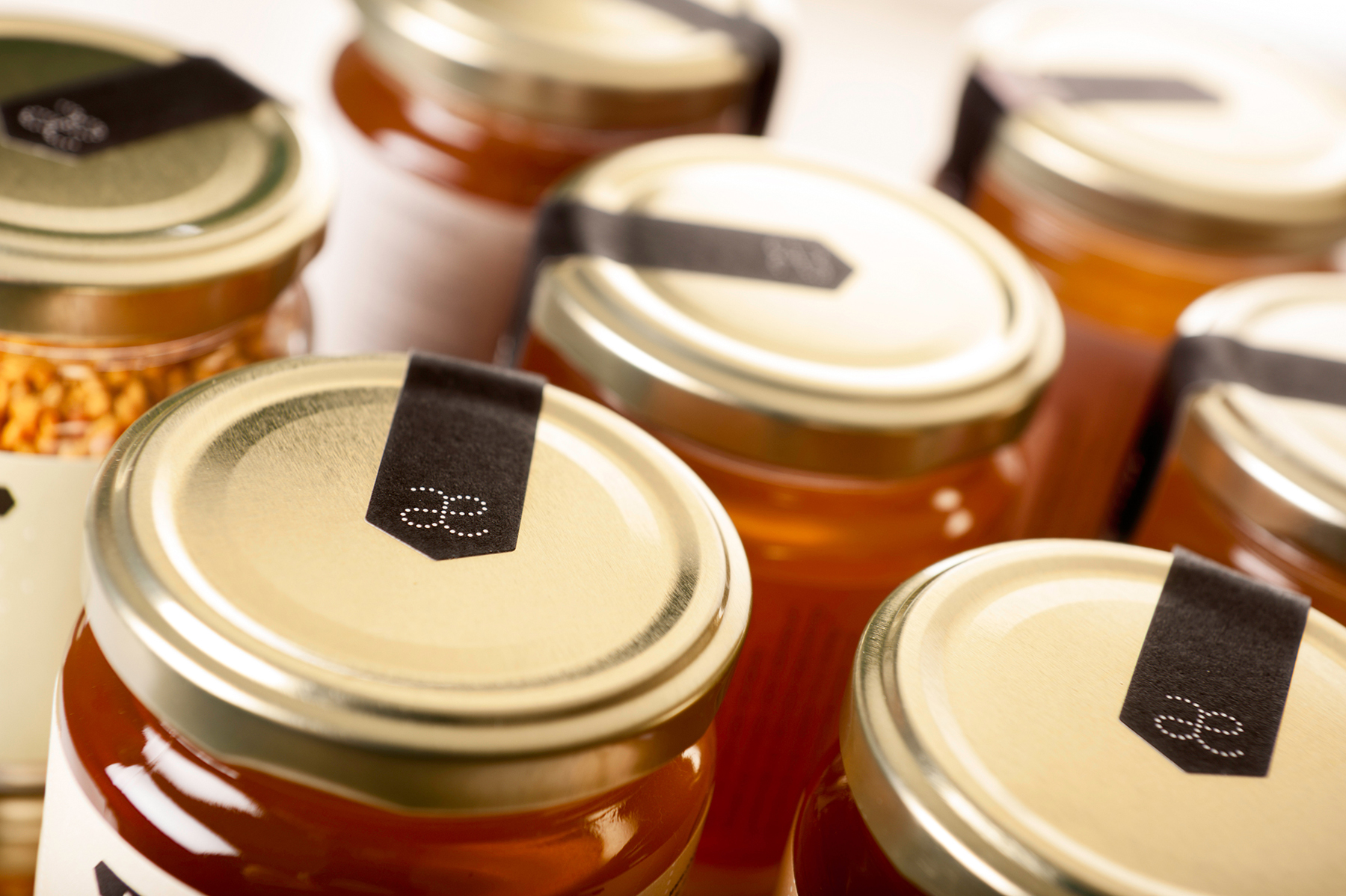Their characteristic form of flight, in the form of the symbol for infinity (∞), now becomes a monogram with the initials of Abellaires Empordanesos (AE → ae → æ) — Empordanese Beekeepers. Transferring the same language to the packaging, filigrees and lines of points recall the coming and going of the flight of the bees.