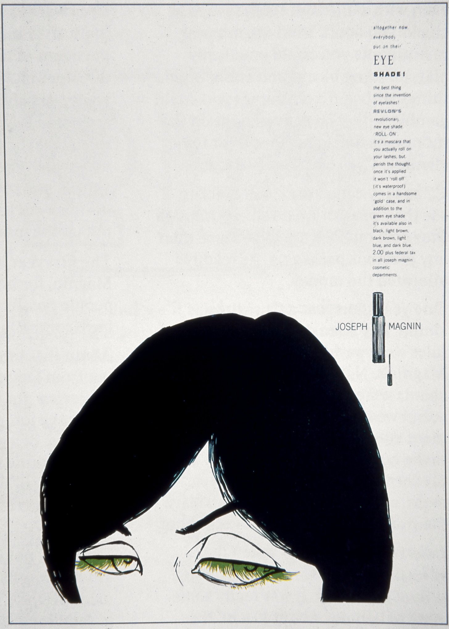 Designed by Margret Larsen, art director at the Joseph Magnin department store in the late 1950s to early ’60s. The illustration is by Betty Brader and depicts Larsen herself. (See a photo that seems the likely source image.)