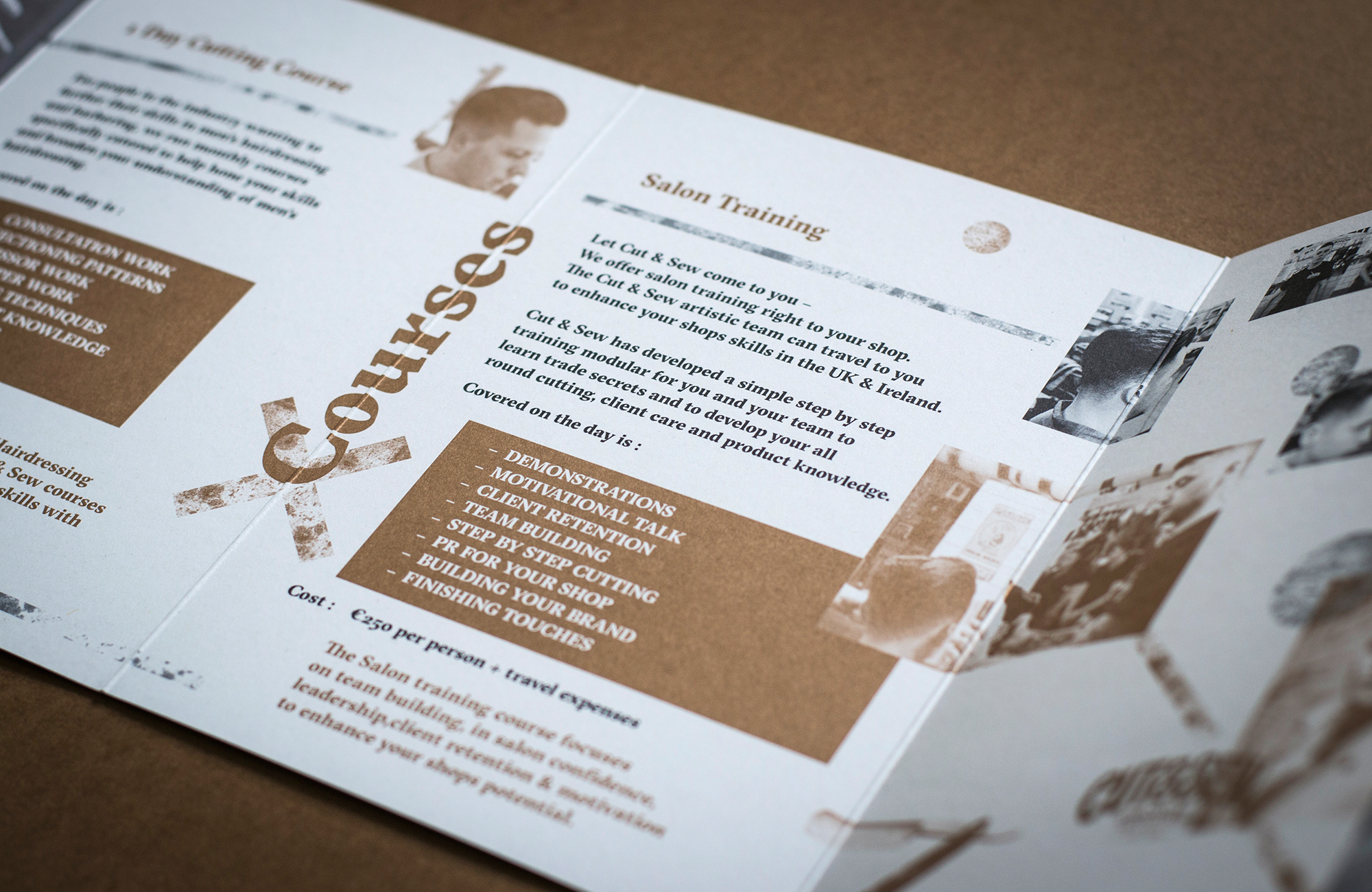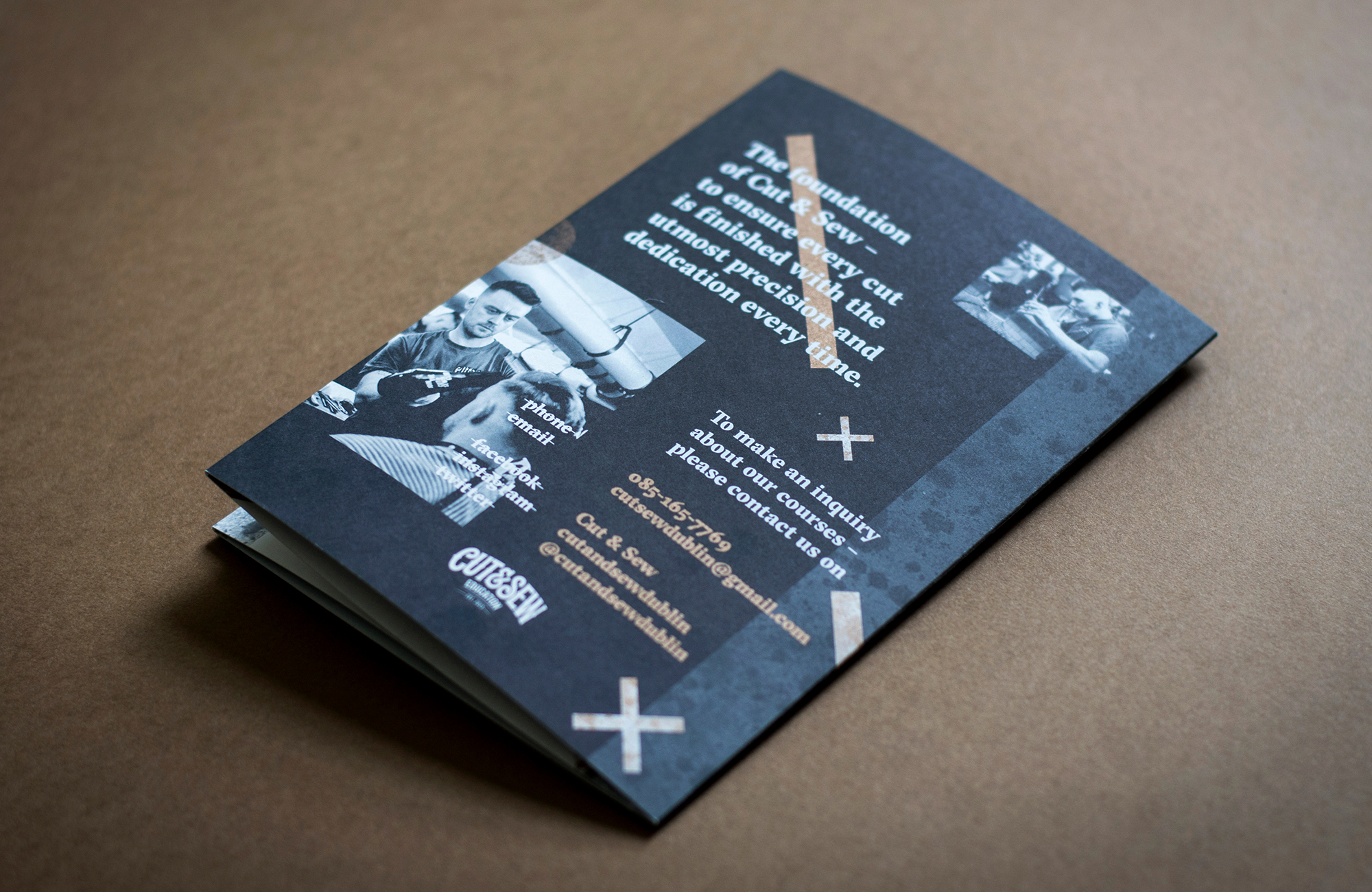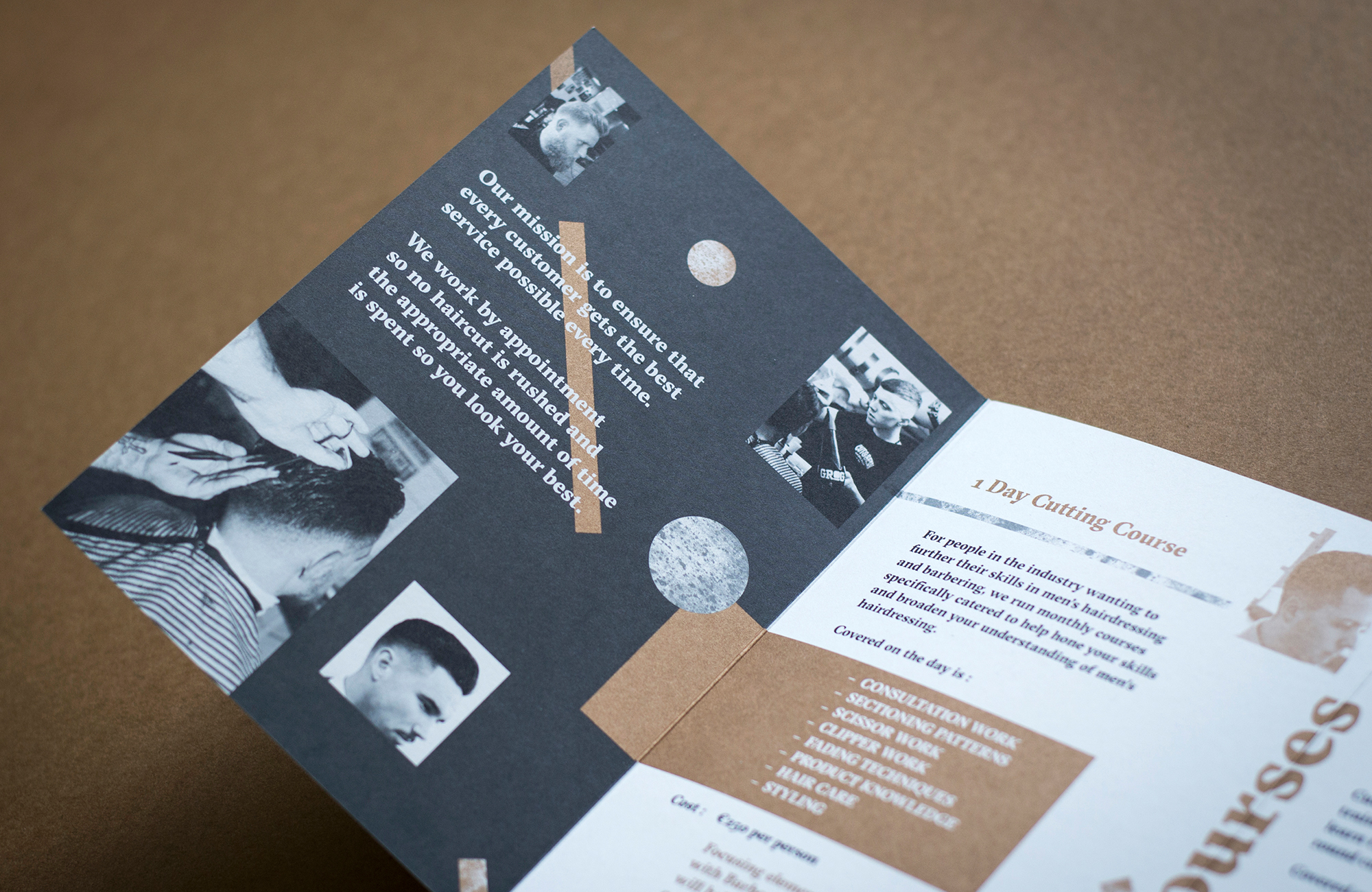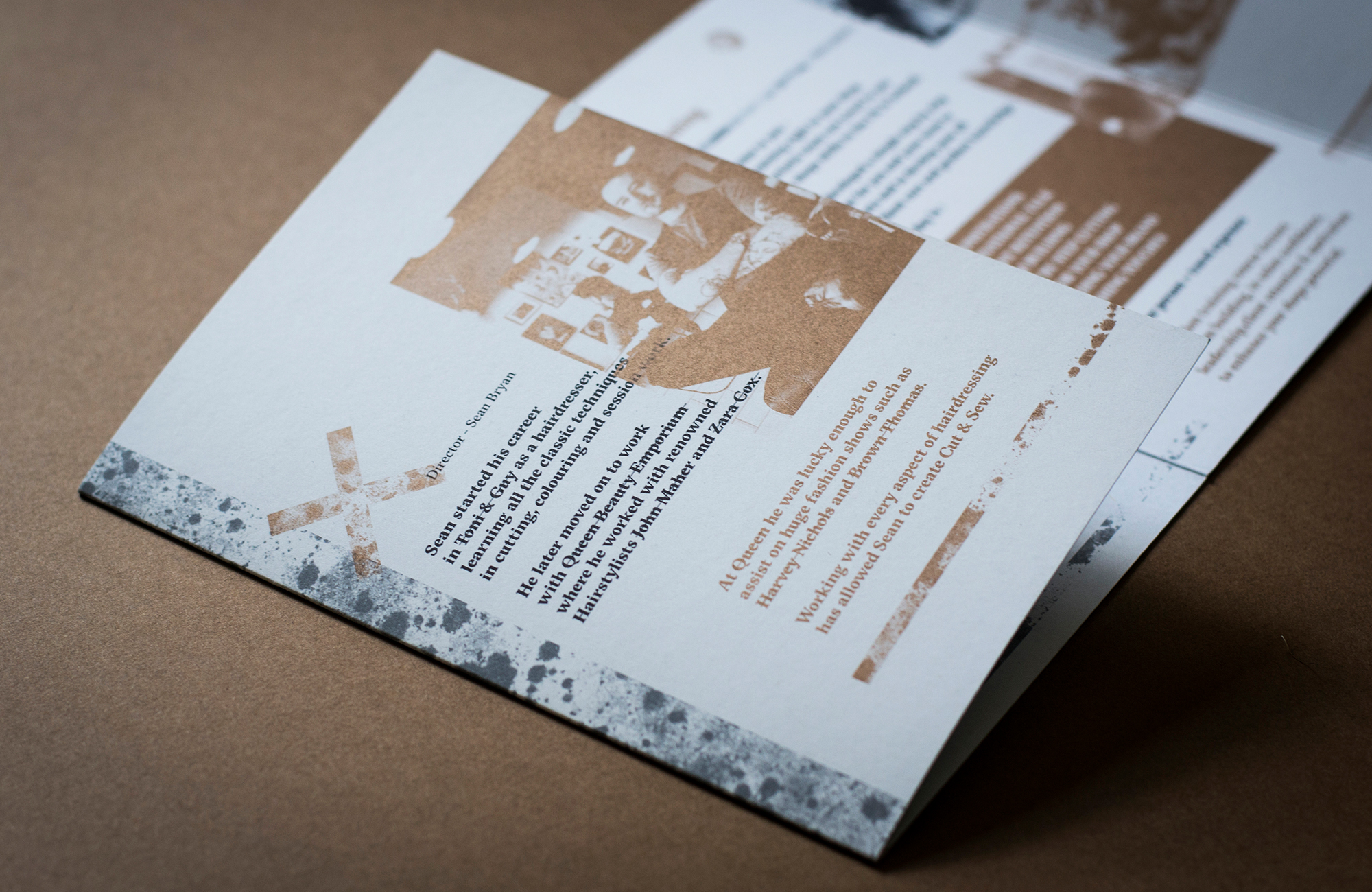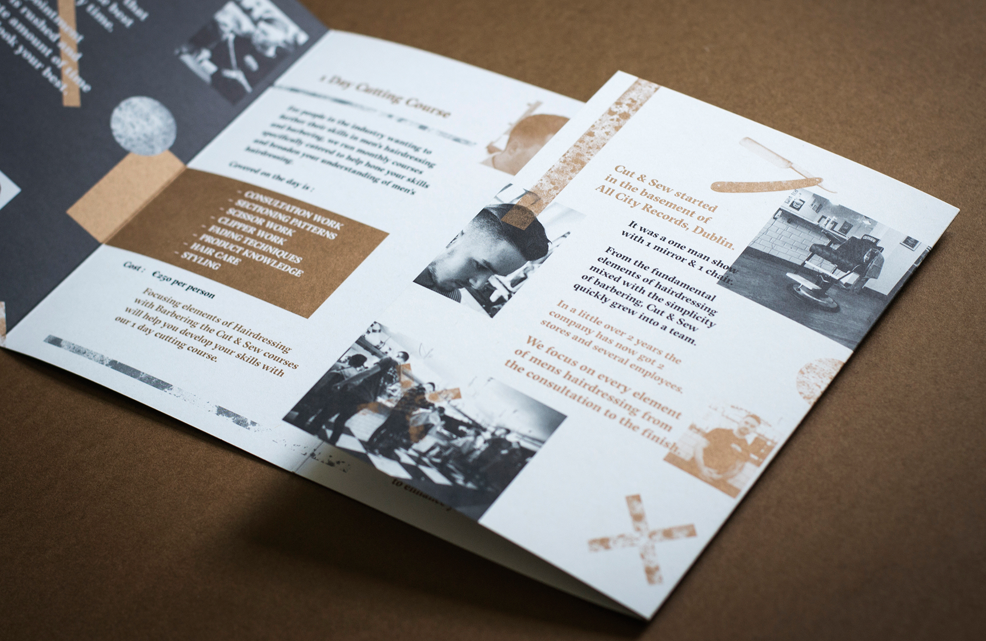 Brochure and artwork concept and design for Ireland’s premium barbers, Cut&Sew in Dublin. B6 Double gatefold brochure with spot copper metallic ink and grey. Expertly handled by Plus Print.
