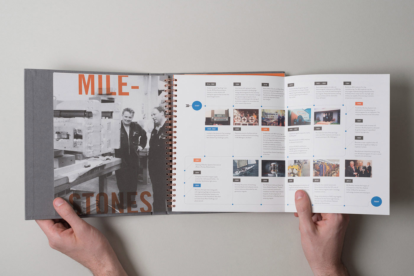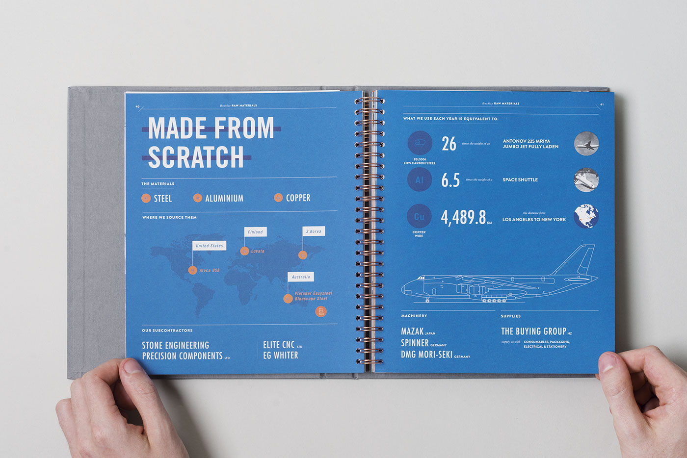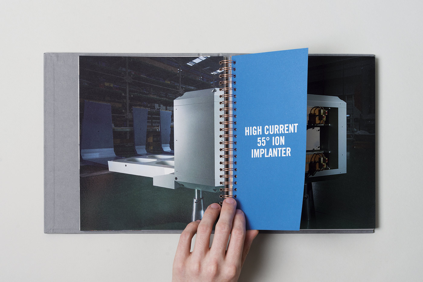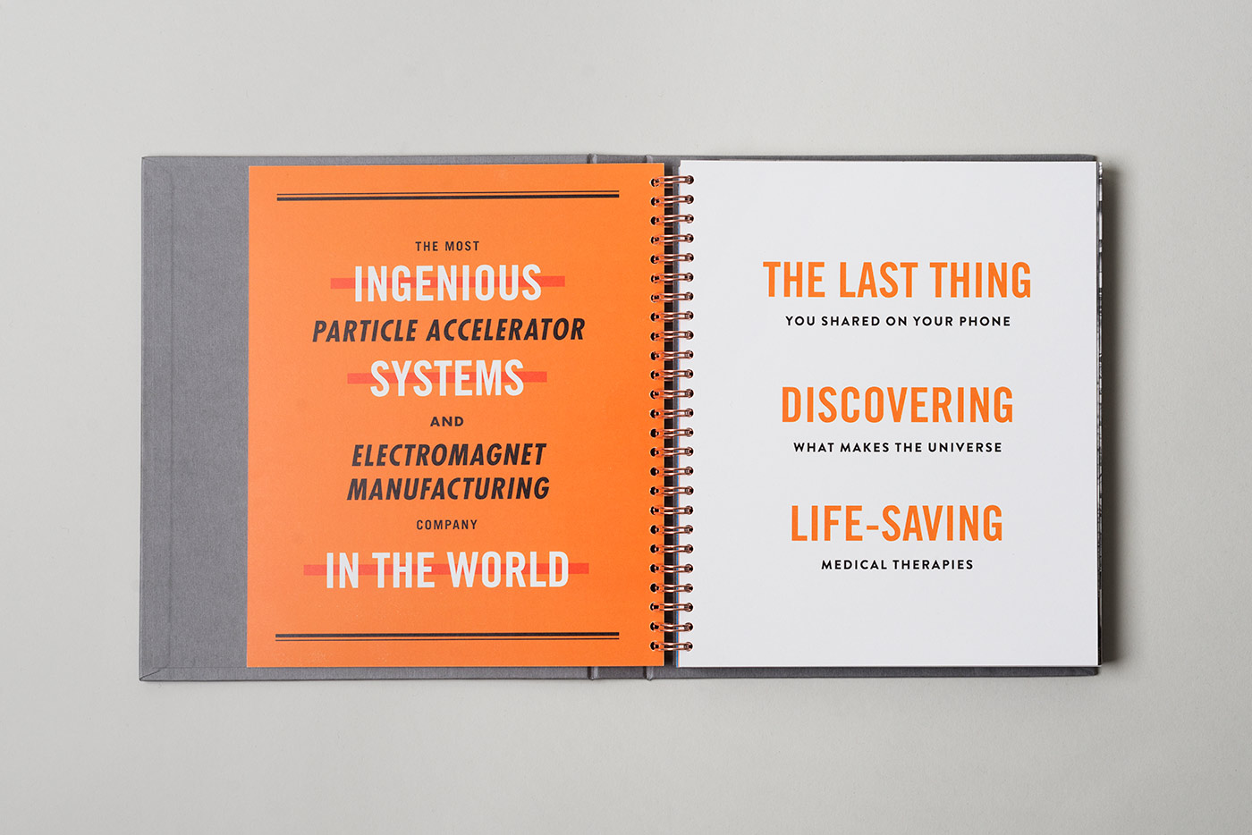 Blending a vintage aesthetic with the bold, contemporary visual identity gives the brand a unique internal visual language that reflects the contrast between the raw heavy engineering workshops and the clean, precision finishing of their highly technical electromagnets. Wire binding electroplated in copper and a textured hardcover with foiled detailing echo the materials used in electromagnet production and give the book a tactile quality.